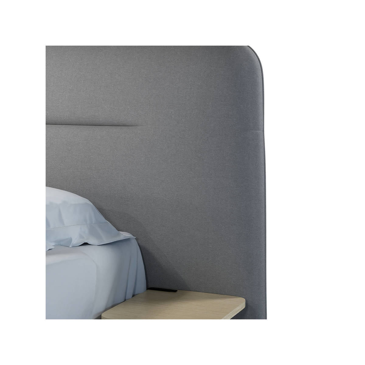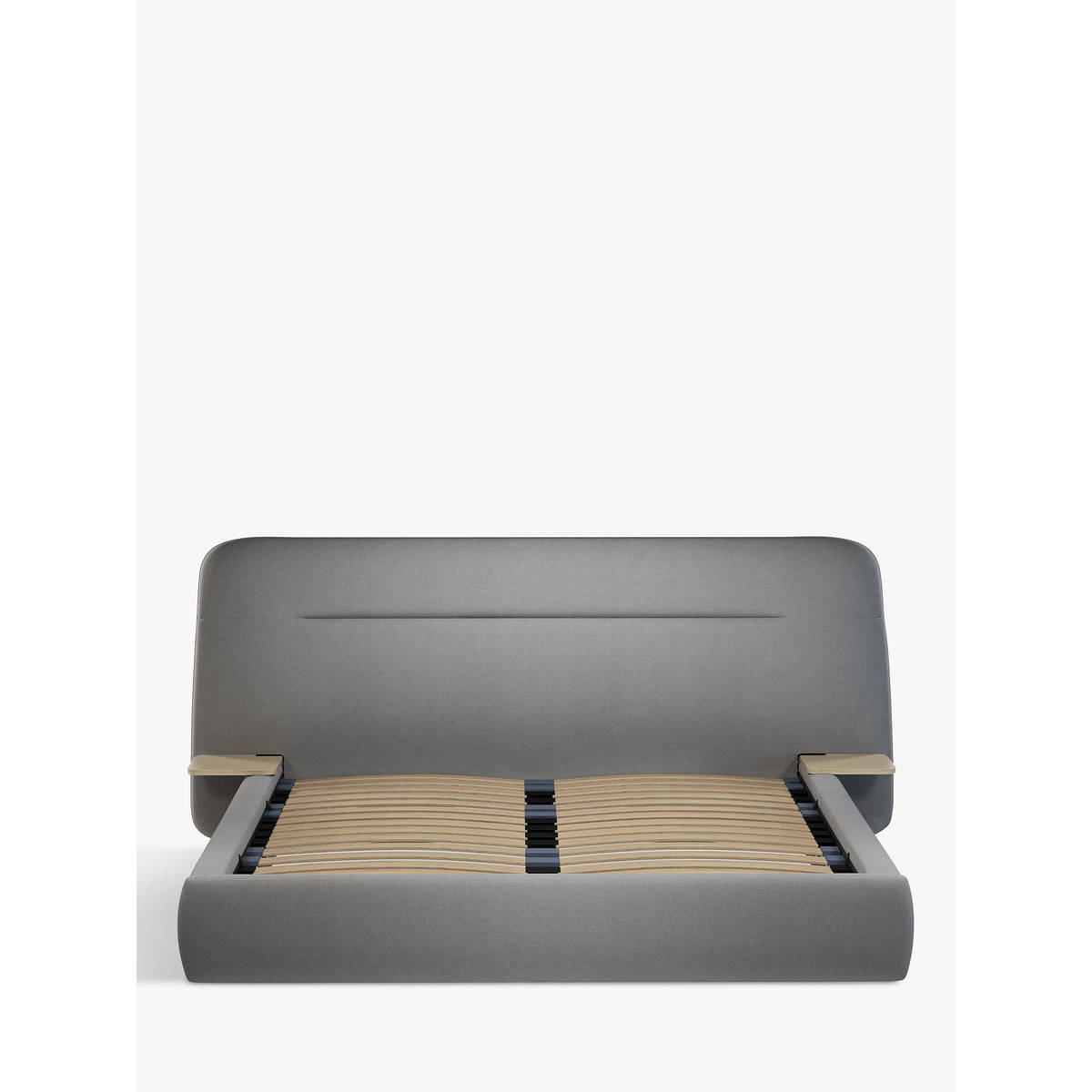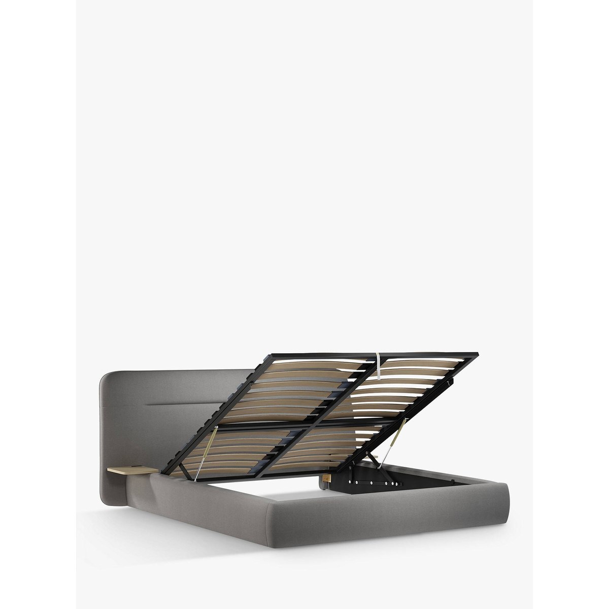 The No.152 ottoman storage bed frame fuses function with style, offering generous storage space in its base so that you can keep your bedroom clutter free. Integrated wooden side tables are suspended neatly on either side of the frame. Ideal for rooms where space is tight, a handle and hydraulic arms facilitate an easy manual lift-up and sprung slats offer additional support for you and your mattress. Smart Slats This bed frame is designed with wider slats at the shoulders, lumbar and feet, that provide maximum support for your mattress so that you experience perfect spinal alignment while you sleep. Standard slat caps are black so we have added grey slat caps to ensure that you know where to place the wider slats.