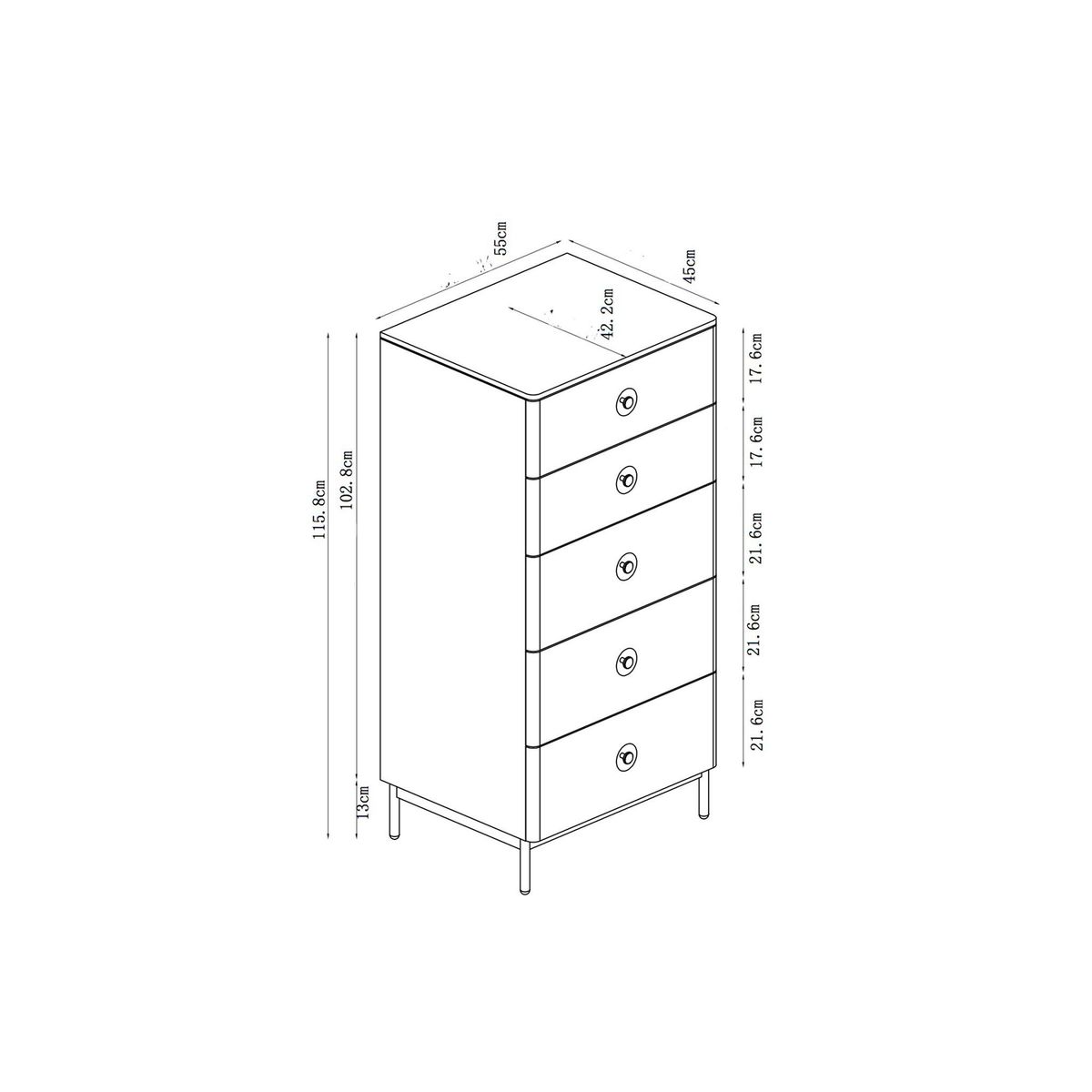 Made predominantly from solid oak for a durable and visually striking finish, this No.185. chest of drawers provides generous storage space. Ideal for smaller spaces, its five drawers glide open on wooden runners with petite metal knob handles in a bronze finish. Its softly curved, narrow profile highlights the appealing natural wood grain in a modern, yet timeless design.