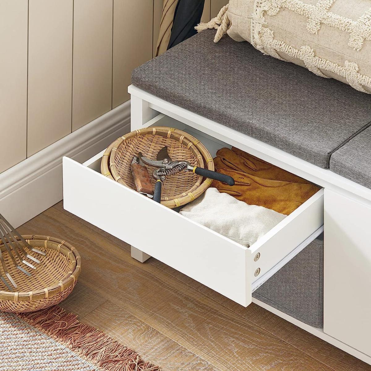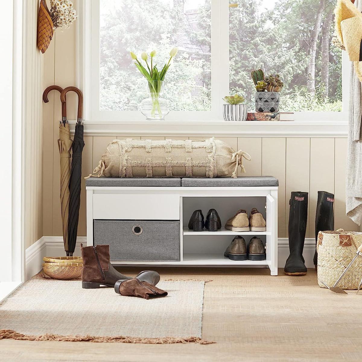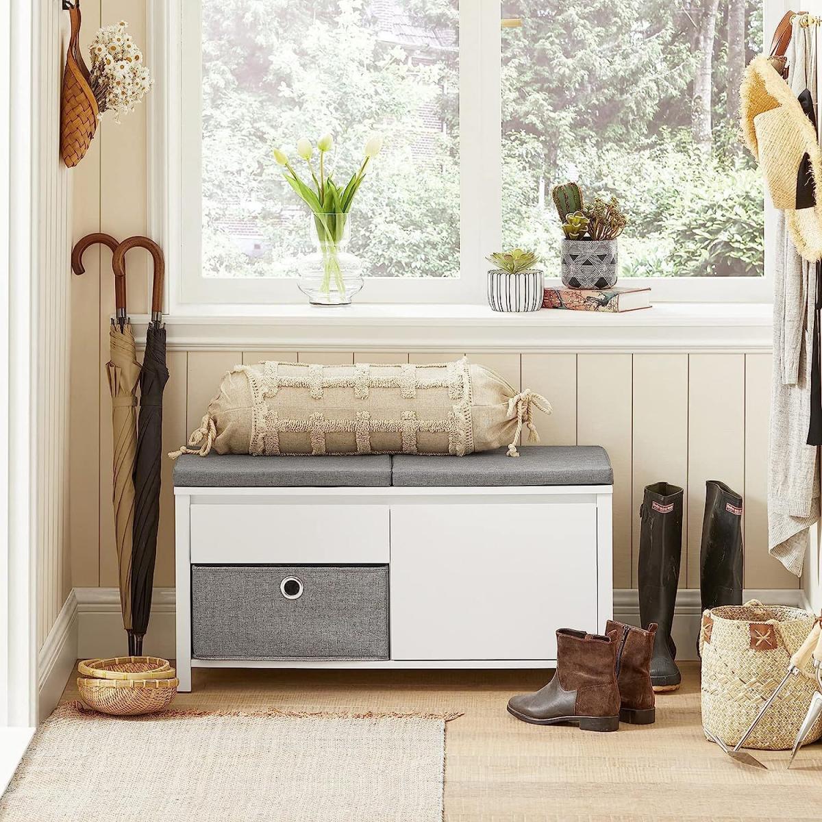 Modern design shoe cabinet storage bench is a good choice for hallway, living room, bedroom, etc. The padded seat which is removable is ideal for comfortable sitting while putting on and taking off shoes. It features a drawer, a fabric basket and a cabinet with internal adjustable shelf, providing ample storage space for you. The shelf in the cabinet is adjustable in three heights. You can adjust the height to meet your needs or simply remove the shelf. Tidies up your hallway or porch nicely hiding all your shoes and the other items! Modern design, the storage cabinet will blend perfectly with your modern or traditional decor.