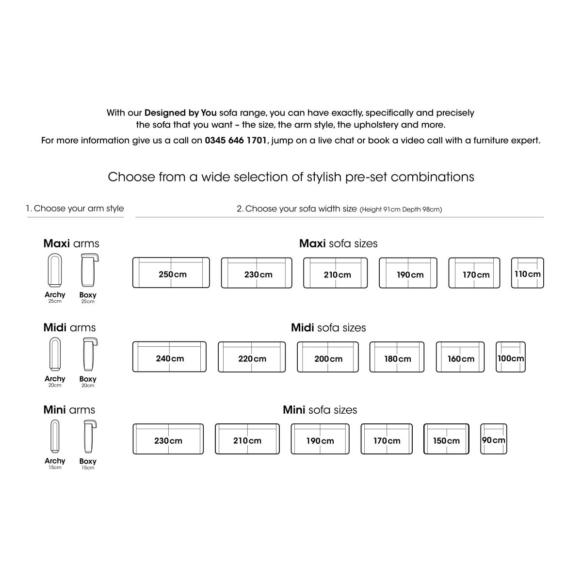 With our Designed by You sofa collection, you can have exactly, specifically and precisely the sofa that you want. Sofas are sized in 10 cm increments from a compact 150 cm to a generous 250 cm, and almost everything in between. The range’s two arm styles – elegantly curved Archy and contemporary wrap-over Boxy – are offered in three different widths, and every piece in the collection comes in a wide choice of soft and textured fabrics. And with the addition of customised chairs, accent chairs and footstools, it’s so easy to bring home a bespoke, beautiful and sociable sofa set up. The Designed by You sofa collection is exclusively available at Furniture Village. This large 250 cm sofa with wide Boxy arms is just one way you can combine different elements – sofa size, arm style, arm width and more – to create your perfect bespoke sofa with our Designed by You range. Why you'll love it There are so many ways your next sofa can be Designed by You. This contemporary 250 cm sofa is just one example. On-trend wide Boxy arms with magnetic arm cushions that stay in place. Arm cushions are removable for a different look. Sprung seats for superb support across the entire sofa. Super comfy seat cushions with sustainable foam filling. In a huge choice of fashionable soft and textured upholstery fabrics. Light or dark solid wood feet. Exclusively available at Furniture Village. This 250 cm 4-seater sofa is part of our Designed by You range. Want something different? We’ll help you precisely customise your sofa’s size, arm style, arm width and more. What you need to know Medium comfort level. Seat suspension: zig-zag springs. Seat cushioning: foam with quilted fibre wrap. Cushioning is reversible. Back support: webbing. Back cushioning: fibre. Cushioning is reversible. Feet are removable. Some fabrics can show wear on areas of more use or in direct sunlight. Flattening and shading of heavy wear areas on pile fabrics is unavoidable. Clean regularly using a soft brush or vacuum with the curtain attachment. Deal with any spills promptly. Professional cleaning advised for oil- and grease-based stains. Please read our upholstery care guide for more advice. Item code: BOXY25MXFAB-033