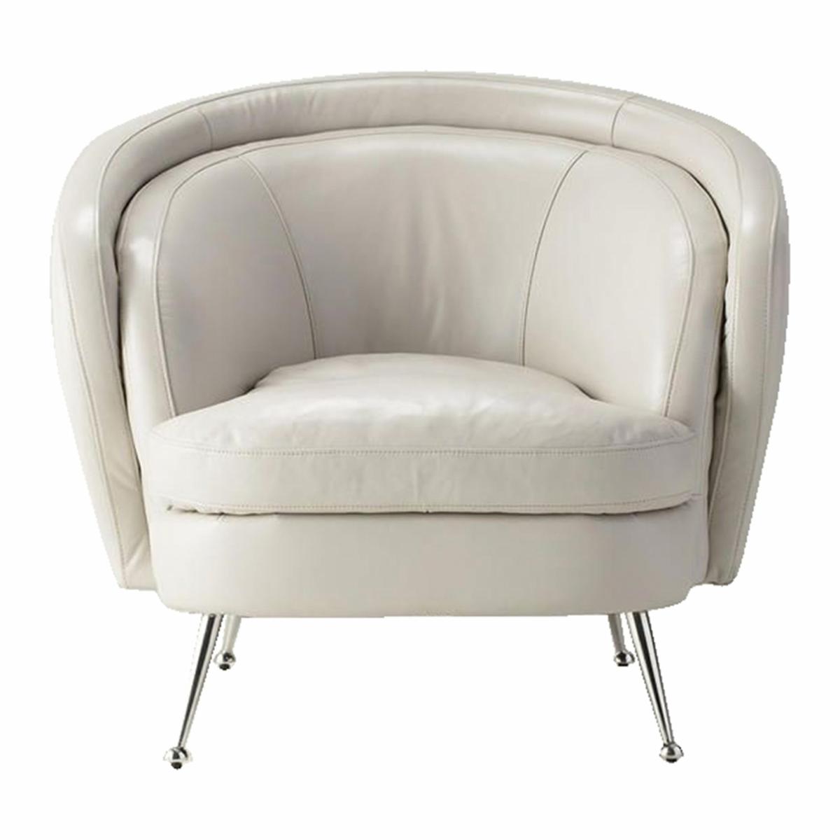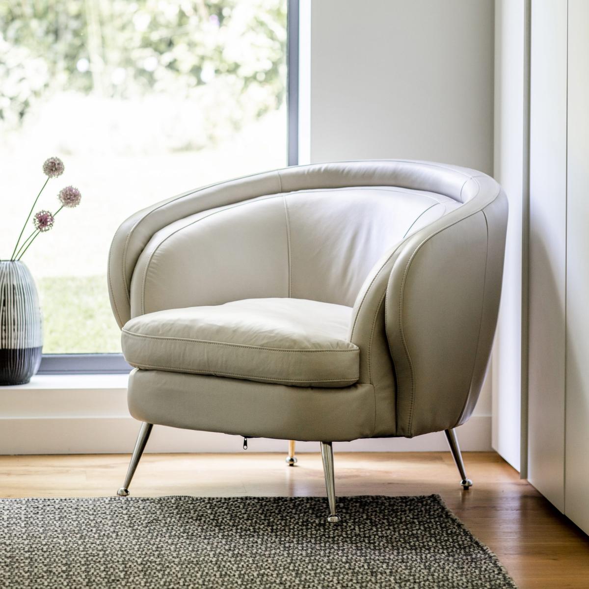 Contemporary tub chair with mid-century inspiration, perfect for adding luxury to your living space. Available in four luxurious finishes, this tub chair is finished with sleek silver steel legs. Material: Leather. Colour/Finish: Cream.