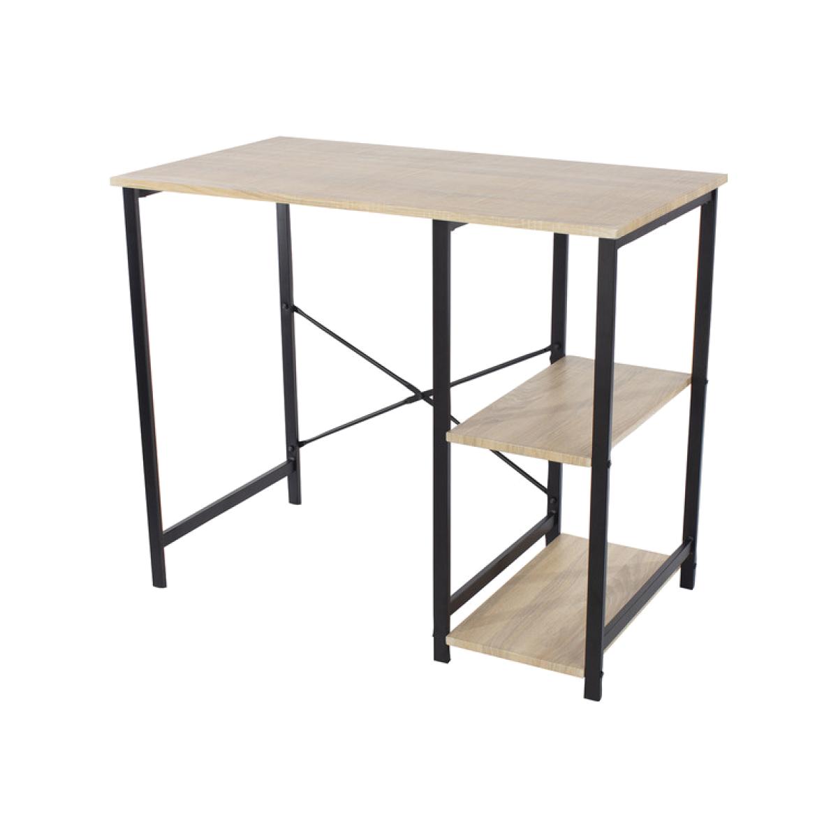 Our home study desk features a light oak woodgrain effect top with black legs, the desk comes with open storage shelves at the side for files and hard drive.