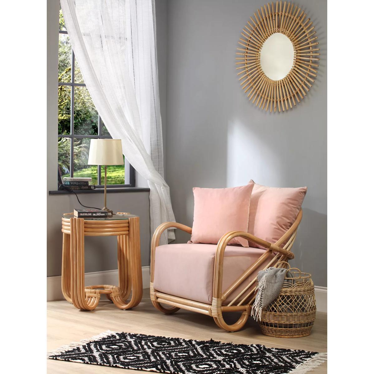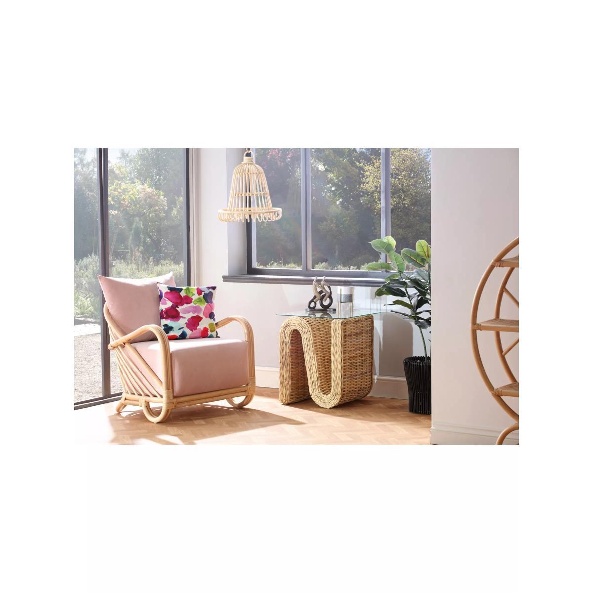 Handmade from natural rattan in a contemporary arched shape, the Arch lounge chair from Desser is an attractive design for the living room or conservatory. The curved cane front legs are on-trend features and the armrests and deep seat with a thick base provide added comfort. The handsewn seat and backrest cushions are made in the UK with a wrapped finish to help prevent wear and tear. The cushions are velvet in texture, bringing a touch of plush luxury. Strong and durable, natural rattan is low maintenance and easy to keep clean. Wipe the furniture clean with a dry cloth or a slightly damp cloth and dry it afterwards. Keep the furniture in a dry environment and avoid leaving it under direct sunlight for prolonged periods. The furniture’s colour lasts longer if moved around a conservatory regularly to protect it from direct sun in the same spot. Sustainably sourced in Indonesia, rattan is fast-growing compared to wood alternatives and, as a companion crop, its farming encourages the preservation of forests. Every part of the rattan vine is used. Outer rattan cane is used for attractive weaving and the solid core is steamed to manipulate it into beautiful furniture shapes. Want to see it first? You may want to see and get a feel for the product in one of our shops before ordering. We'll be able to tell you where the range you'd like to view is on display.