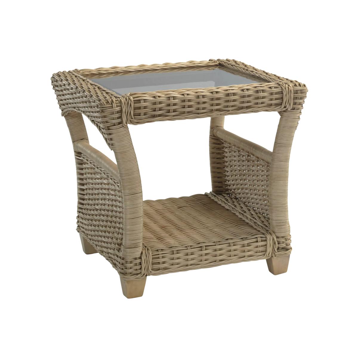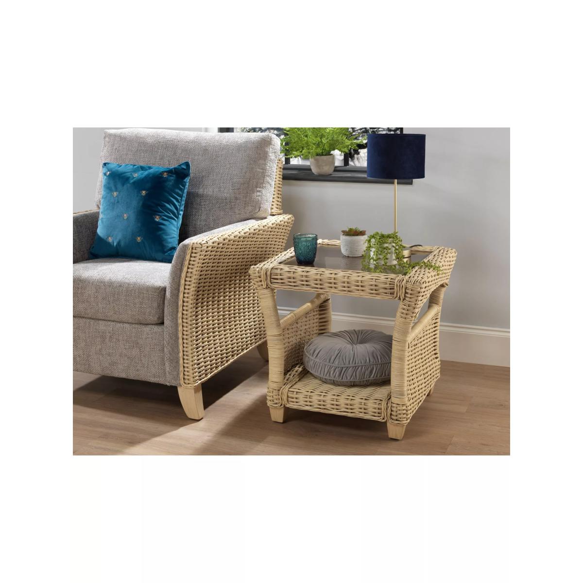 Natural rattan handmade side table with toughened glass and storage shelf.