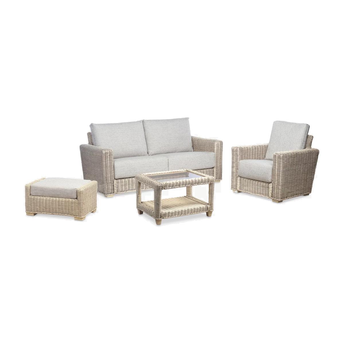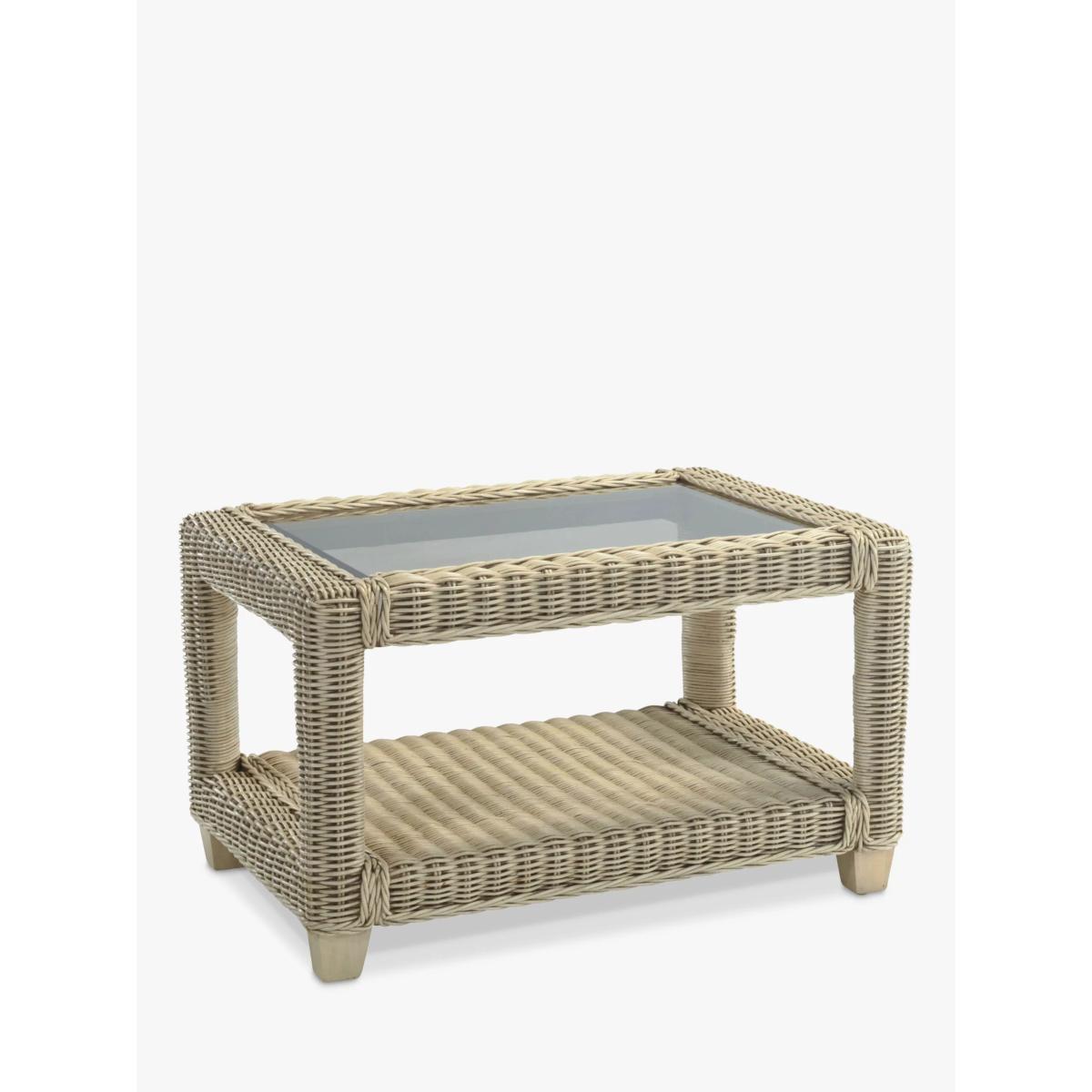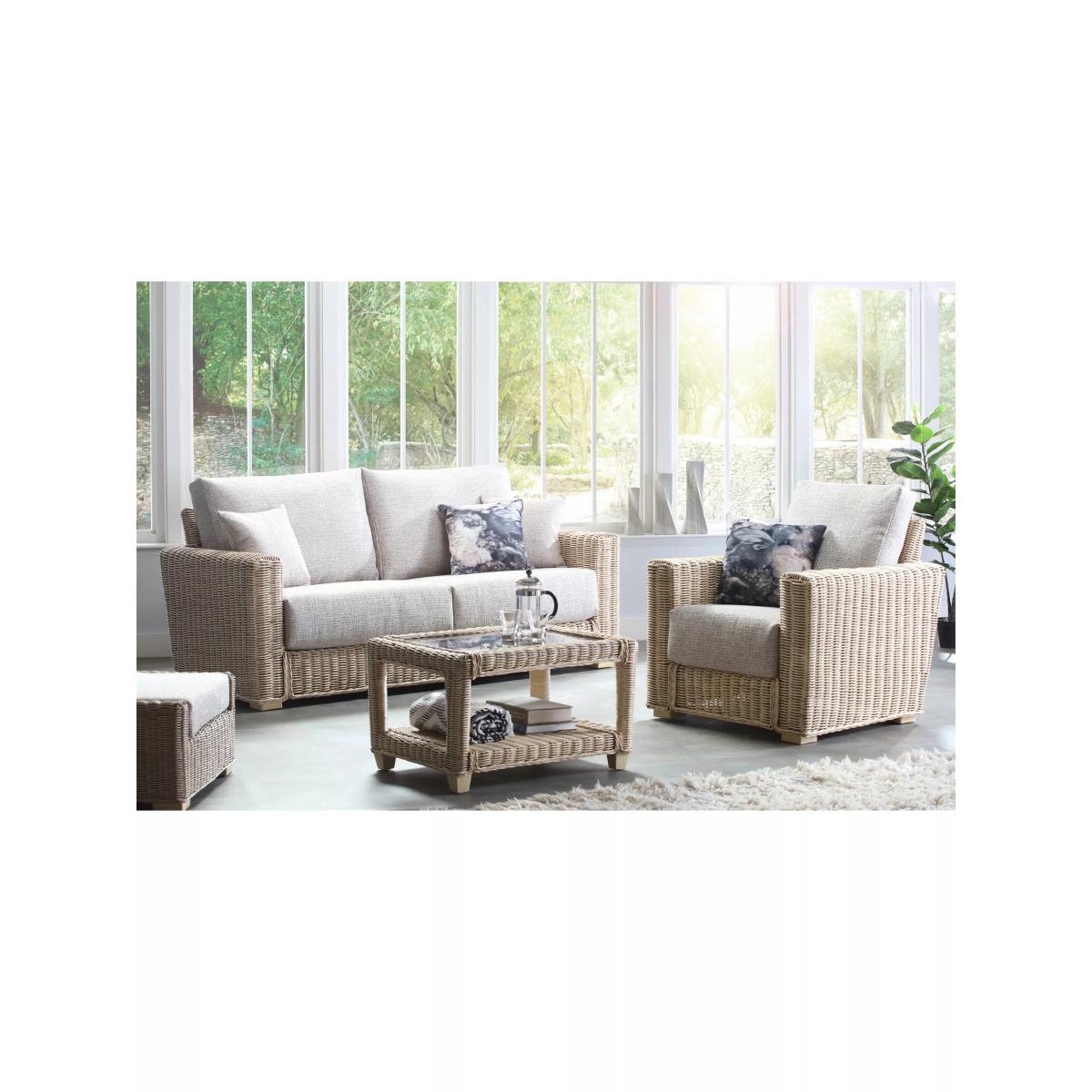 Handmade from natural rattan, the Burford four-seater lounging set from Desser features intricate woven wicker, creating an attractive and practical design for the living room or conservatory. The three-seater sofa, lounge armchair and footstool have handsewn backrest cushions and thick seat cushions made in the UK with a wrapped finish to help prevent wear and tear. The rectangular coffee table has a 5mm toughened glass top and a storage shelf to keep magazines, newspapers and books tucked away. Made with sturdy wooden legs, the set complements matching boxy-shaped rattan furniture in the Burford range. Strong and durable, natural rattan is low maintenance and easy to keep clean. Wipe the furniture clean with a dry cloth or a slightly damp cloth and dry it afterwards. Keep the furniture in a dry environment and avoid leaving it under direct sunlight for prolonged periods. The furniture’s colour lasts longer if moved around a conservatory regularly to protect it from direct sun in the same spot. Sustainably sourced in Indonesia, rattan is fast-growing compared to wood alternatives and, as a companion crop, its farming encourages the preservation of forests. Every part of the rattan vine is used. Outer rattan cane is used for attractive weaving and the solid core is steamed to manipulate it into beautiful furniture shapes. Want to see it first? You may want to see and get a feel for the product in one of our shops before ordering. We'll be able to tell you where the range you'd like to view is on display.