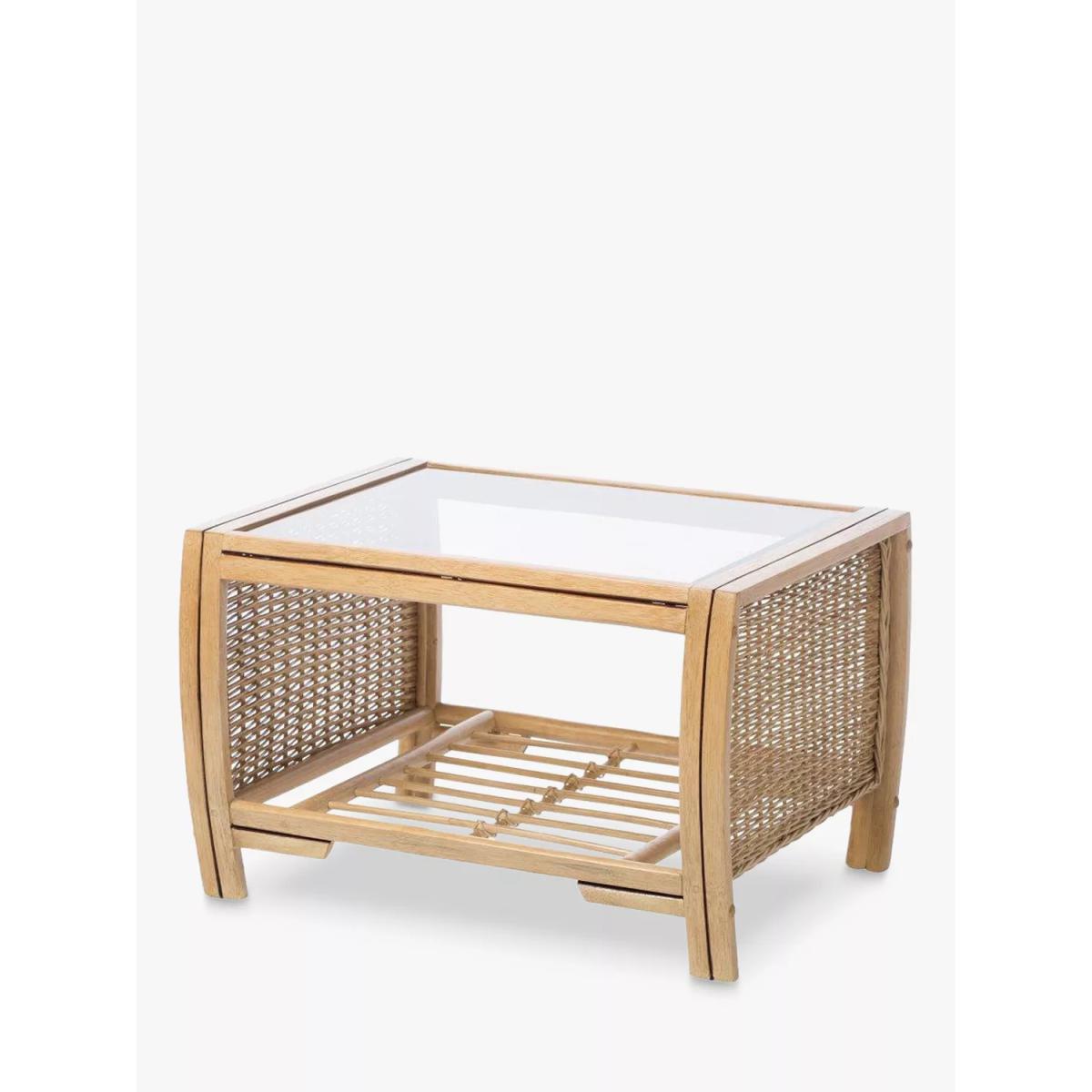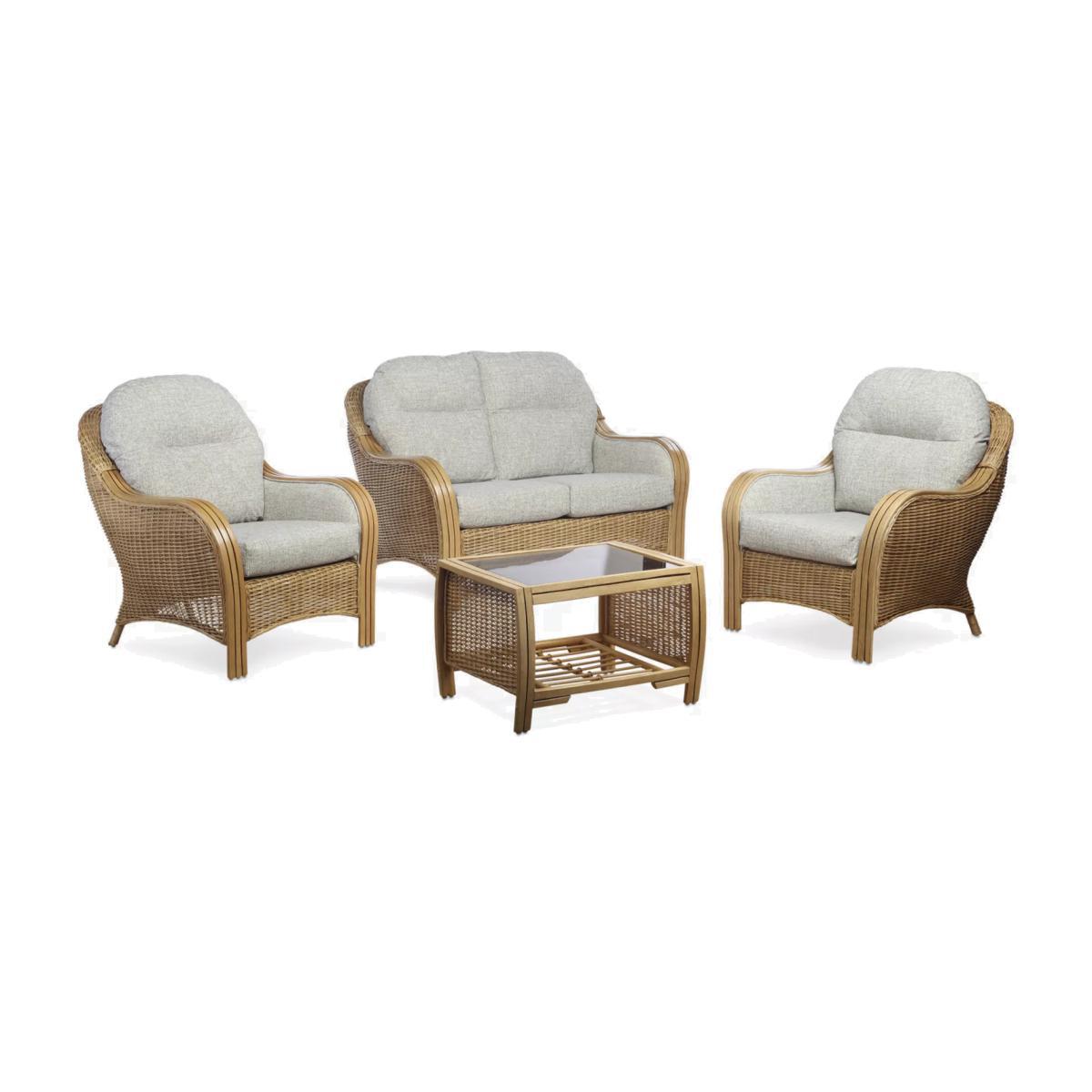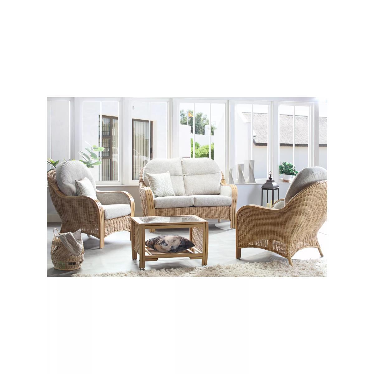 Handmade with a traditional wicker weave and a timeless shape, this Centurion lounge set from Desser includes a two-seater sofa, two lounge chairs and a coffee table. The set features intricate woven and curved cane detailing, creating an attractive and practical piece for the living room or conservatory. The sweeping laminated triple rattan arms are smooth for added comfort when relaxing back on the sofa and chair, which have luxurious upholstered inner sides. The handsewn seating and backrest cushions are made in the UK with a wrapped finish to help prevent wear and tear. The sofa complements matching rattan furniture in the Centurion range. The rectangular table has a 5mm toughened glass top and a storage shelf to keep magazines, newspapers and books tucked away. Strong and durable, natural rattan is low maintenance and easy to keep clean. Wipe the furniture clean with a dry cloth or a slightly damp cloth and dry it afterwards. Keep the furniture in a dry environment and avoid leaving it under direct sunlight for prolonged periods. The furniture's colour lasts longer if moved around a conservatory regularly to protect it from direct sun in the same spot. Sustainably sourced in Indonesia, rattan is fast-growing compared to wood alternatives and, as a companion crop, its farming encourages the preservation of forests. Every part of the rattan vine is used. Outer rattan cane is used for attractive weaving and the solid core is steamed to manipulate it into beautiful furniture shapes. Want to see it first? You may want to see and get a feel for the product in one of our shops before ordering. We'll be able to tell you where the range you'd like to view is on display.