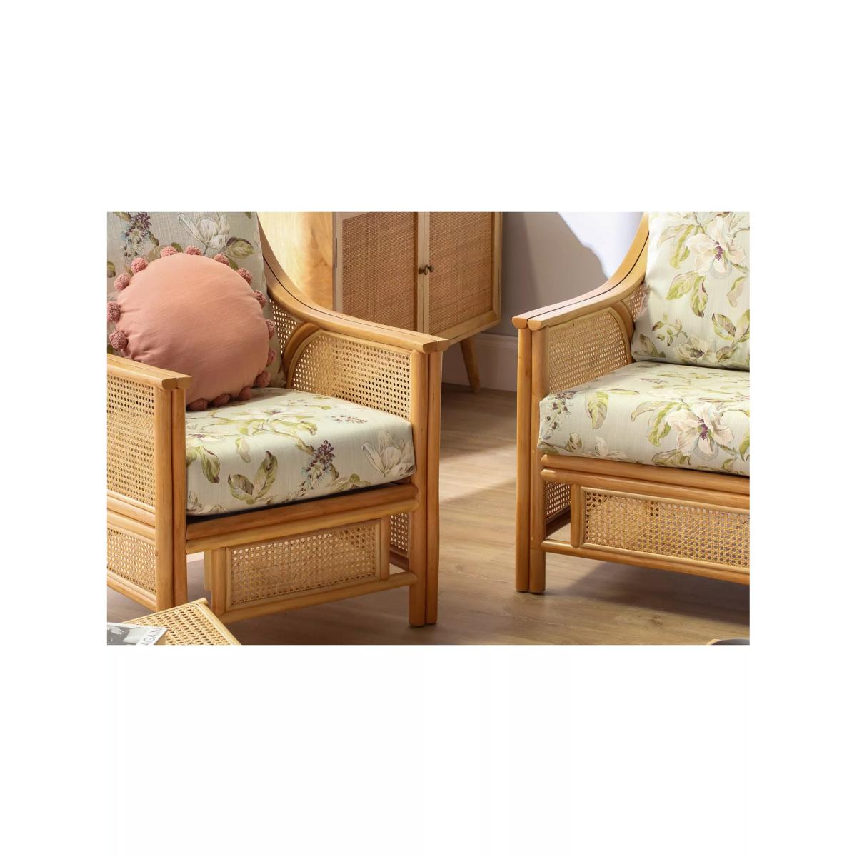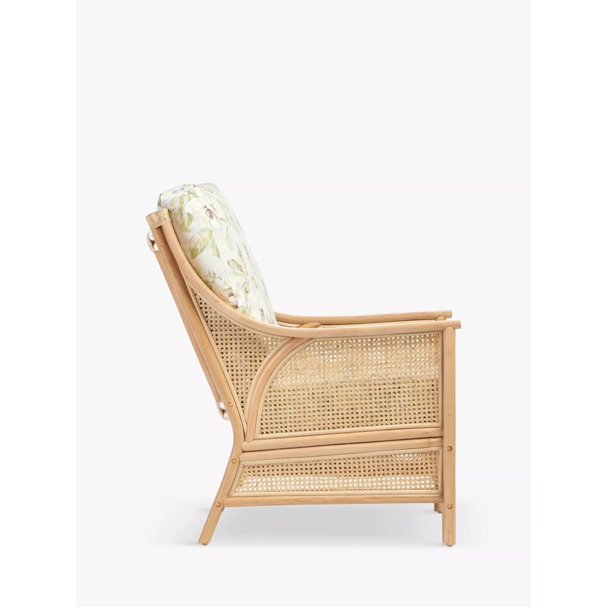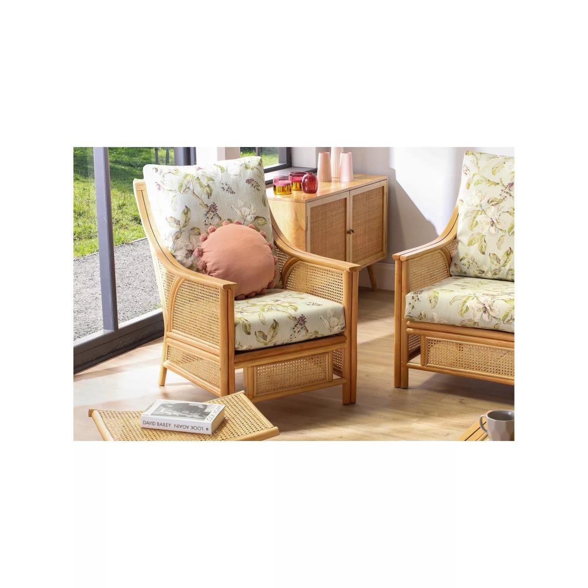 Handmade from natural rattan, the Chester lounge chair from Desser is an attractive design for the living room or conservatory. Made with open cane mesh webbing on the sides, front and back panels, with a Pirelli webbing base for durability. The high back seat and wide seat area provide comfort, along with the UK-made hand-sewn cushions in a lily print. Strong and durable, natural rattan is low maintenance and easy to keep clean. Wipe the furniture clean with a dry cloth or a slightly damp cloth and dry it afterwards. Keep the furniture in a dry environment and avoid leaving it under direct sunlight for prolonged periods. The furniture's colour lasts longer if moved around a conservatory regularly to protect it from direct sun in the same spot. Sustainably sourced in Indonesia, rattan is fast-growing compared to wood alternatives and, as a companion crop, its farming encourages the preservation of forests. Every part of the rattan vine is used. Outer rattan cane is used for attractive weaving and the solid core is steamed to manipulate it into beautiful furniture shapes.