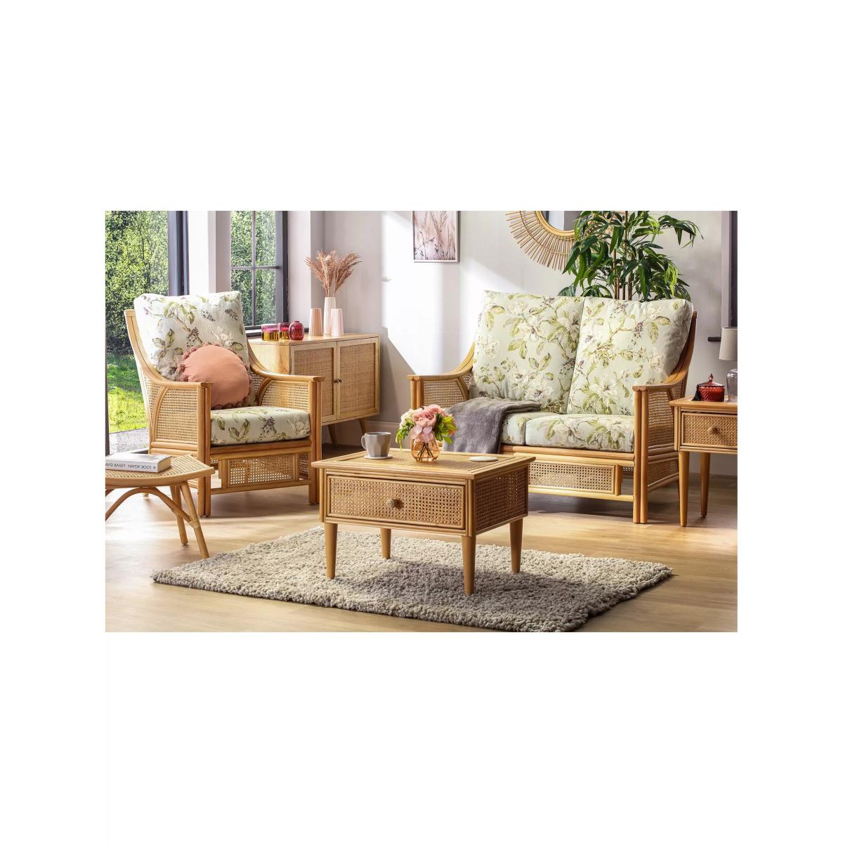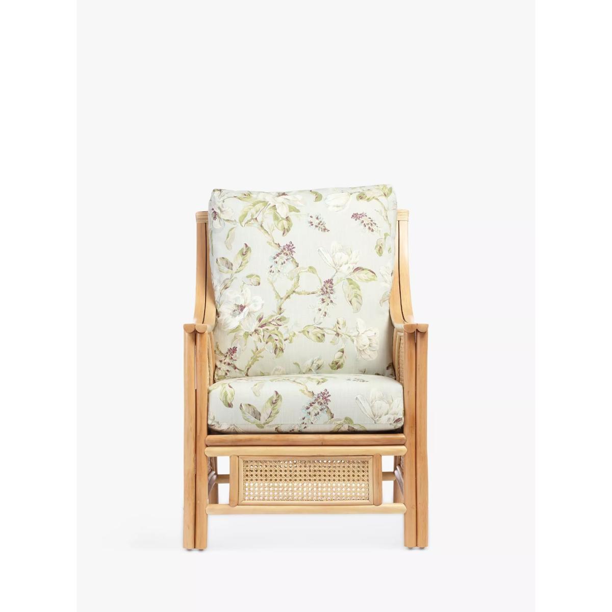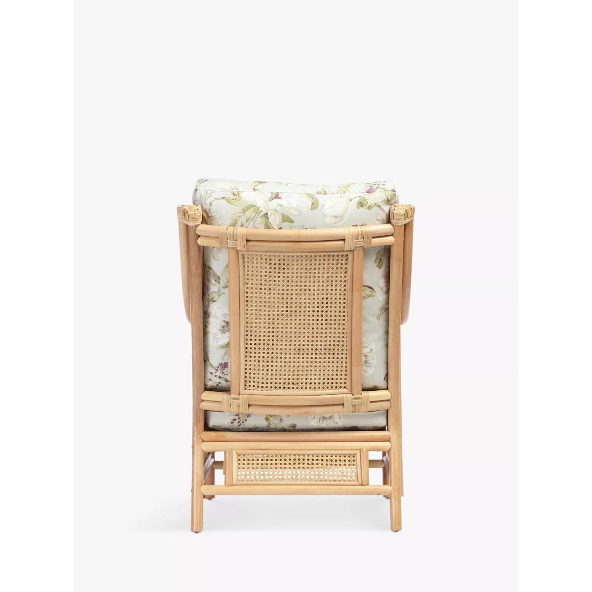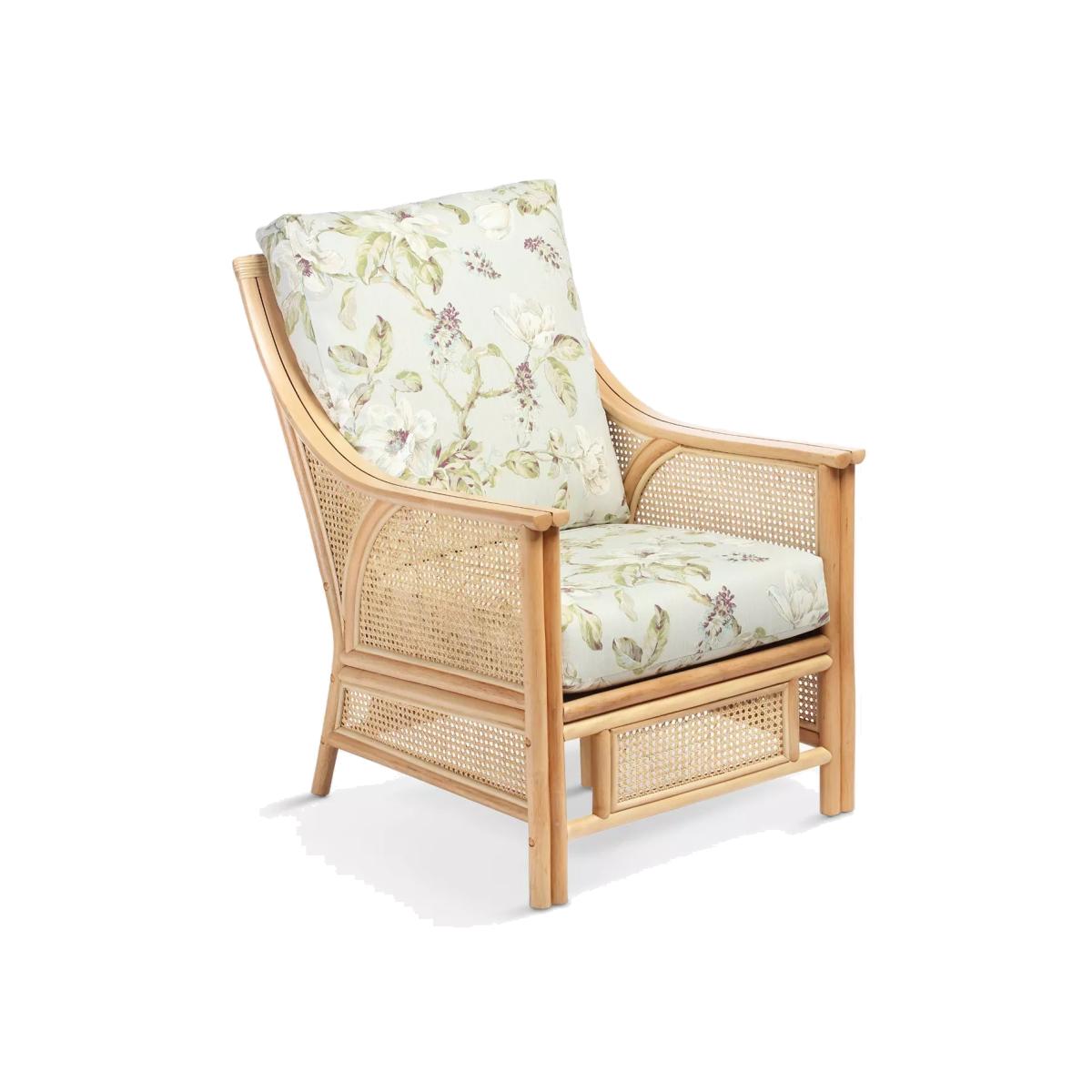 Handmade from natural rattan, the Chester lounge chair from Desser is an attractive design for the living room or conservatory. Made with open cane mesh webbing on the sides, front and back panels, with a Pirelli webbing base for durability. The high back seat and wide seat area provide comfort, along with the UK-made hand-sewn cushions in a lily print. Strong and durable, natural rattan is low maintenance and easy to keep clean. Wipe the furniture clean with a dry cloth or a slightly damp cloth and dry it afterwards. Keep the furniture in a dry environment and avoid leaving it under direct sunlight for prolonged periods. The furniture's colour lasts longer if moved around a conservatory regularly to protect it from direct sun in the same spot. Sustainably sourced in Indonesia, rattan is fast-growing compared to wood alternatives and, as a companion crop, its farming encourages the preservation of forests. Every part of the rattan vine is used. Outer rattan cane is used for attractive weaving and the solid core is steamed to manipulate it into beautiful furniture shapes.