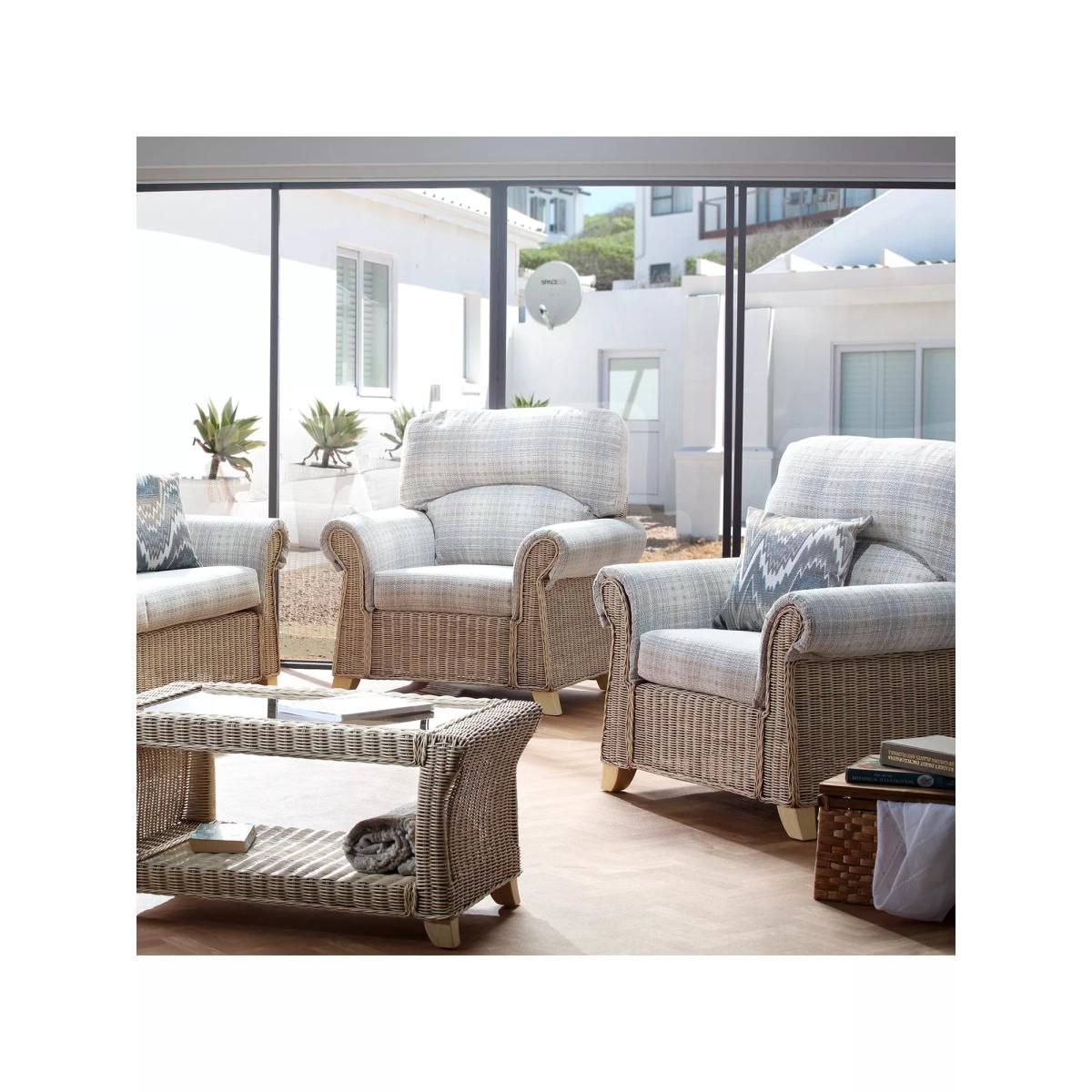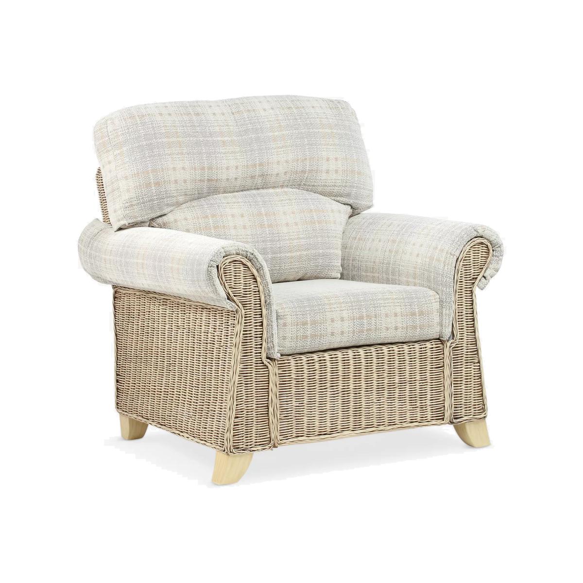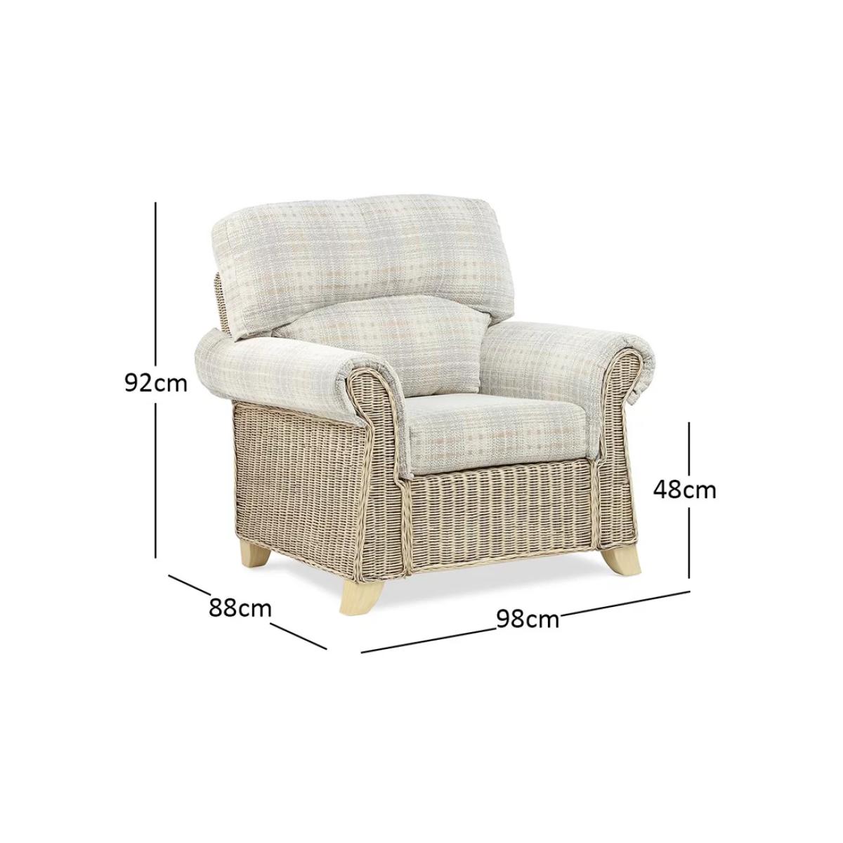 Handmade with a traditional wicker weave and shape, the Clifton armchair from Desser features intricate woven detailing, creating an attractive and practical piece for the living room or conservatory. The chair has upholstered arm covers and comfortable handsewn seat and backrest cushions, in a check pattern, made in the UK with a wrapped finish to help prevent wear and tear. The arm covers and all cushion covers are easily removable for cleaning. The chair complements matching rattan furniture in the Clifton range. Strong and durable, natural rattan is low maintenance and easy to keep clean. Wipe the furniture clean with a dry cloth or a slightly damp cloth and dry it afterwards. Keep the furniture in a dry environment and avoid leaving it under direct sunlight for prolonged periods. The furniture’s colour lasts longer if moved around a conservatory regularly to protect it from direct sun in the same spot. Sustainably sourced in Indonesia, rattan is fast-growing compared to wood alternatives and, as a companion crop, its farming encourages the preservation of forests. Every part of the rattan vine is used. Outer rattan cane is used for attractive weaving and the solid core is steamed to manipulate it into beautiful furniture shapes.