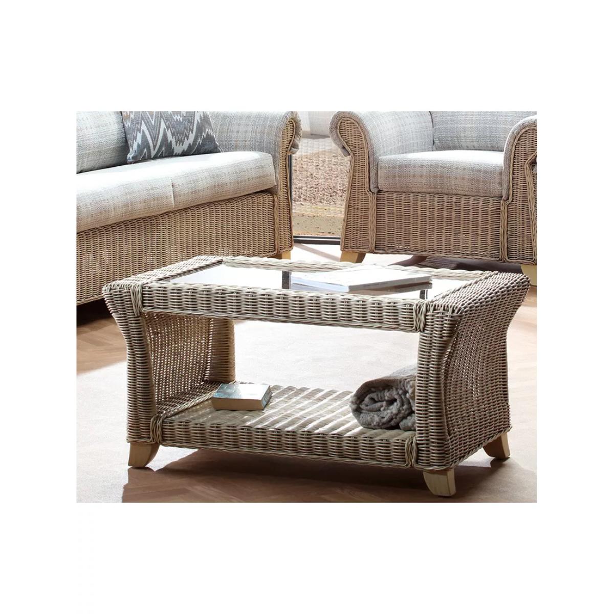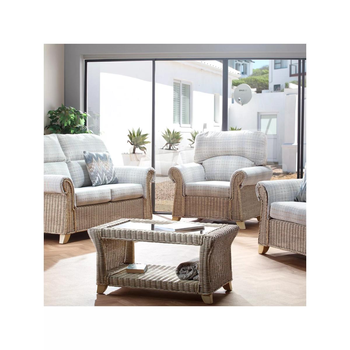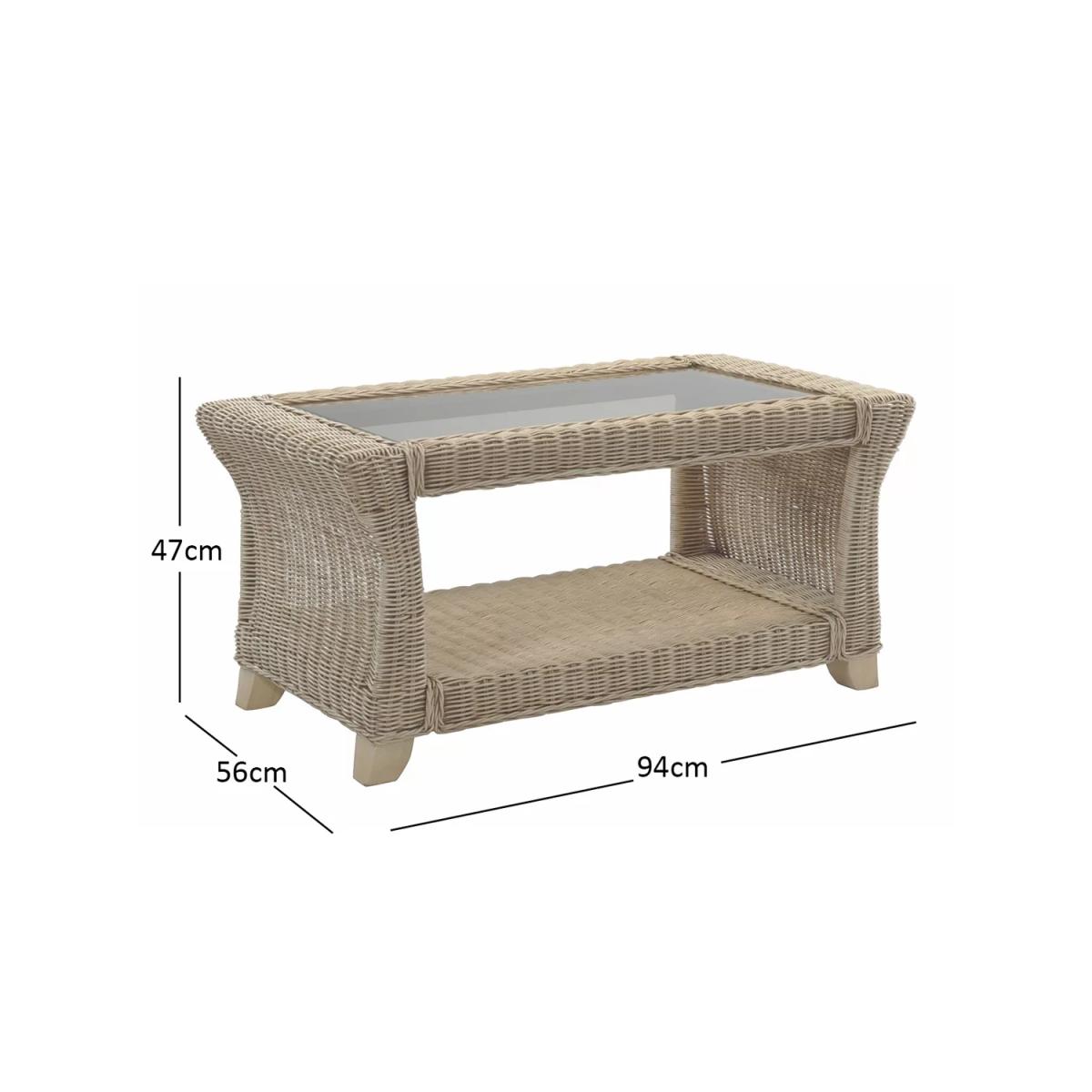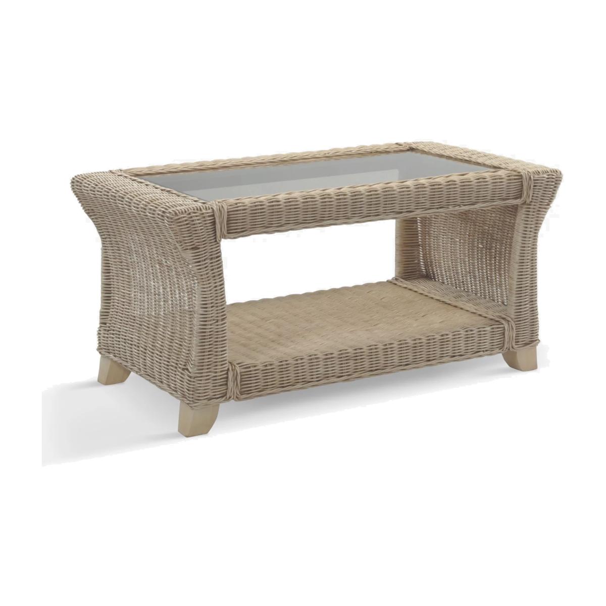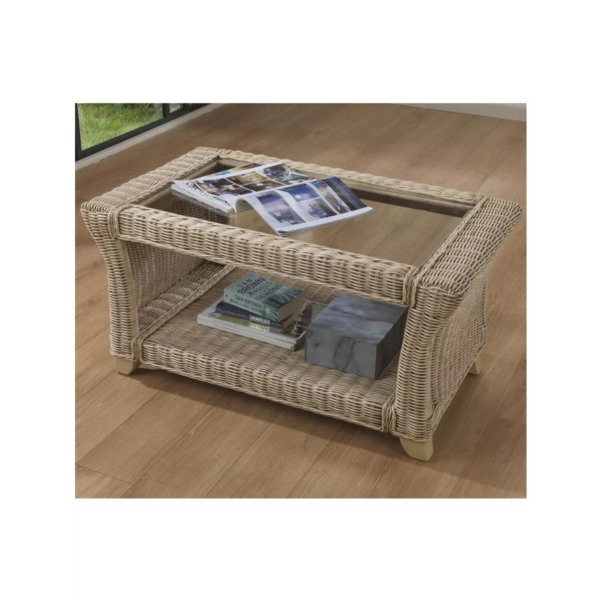 Handmade from natural rattan, the Clifton coffee table from Desser features intricate woven wicker, creating an attractive and practical piece for the living room or conservatory. The rectangular table has sturdy legs, a 5mm toughened glass top and a storage shelf to keep magazines, newspapers and books tucked away. The table complements matching rattan furniture in the Clifton range. Strong and durable, natural rattan is low maintenance and easy to keep clean. Wipe the furniture clean with a dry cloth or a slightly damp cloth and dry it afterwards. Keep the furniture in a dry environment and avoid leaving it under direct sunlight for prolonged periods. The furniture’s colour lasts longer if moved around a conservatory regularly to protect it from direct sun in the same spot. Sustainably sourced in Indonesia, rattan is fast-growing compared to wood alternatives and, as a companion crop, its farming encourages the preservation of forests. Every part of the rattan vine is used. Outer rattan cane is used for attractive weaving and the solid core is steamed to manipulate it into beautiful furniture shapes.