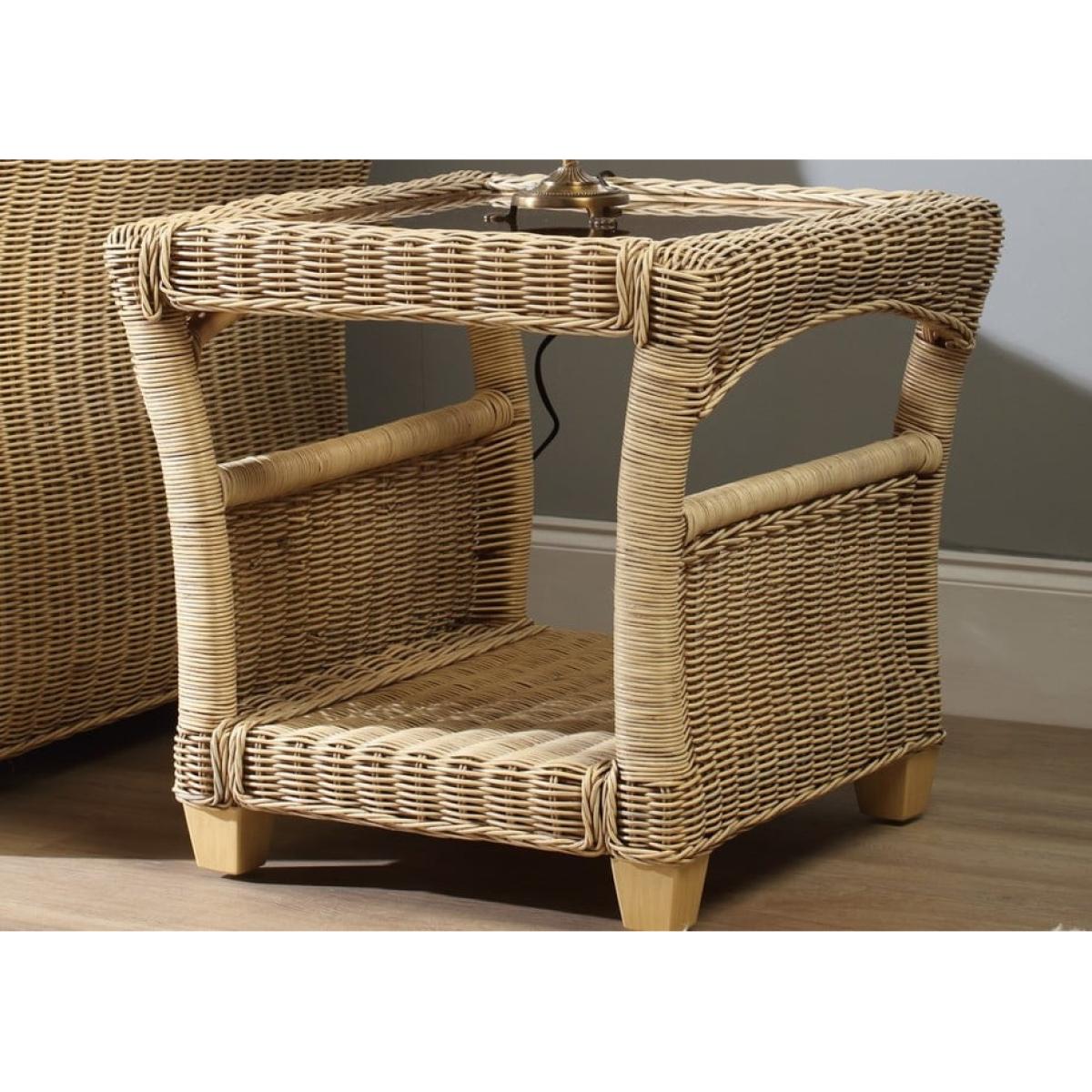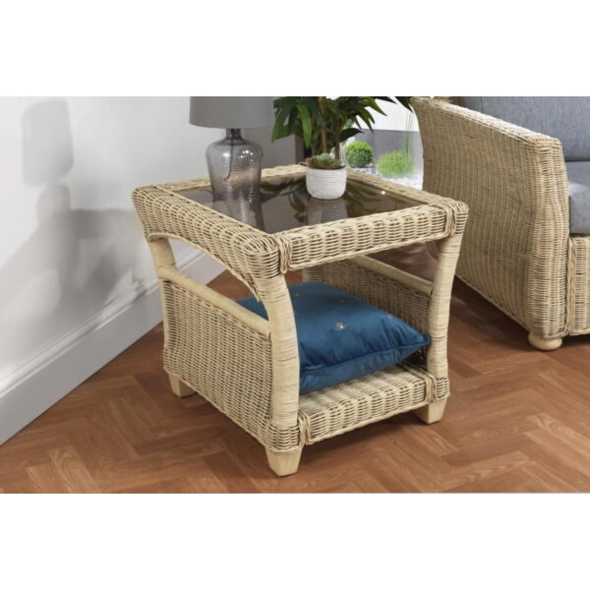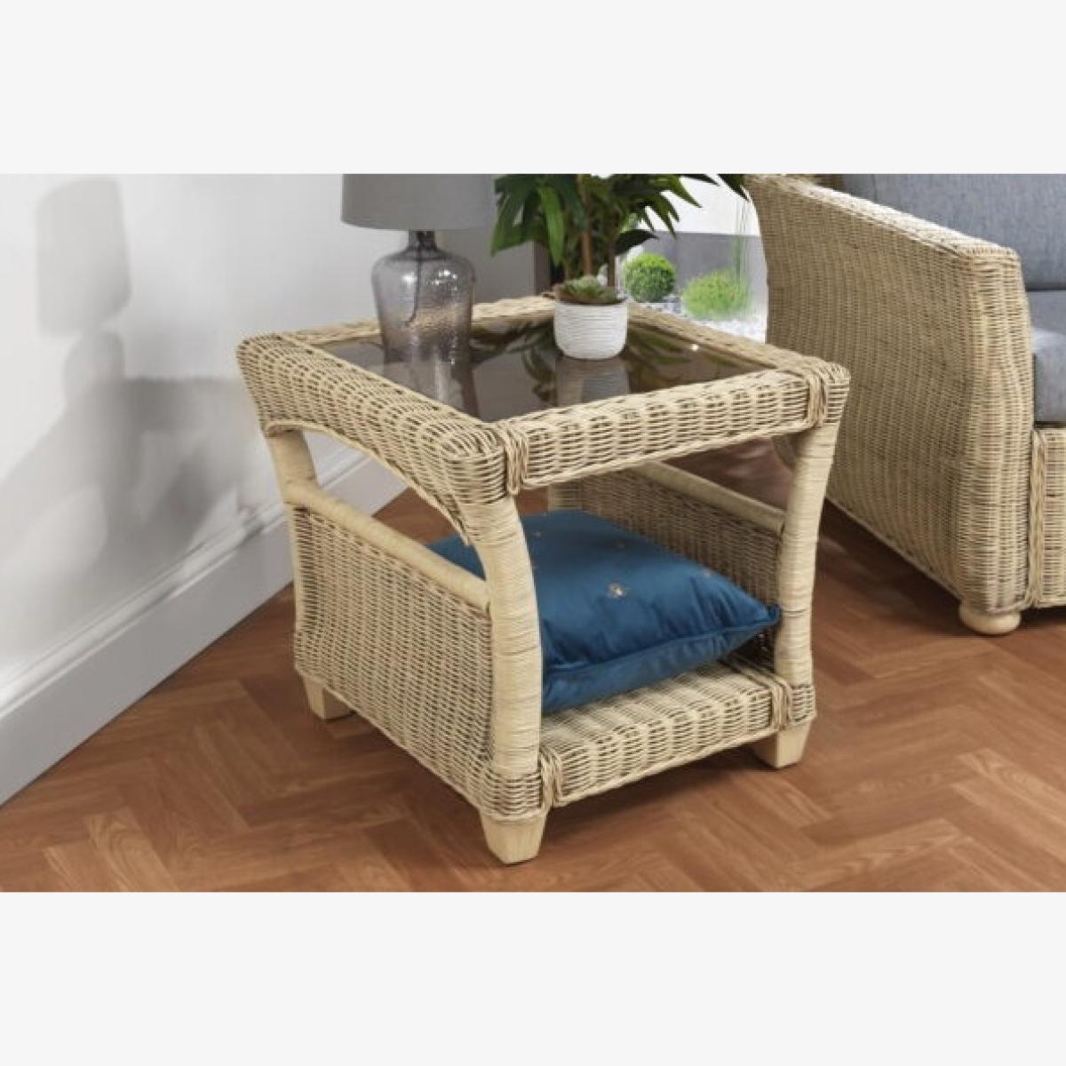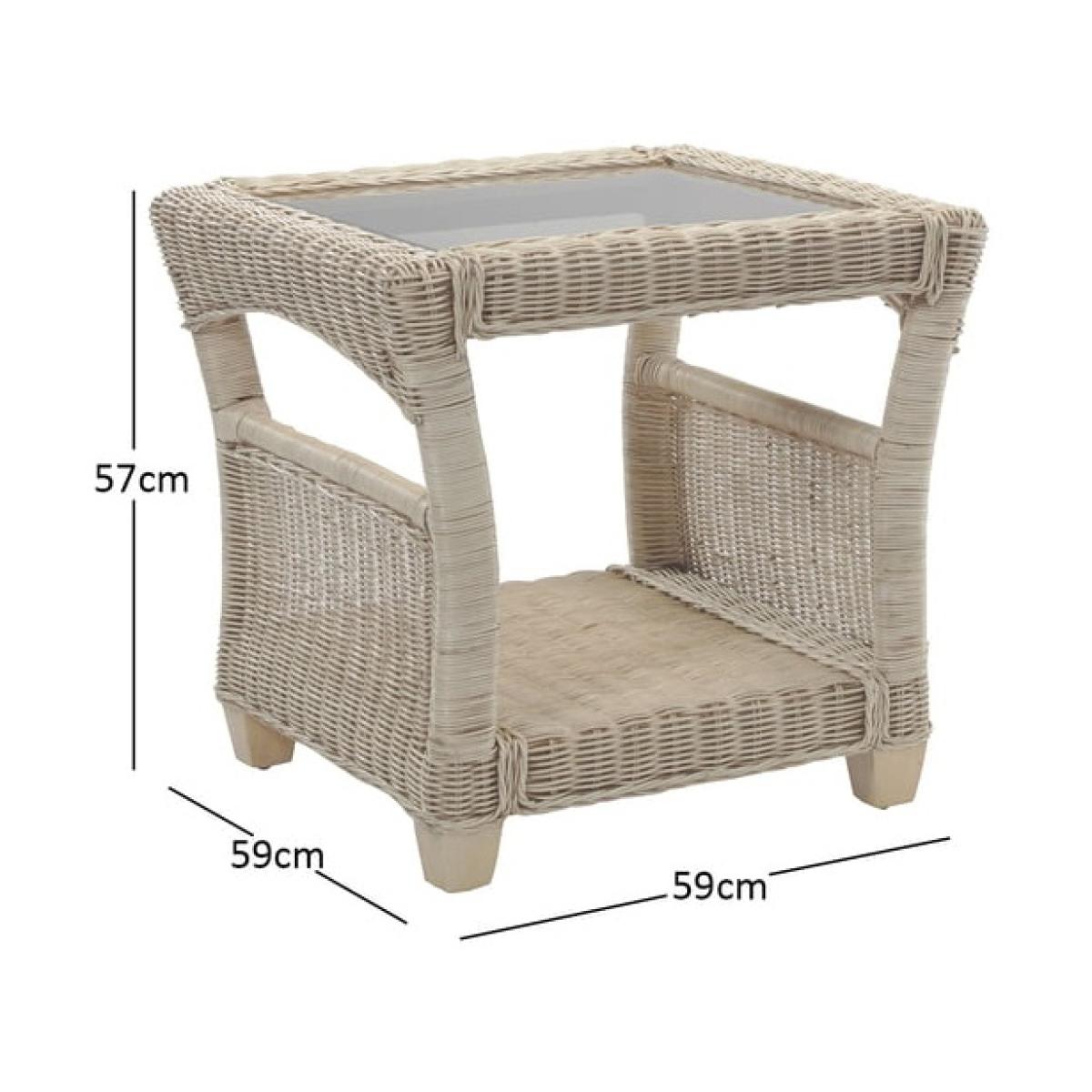The Desser Corsica Lamp Table & Glass is perfect to sit alongside the rest of the range, the wicker weave of the cane frame allows the lamp table to sit alongside the rest of the range perfectly. Combines delicate wicker weaving with a beautiful natural-wash finish all wonderfully crafted with arching sides. Features: Storage shelf with wicker weave sides to prevent items from slipping off. 5mm toughened glass table top to hold your daily items 4 sturdy legs Arrives ready assembled Dimensions: Height 57cm Width 59cm Depth 59cm All screens vary in colour reproduction and whilst every effort has been made to display the colour as accurately as possible it is for guidance only.