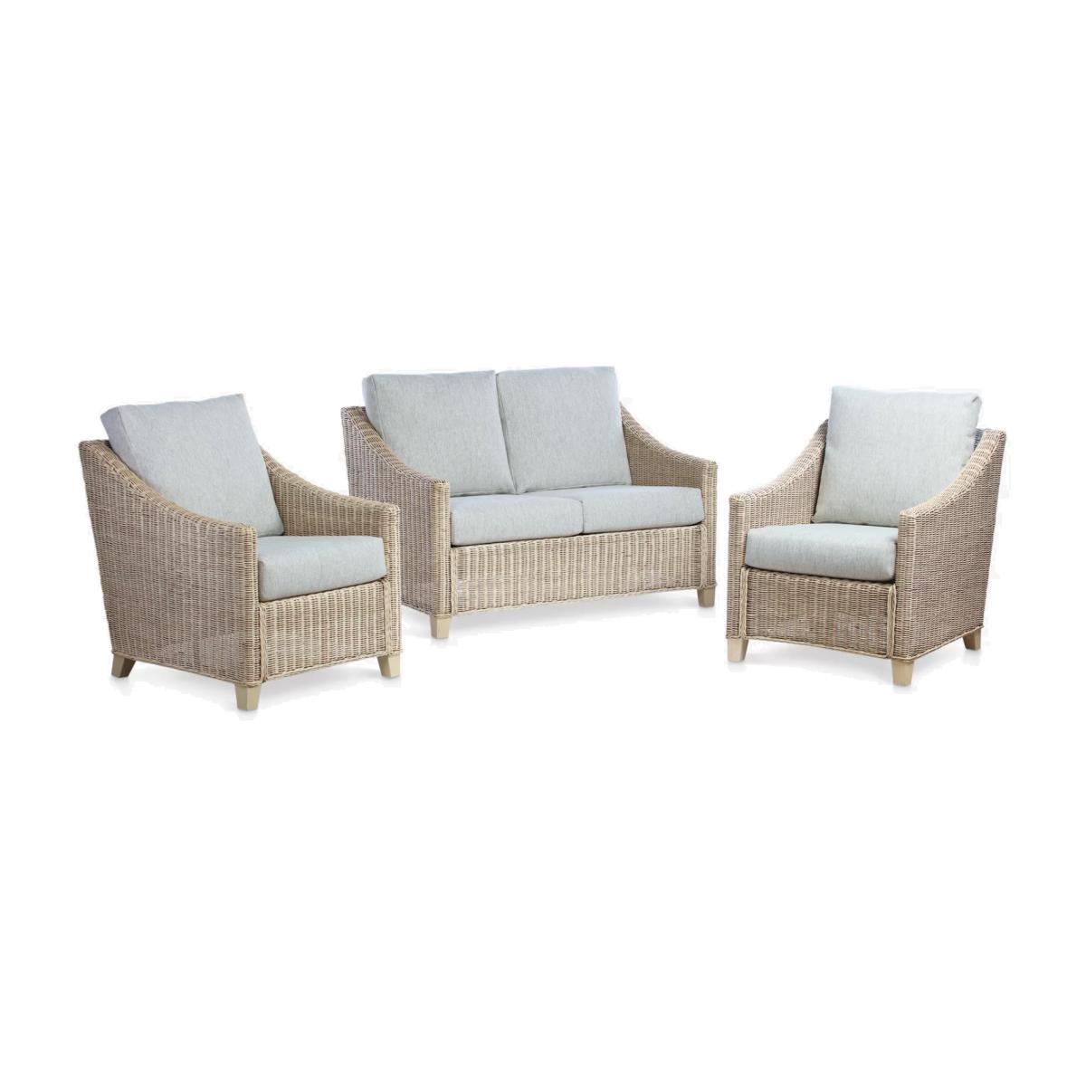 Handmade with a traditional wicker weave and a contemporary shape, the Dijon four-seater sofa set from Desser is an attractive design for the living room or conservatory. The two-seater sofa and pair of lounge armchairs have lower backs and sweeping arms for a comfortable sit. The handsewn seat and backrest cushions are made in the UK with a wrapped finish to help prevent wear and tear. Wooden legs ensure stability on every piece in the set. Strong and durable, natural rattan is low maintenance and easy to keep clean. Wipe the furniture clean with a dry cloth or a slightly damp cloth and dry it afterwards. Keep the furniture in a dry environment and avoid leaving it under direct sunlight for prolonged periods. The furniture's colour lasts longer if moved around a conservatory regularly to protect it from direct sun in the same spot. Sustainably sourced in Indonesia, rattan is fast-growing compared to wood alternatives and, as a companion crop, its farming encourages the preservation of forests. Every part of the rattan vine is used. Outer rattan cane is used for attractive weaving and the solid core is steamed to manipulate it into beautiful furniture shapes. Want to see it first? You may want to see and get a feel for the product in one of our shops before ordering. We'll be able to tell you where the range you'd like to view is on display.