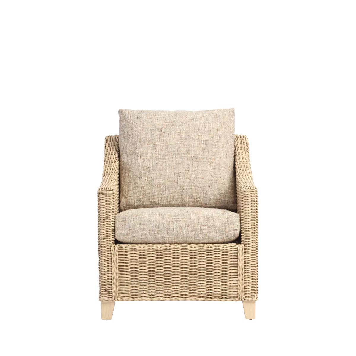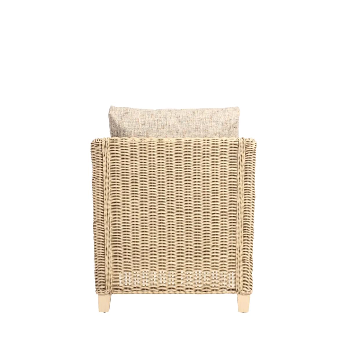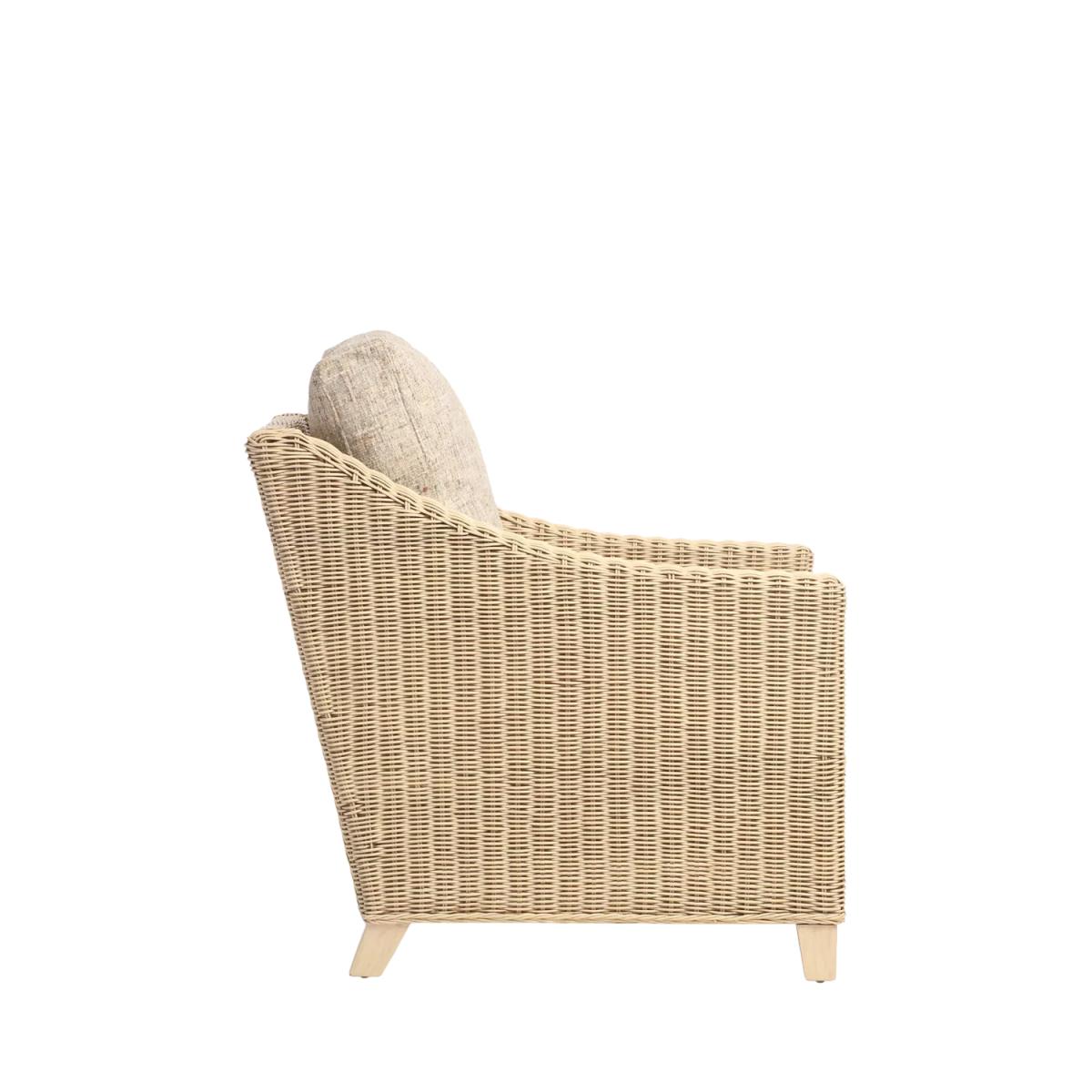 Handmade with a traditional wicker weave and a contemporary shape, the Dijon lounge chair from Desser is an attractive design for an orangery, summerhouse, conservatory or living room. The lower back and sweeping arms give a comfortable sit, and the wooden legs ensure stability. The hand-sewn seat and backrest cushions are made in the UK, in Manchester, with a wrapped finish to help prevent wear and tear. The cushion inners are also made in the UK, so the quality and comfort are to the highest standard. The chair complements matching rattan furniture in the Dijon range. Strong and durable, natural rattan is low maintenance and easy to keep clean. Wipe the furniture clean with a dry cloth or a slightly damp cloth and dry it afterwards. Keep the furniture in a dry environment and avoid leaving it under direct sunlight for prolonged periods. The furniture’s colour lasts longer if moved around a conservatory regularly to protect it from direct sunlight in the same spot. Sourced in Indonesia, rattan is fast-growing compared to wood alternatives. Every part of the rattan vine is used. Outer rattan cane is used for attractive weaving and the solid core is steamed to manipulate it into beautiful furniture shapes.