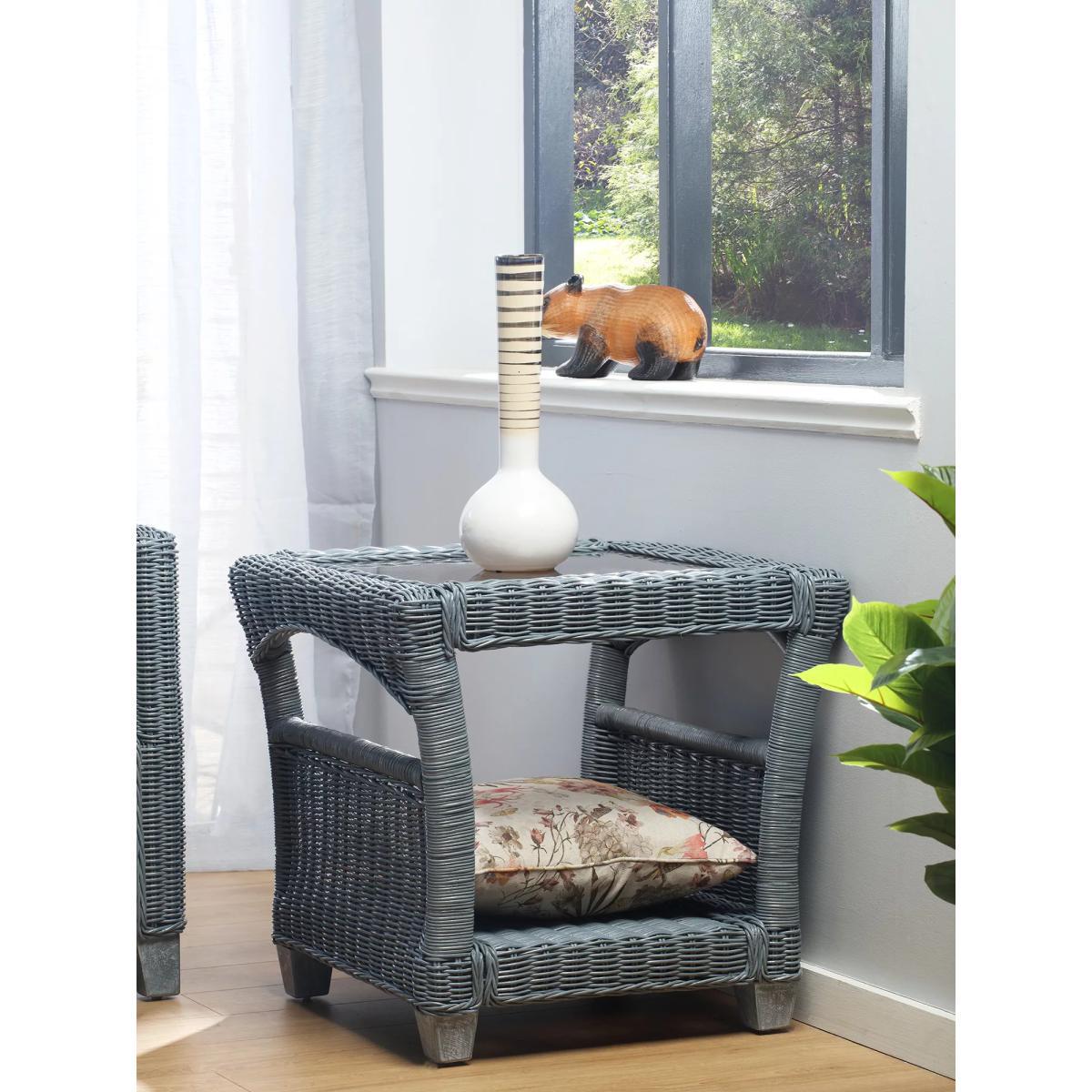 Handmade with a traditional wicker weave, the Dijon side table or lamp table from Desser is an attractive design for the living room or conservatory. The table has a 5mm toughened glass top and a storage shelf to keep magazines, newspapers and books tucked away. Wicker sides prevent items from slipping off the shelf and wooden legs ensure stability. The table complements matching rattan furniture in the Dijon range. Strong and durable, natural rattan is low maintenance and easy to keep clean. Wipe the furniture clean with a dry cloth or a slightly damp cloth and dry it afterwards. Keep the furniture in a dry environment and avoid leaving it under direct sunlight for prolonged periods. The furniture’s colour lasts longer if moved around a conservatory regularly to protect it from direct sun in the same spot. Sustainably sourced in Indonesia, rattan is fast-growing compared to wood alternatives and, as a companion crop, its farming encourages the preservation of forests. Every part of the rattan vine is used. Outer rattan cane is used for attractive weaving and the solid core is steamed to manipulate it into beautiful furniture shapes. Want to see it first? You may want to see and get a feel for the product in one of our shops before ordering. We'll be able to tell you where the range you'd like to view is on display.