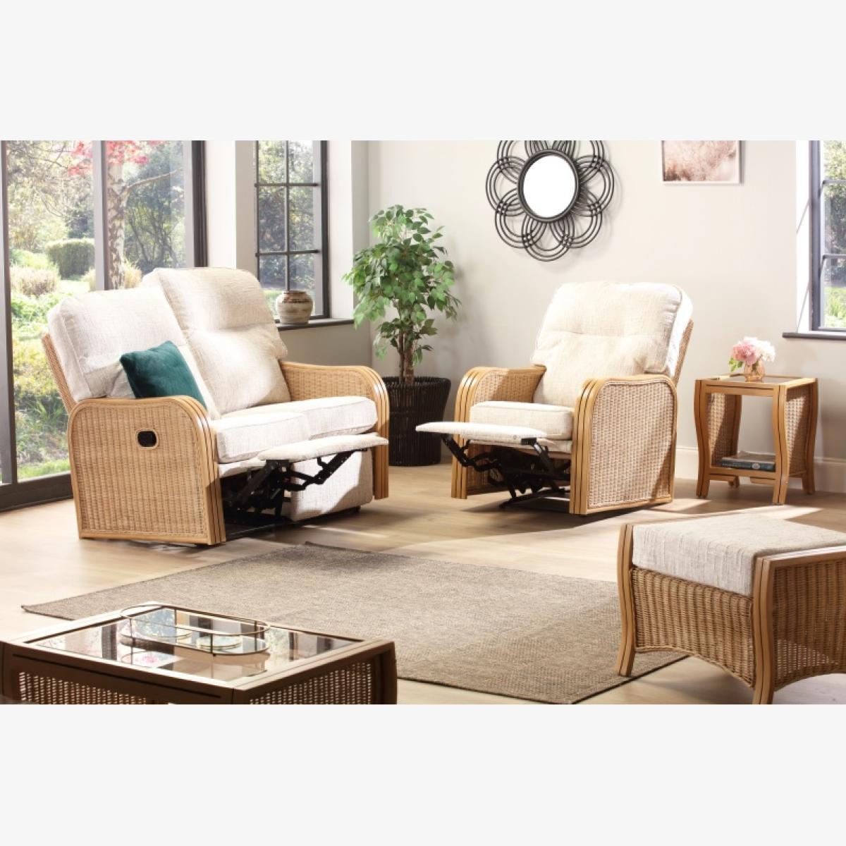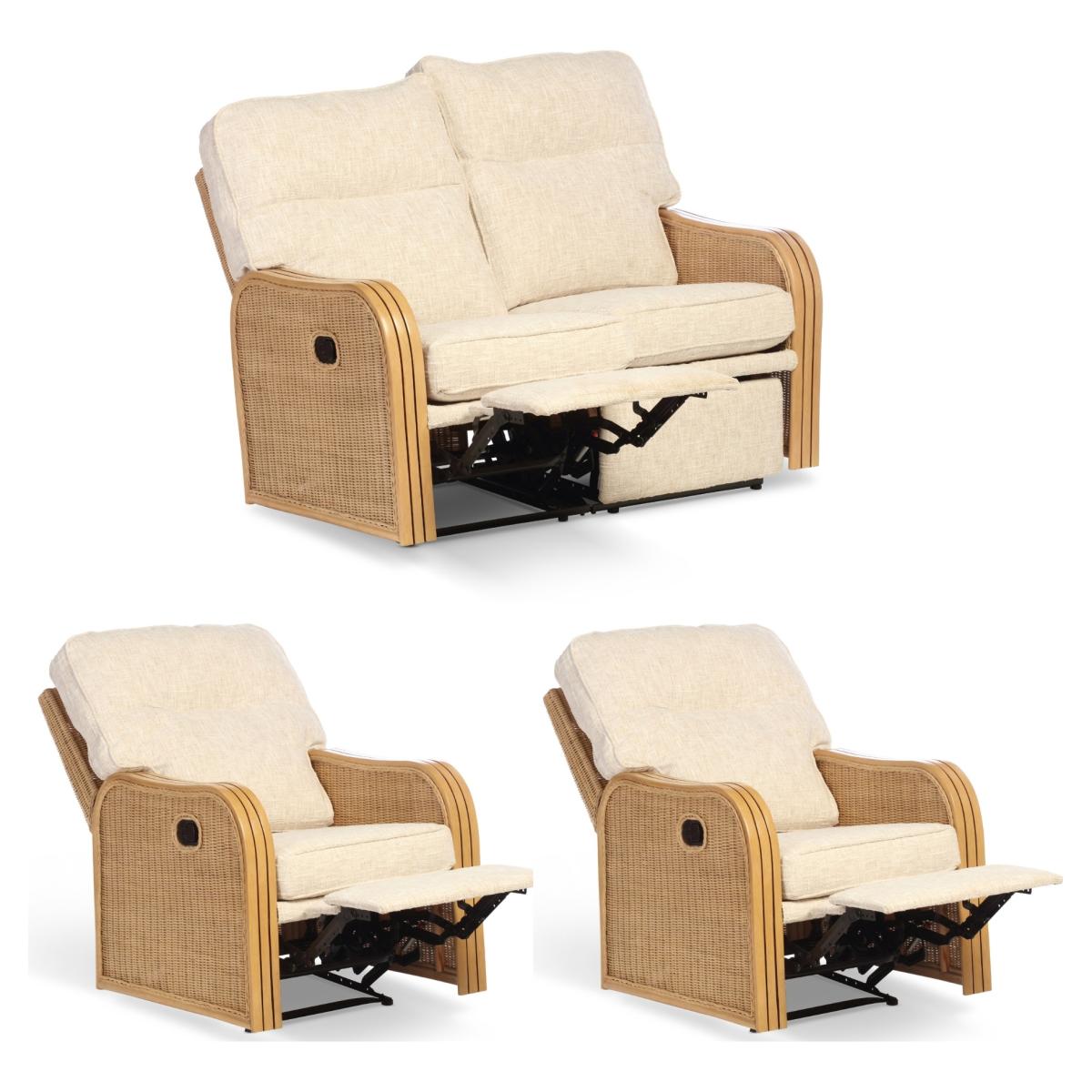 Introducing our Desser Paris 2 Seater Reclining Sofa & 2 Chairs Suite - Light Oak, where elegance meets comfort. Each piece in this collection features smooth laminated arms and a refined wicker weave, seamlessly blending style and relaxation. Perfect for any living space, the reclining functionality ensures you can unwind in luxury. Transform your home and experience the timeless beauty and superior comfort of this unique high-quality rattan furniture range. Includes a 2 seater sofa & 2x armchairs Reclining ability with easy handle on the side Soft, foam filled seat cushions with supportive fibre filled back cushion Hand-crafted & hand-weaved cane frame through sustainable farming Dacron wrap is used to help prevent worn areas forming on your cushions Pirelli Webbing ensures that your frames have the required support 1 Year Manufacturer's Guarantee. 2 Seater Dimensions: Height 109cm Width 136cm Depth 97cm Seat Area W 116cm x D 53cm Back Cushion Height 66cm Arm Height 66cm Floor to seat Height 52cm Arm Chair Dimensions: Height 109cm Width 73cm Depth 97cm Seat Area W 54cm x D 53cm Back Cushion Height 66cm Arm Height 66cm Floor to Seat Height 52cm All screens vary in colour reproduction and whilst every effort has been made to display the colour as accurately as possible it is for guidance only.