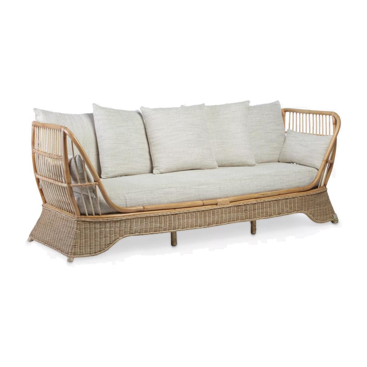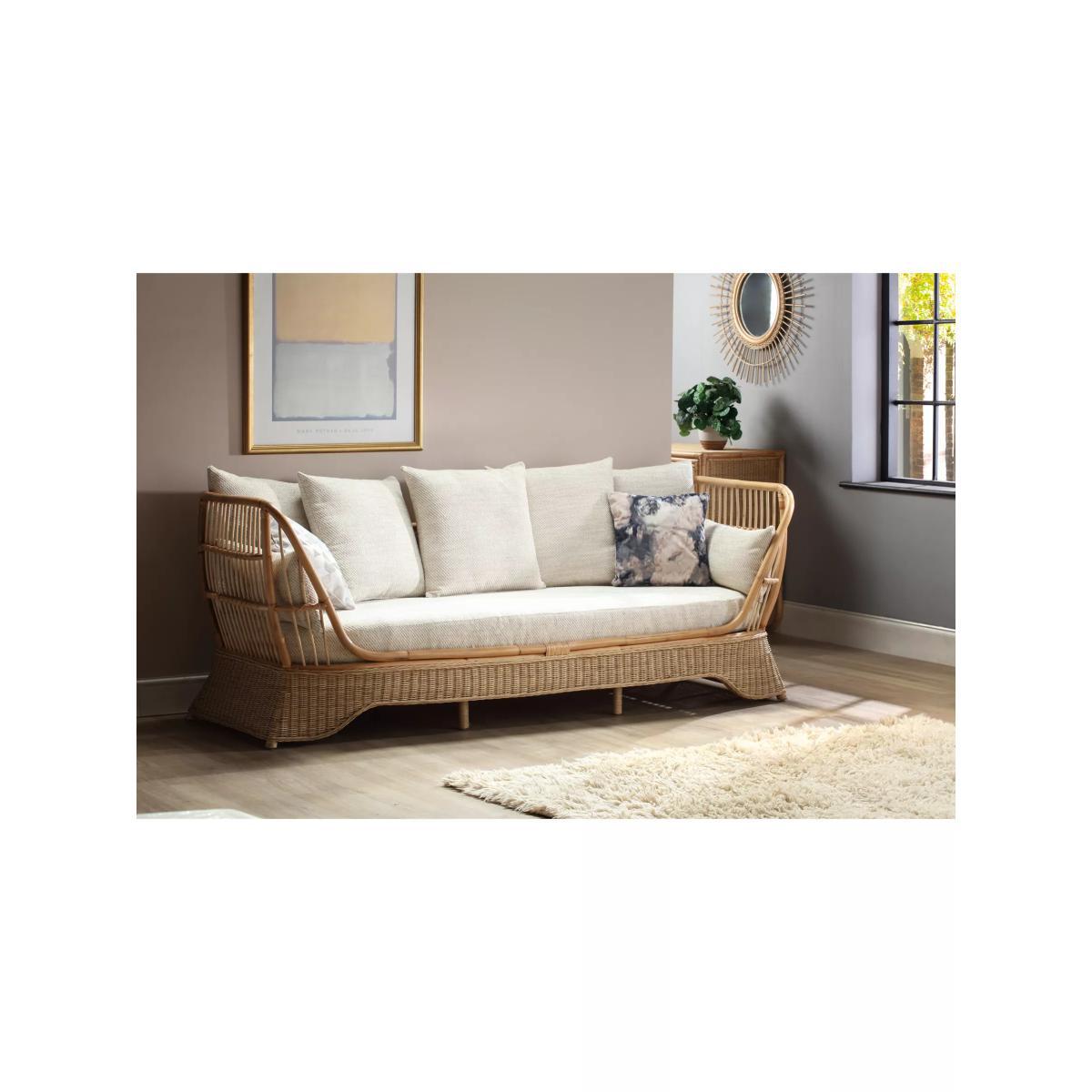 Handmade from natural rattan, the three-seater daybed from Desser features an intricate wicker weave skirt and cane detailing, creating an attractive and practical sofa for the living room or conservatory. The handsewn seat, backrest and scatter cushions are made in the UK with a wrapped finish to help prevent wear and tear. Strong and durable, natural rattan is low maintenance and easy to keep clean. Wipe the furniture clean with a dry cloth or a slightly damp cloth and dry it afterwards. Keep the furniture in a dry environment and avoid leaving it under direct sunlight for prolonged periods. The furniture’s colour lasts longer if moved around a conservatory regularly to protect it from direct sun in the same spot. Sustainably sourced in Indonesia, rattan is fast-growing compared to wood alternatives and, as a companion crop, its farming encourages the preservation of forests. Every part of the rattan vine is used. Outer rattan cane is used for attractive weaving and the solid core is steamed to manipulate it into beautiful furniture shapes. Want to see it first? You may want to see and get a feel for the product in one of our shops before ordering. We'll be able to tell you where the range you'd like to view is on display.