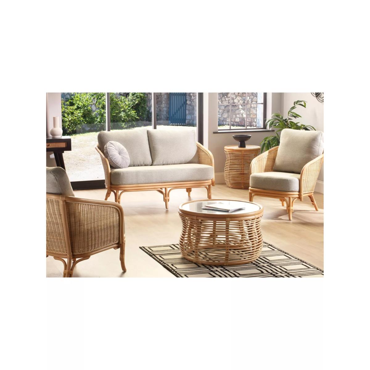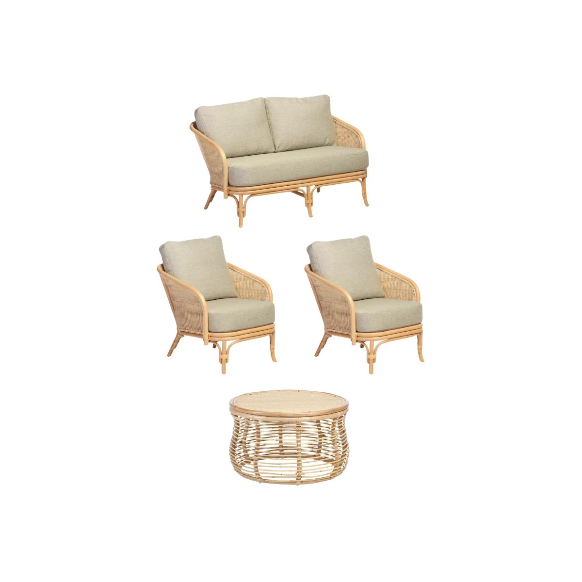 Handmade from natural rattan, the Royal 4-seater lounging set is perfect for your orangery, summerhouse, conservatory or living room. The set includes a sofa, two armchairs and a coffee table. Cushions are manufactured in the UK.