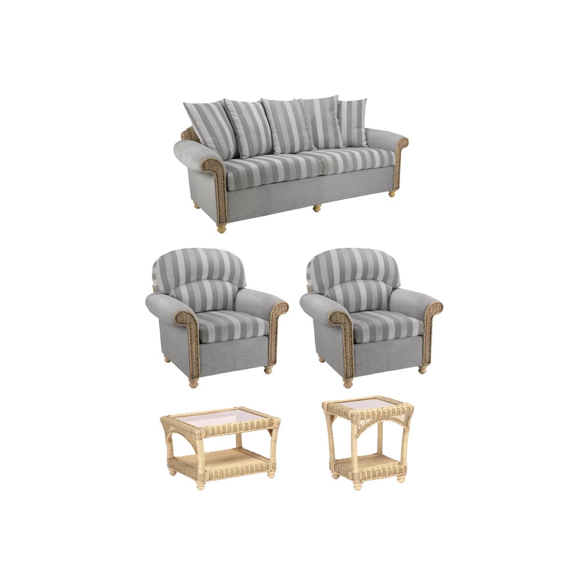 Handmade from natural rattan, the Samford 5-seater lounging set is perfect for your orangery, summerhouse, conservatory or living room. The set includes a scatterback sofa, two armchairs, a lamp table and a coffee table. Cushions are manufactured in the UK.