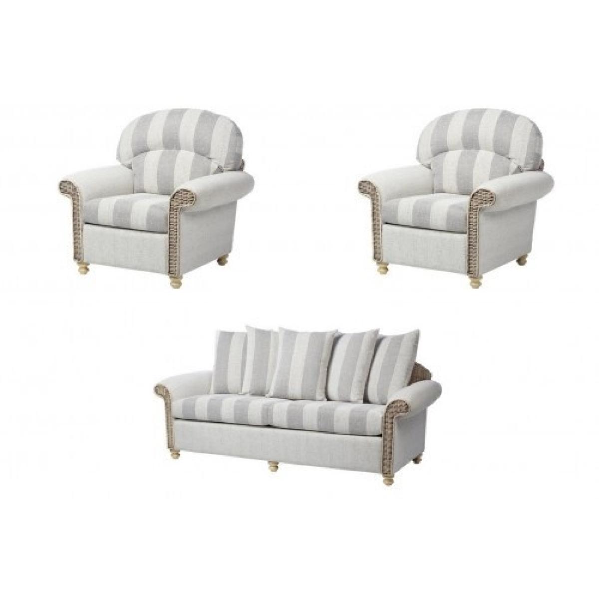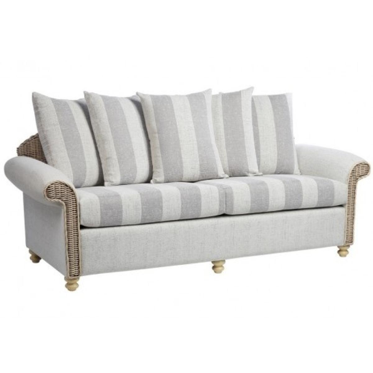 The 3-Seater Scatter back sofa is simply a showstopper, and will look gorgeous in your home. The 3-seater scatter back comprises of 5 large back rest cushions that can be moved around to fit the look you want. You have the option to mix and match from the wide selection of Desser fabrics, having the scatter back in one fabric, while the rest of the upholstery in another. While much of the sofa is upholstery, the natural wash rattan that is shown beautifully compliments the rest of the sofa, while keeping in touch with classic cane elements. This sofa is also available with a traditional back. Armchair:H 99cm x W 100cm x D 90cm 3 Seater Sofa:H 99cm x W 210cm x D 90cm Hand-made and easy-clean frames UK manufactured cushions Upholstered in the UK Choice of any Desser fabric 1-year warranty Sustainable Scatter back Pirelli webbing for under-cushion seating suspension Dacron-wrapped cushion inners for shape retention