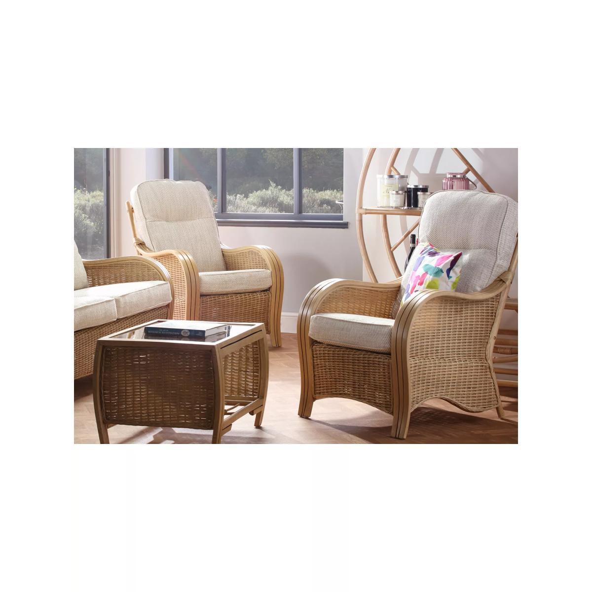 Handmade with a traditional wicker weave and a timeless shape, the Turin lounge chair from Desser features an intricate woven back, sides and front skirt, creating an attractive piece for the living room or conservatory. The sweeping laminated triple rattan arms are smooth for added comfort when relaxing back in the chair. The handsewn seat and backrest cushions are made in the UK with a wrapped finish to help prevent wear and tear. The chair complements matching rattan furniture in the Turin range. Strong and durable, natural rattan is low maintenance and easy to keep clean. Wipe the furniture clean with a dry cloth or a slightly damp cloth and dry it afterwards. Keep the furniture in a dry environment and avoid leaving it under direct sunlight for prolonged periods. The furniture’s colour lasts longer if moved around a conservatory regularly to protect it from direct sun in the same spot. Sustainably sourced in Indonesia, rattan is fast-growing compared to wood alternatives and, as a companion crop, its farming encourages the preservation of forests. Every part of the rattan vine is used. Outer rattan cane is used for attractive weaving and the solid core is steamed to manipulate it into beautiful furniture shapes. Want to see it first? You may want to see and get a feel for the product in one of our shops before ordering. We'll be able to tell you where the range you'd like to view is on display.