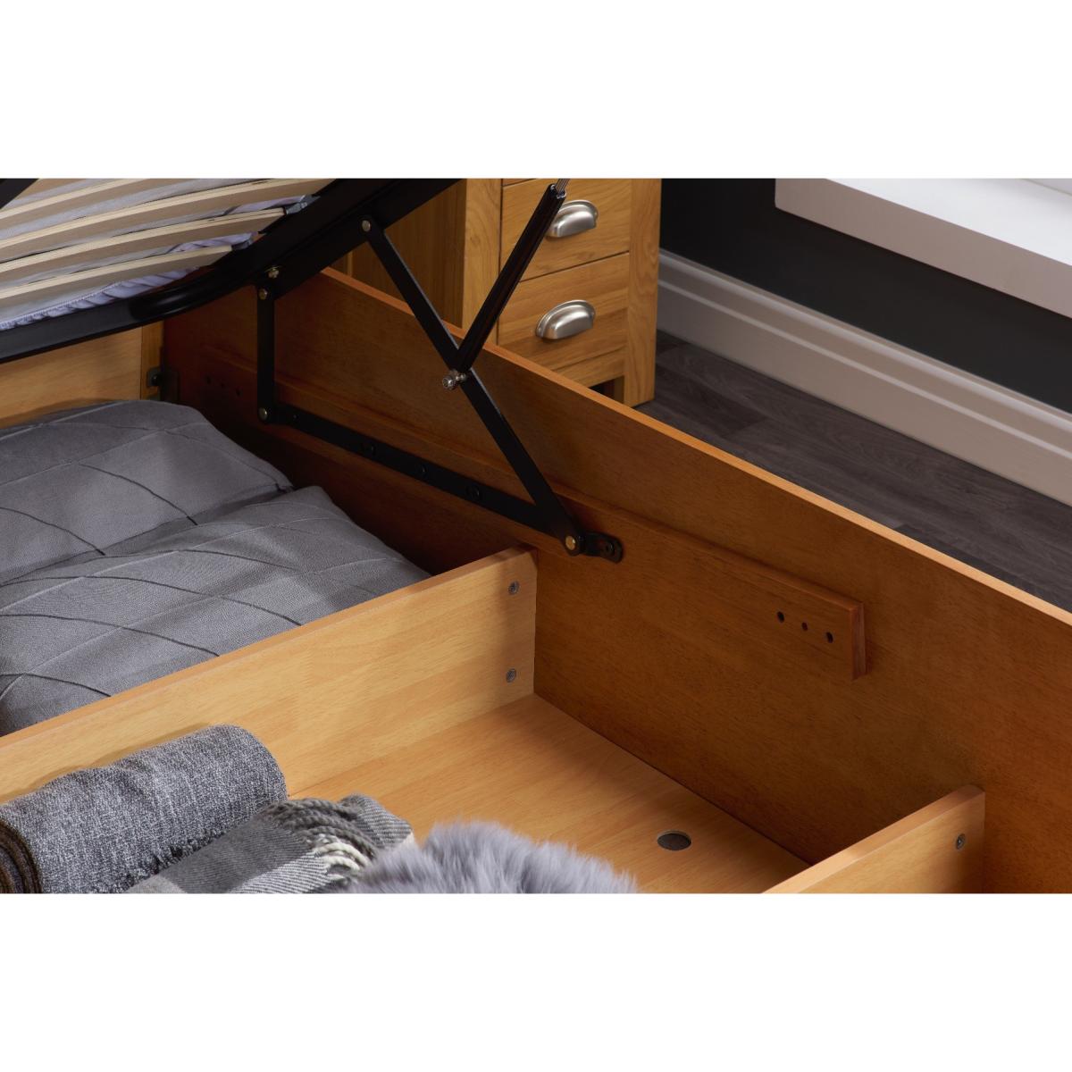 The stunning oak Detroit ottoman bed is a classic design which is also practical. The opening base offers plenty of storage and is support by strong gas lift arms. 150cm bed Plenty of storage Strong gas lift arms Sprung slatted base for ultimate comfort
