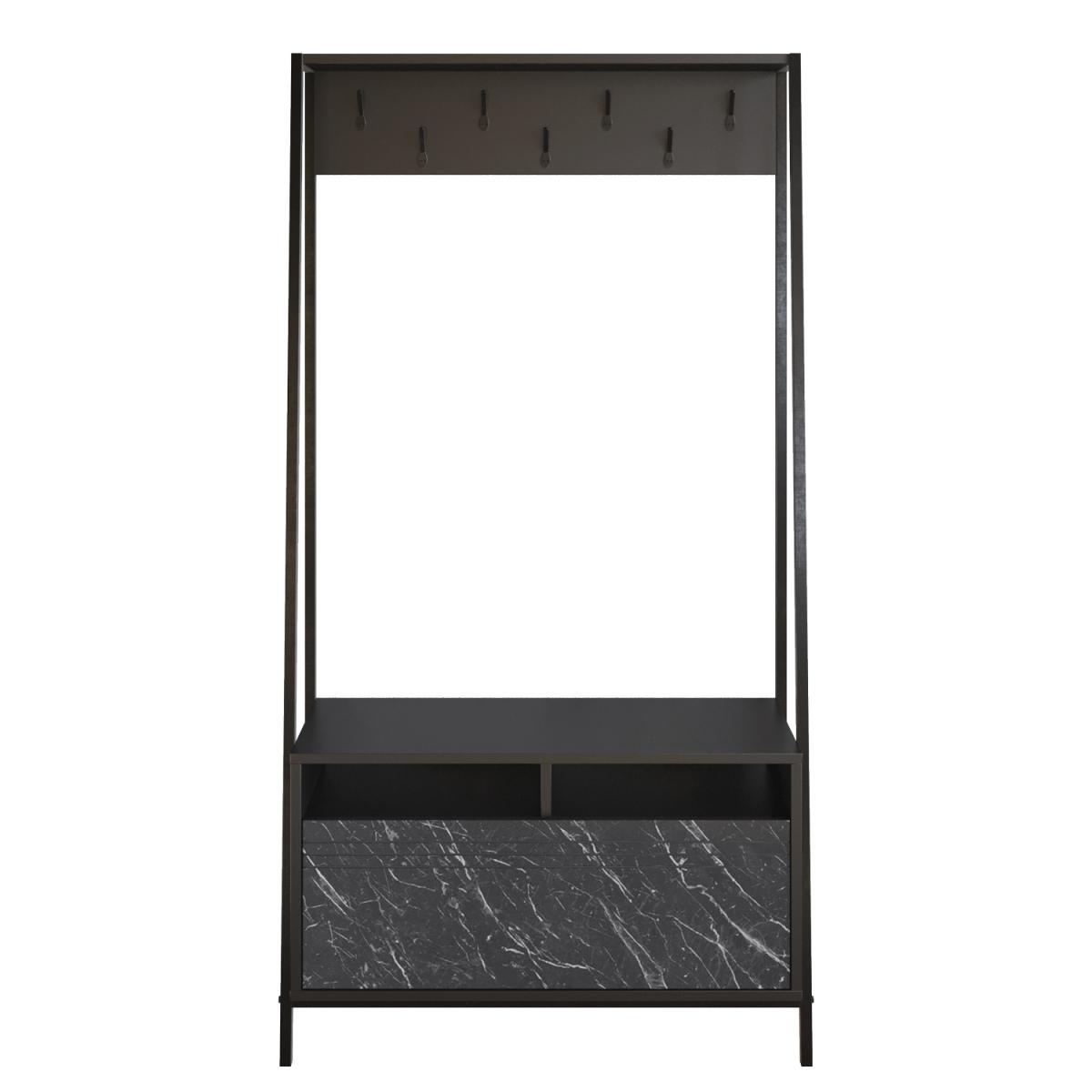 Devin 180cm tall hall tree is designed for entrance foyers and front halls. You can use its hooks to hold coats, hats, shoulder bags, scarves, and umbrellas. It also features 2 open shelves and a cabinet with a drop-down door for storage. While placing shoes on/in the open shelves, you can keep your personal belongings in the cabinet. The metal frame and carved straight lines on the drop-down door make the hatstand sturdier and more stunning. It is made of an 18mm thick standard quality melamine coated particle board and metal. Wood edges are banded with first-class PVC edge banding tape. The metal frame is coated with impact and scratch-resistant static paint. Overall, it is manufactured using eco-friendly and health-friendly TSE certified materials.