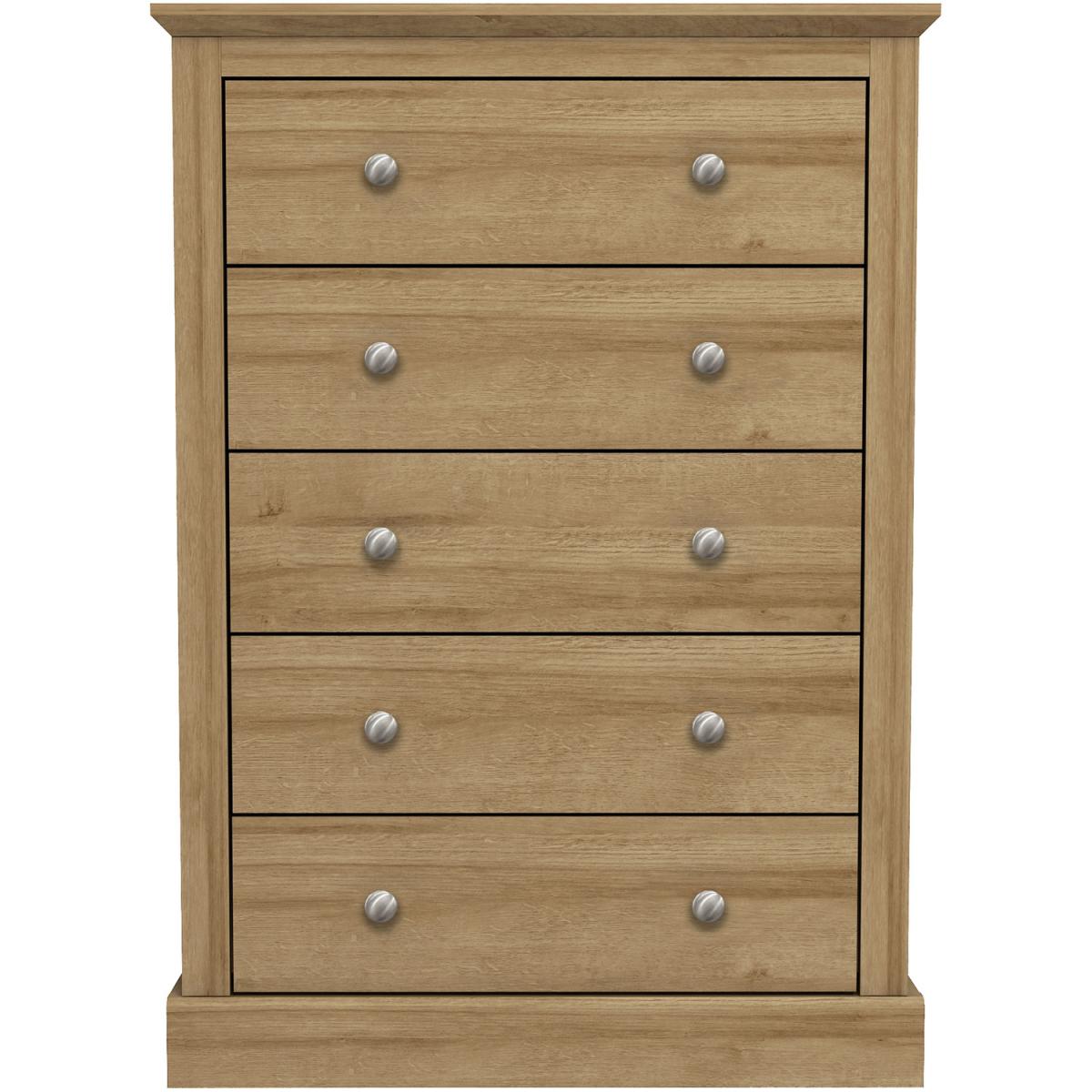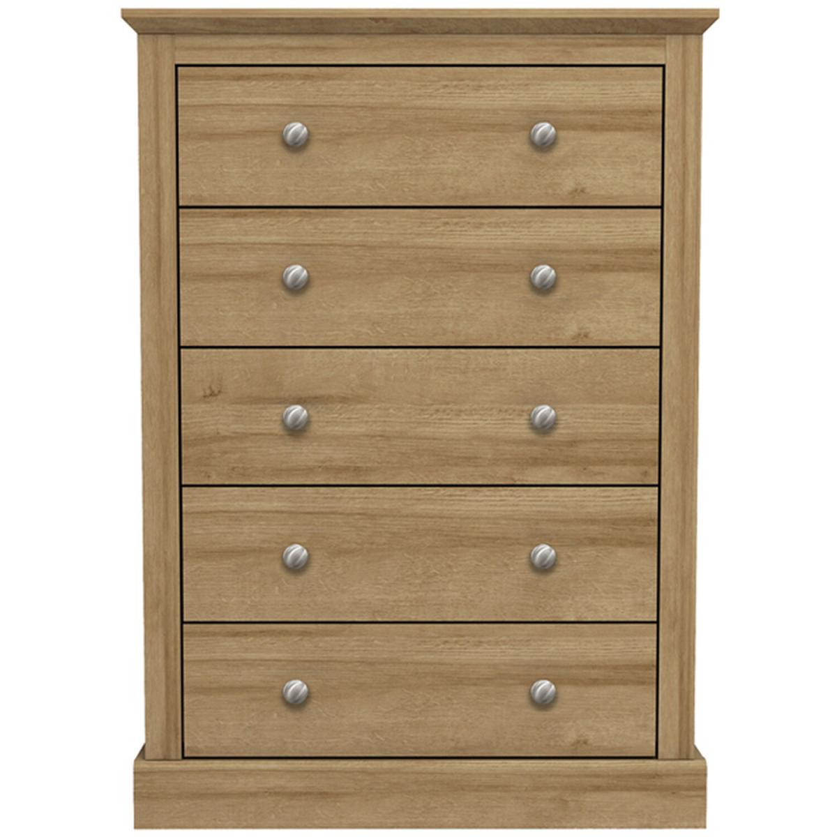 Introducing the Devon 5-Drawer Chest. This bedroom essential offers a traditional design that's ideal for coordinating with any decor. Featuring five drawers for your clothes, accessories, and more, this beautiful unit offers a timeless elegance to any home at an extremely affordable price.