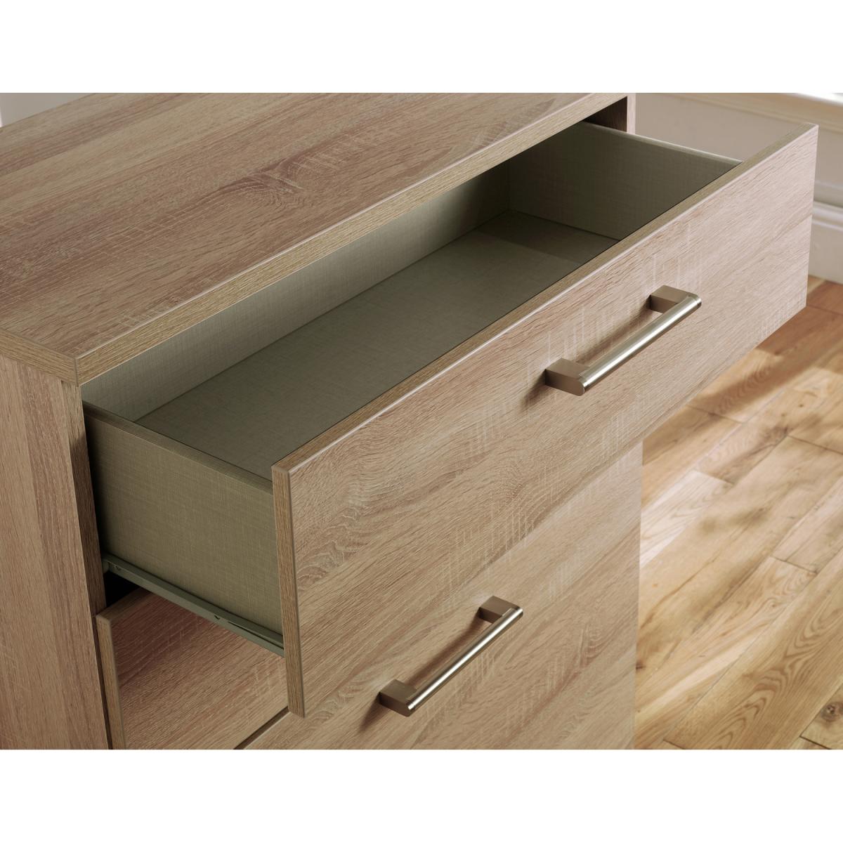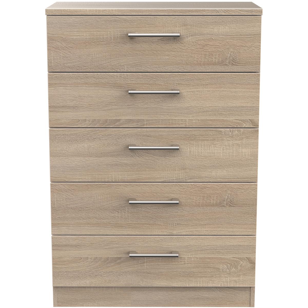 This wide 5 drawer chest of drawers is practical and stylish. Perfect for any home as a free standing storage unit. With its sleek metal handles and wood effect finish this stunning design gives both a traditional and contemporary feel to any room. Available in a number of different pieces to cater for your individual storage needs. All our furniture is made in the United Kingdom, to the highest quality. It is delivered direct to your location of choice by one of our two man delivery teams, and come full assembled (although legs may be removed to prevent damage in transit).