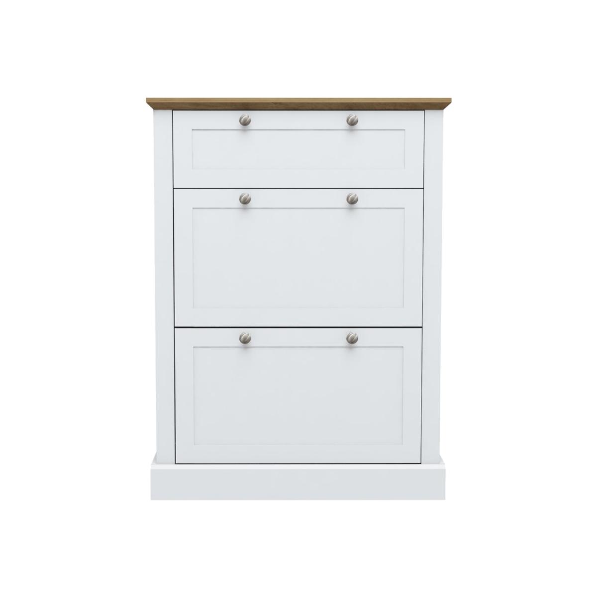 Dimensions W80.6 x H108.5 x D28.5 cm. This Devon shoe cabinet offers a traditional design. The Devon range comes in three stunning finishes. Oak/white oak/charcoal and oak. This extensive range offers a timeless elegance range to any home but at an affordable price. Features. White finish with oak top Chrome handles. Plenty of storage space to store your shoes. A spacious top provides an ideal place to display items. Versatile look that suits both modern and period surroundings. Assembly required..