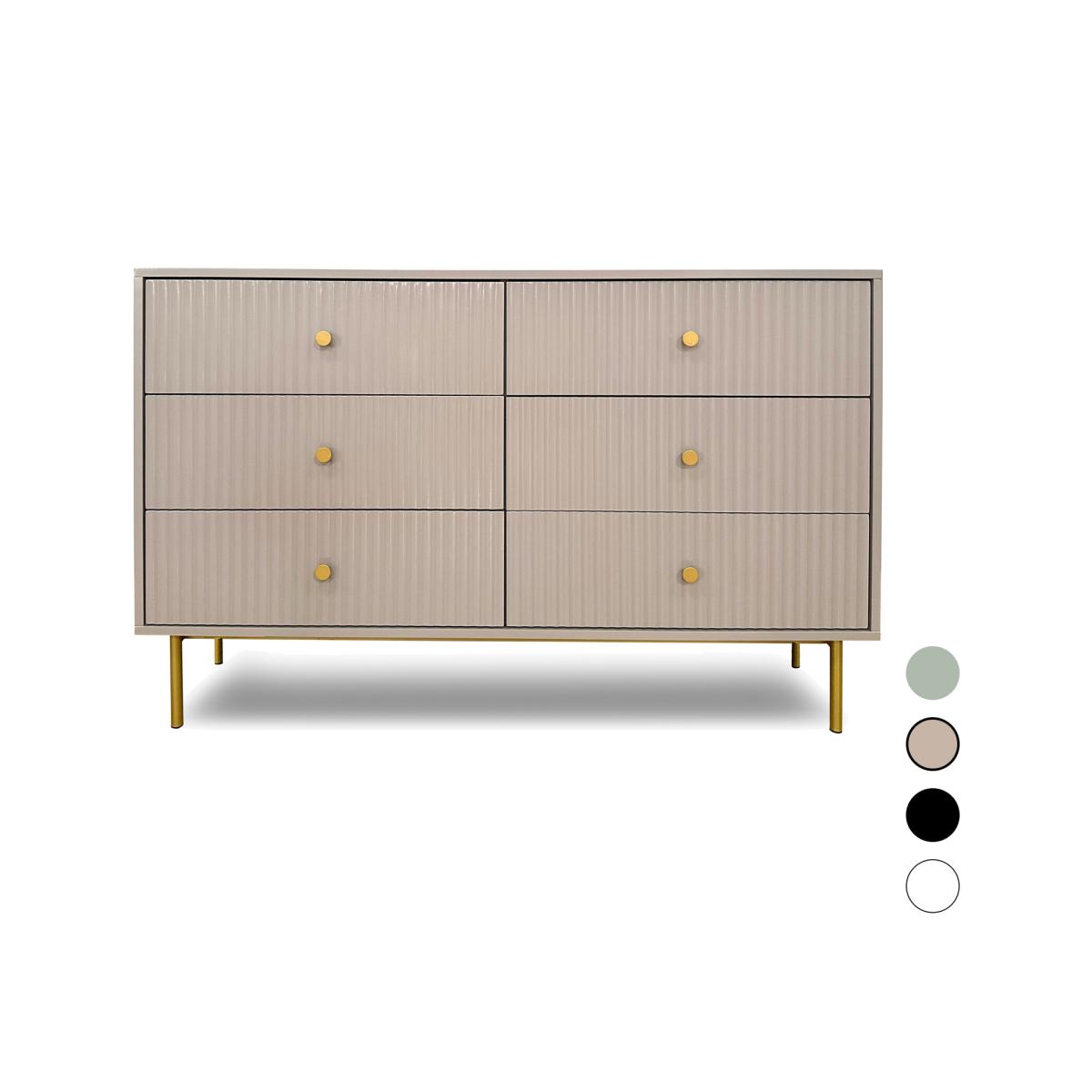 The Devon wide chest of 6 drawers is a sophisticated and functional piece designed to enhance bedroom storage solutions. This chest of drawers is constructed with a sturdy MDF frame, finished in a matte PU paint that is available in four colours white, black, grey and sage. The wide chest of drawers features six spacious drawers, providing ample space, making it an essential chest of drawers for bedroom. The metal handles and legs, coated with a durable golden powder finish, add a touch of elegance. This large chest of drawers combines practicality with aesthetic appeal, fitting seamlessly into various interior designs. The chest of drawer 6 offers a versatile storage solution, while the different colour options allow for customization. Whether you are looking for a functional storage unit or a stylish accent piece, the Devon 6 drawers chest is a perfect blend of utility and timeless design.