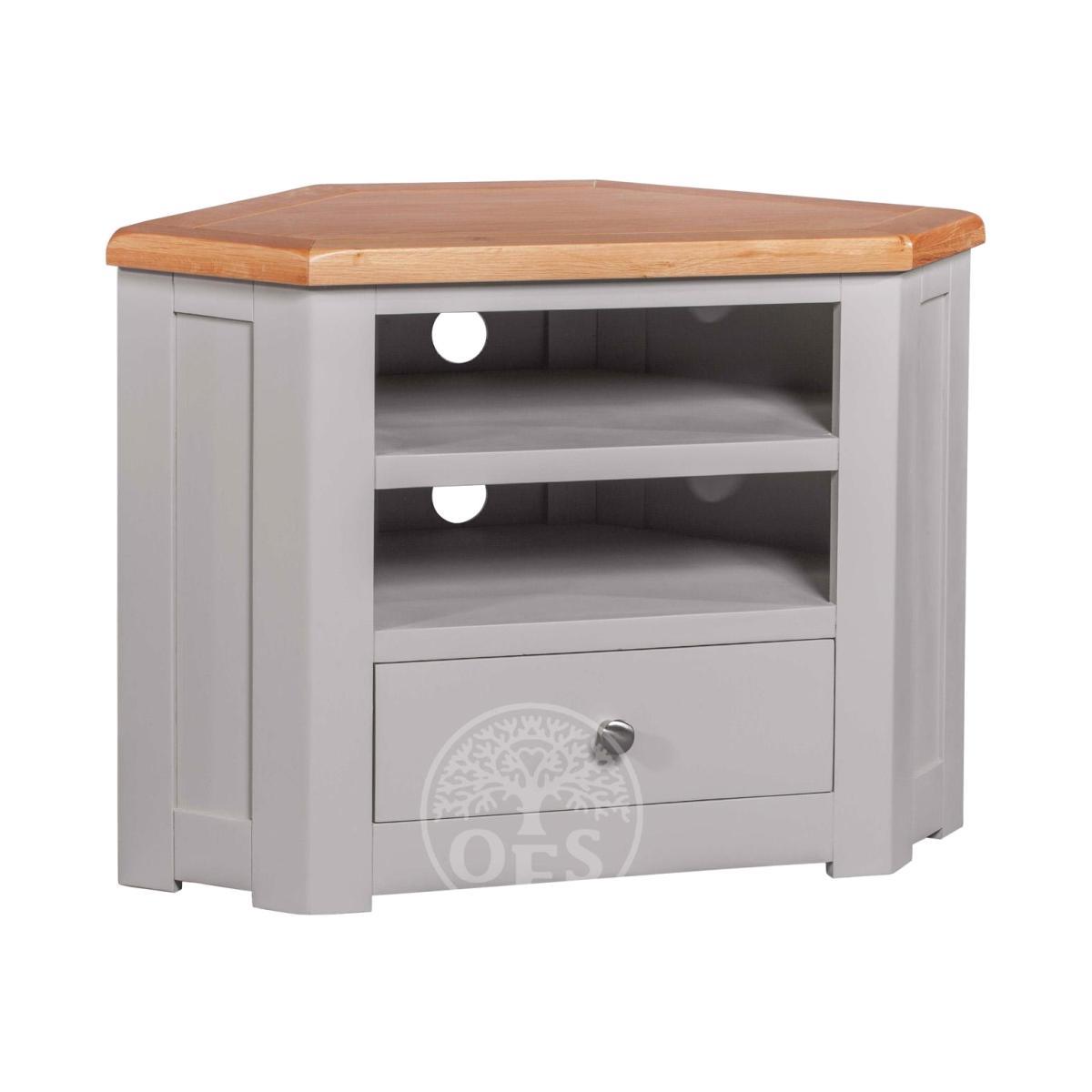 Designed to fit into the corner of your living space, the Devonshire Diamond Painted Corner TV Cabinet is a beautiful standalone piece to complement any décor. The sculpted edges give the cabinet a soft, modern look and make it the perfect shape to accommodate most large televisions. The Diamond TV Cabinet is made from a combination of materials including MDF, rubber wood, oak veneer and solid oak. Complete with a light grey painted finish and resilient lacquered top, the cabinet is both practical and stylish. Designed to be compact and space saving, the TV cabinet also features specially made holes at the back of the unit to keep cables tucked neatly away. Further items in the Devonshire Diamond Painted range are available to complement the Devonshire Diamond Painted Corner TV Cabinet.