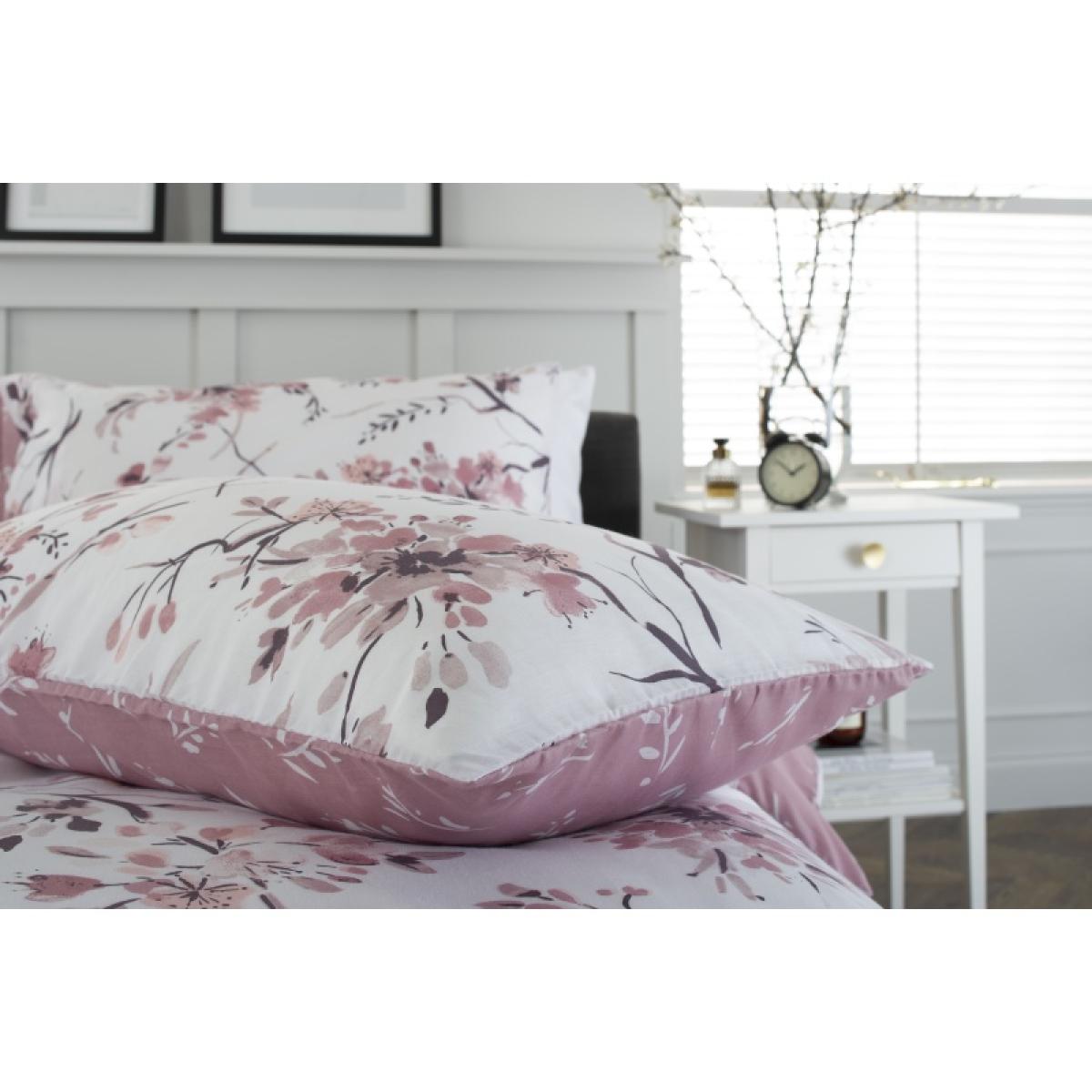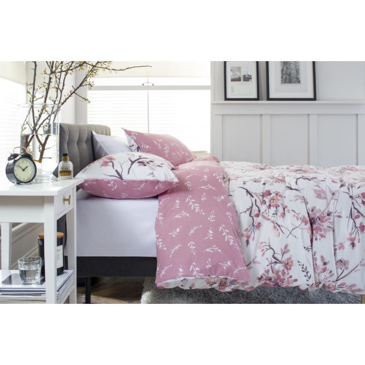 This 200 thread count cotton rich design is a beautiful addition to any bedroom space, featuring tranquil cherry blossom cascading down the bed on one side, and a stylish ditsy floral pattern on the reverse, for two looks in one. This set is made with 55 cotton sustainably sourced through the better cotton initiative. Features:. *55 Cotton 45 Polyester *200 Treadcount *Reversible *Button fastening *Single duvet includes a single pillowcase *Double, King and Super King duvet includes a pair of pillowcases Care Instructions:. *40. C Machine washable *Tumble dry on the lowest setting * Iron on low heat Please note. All screens vary in colour reproduction and whilst every effort has been made to display the colour as accurately as possible it is for guidance only...