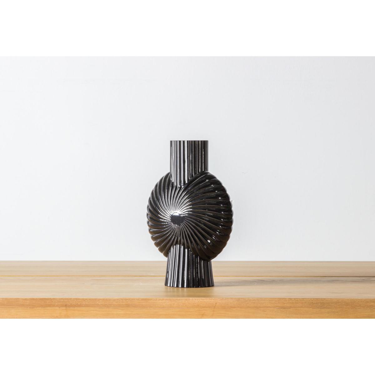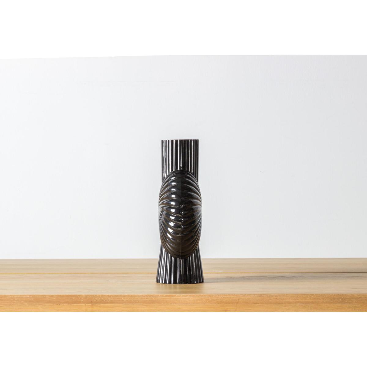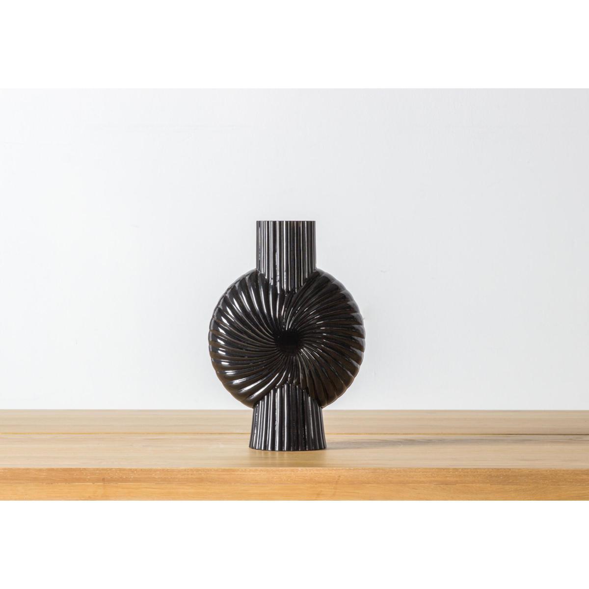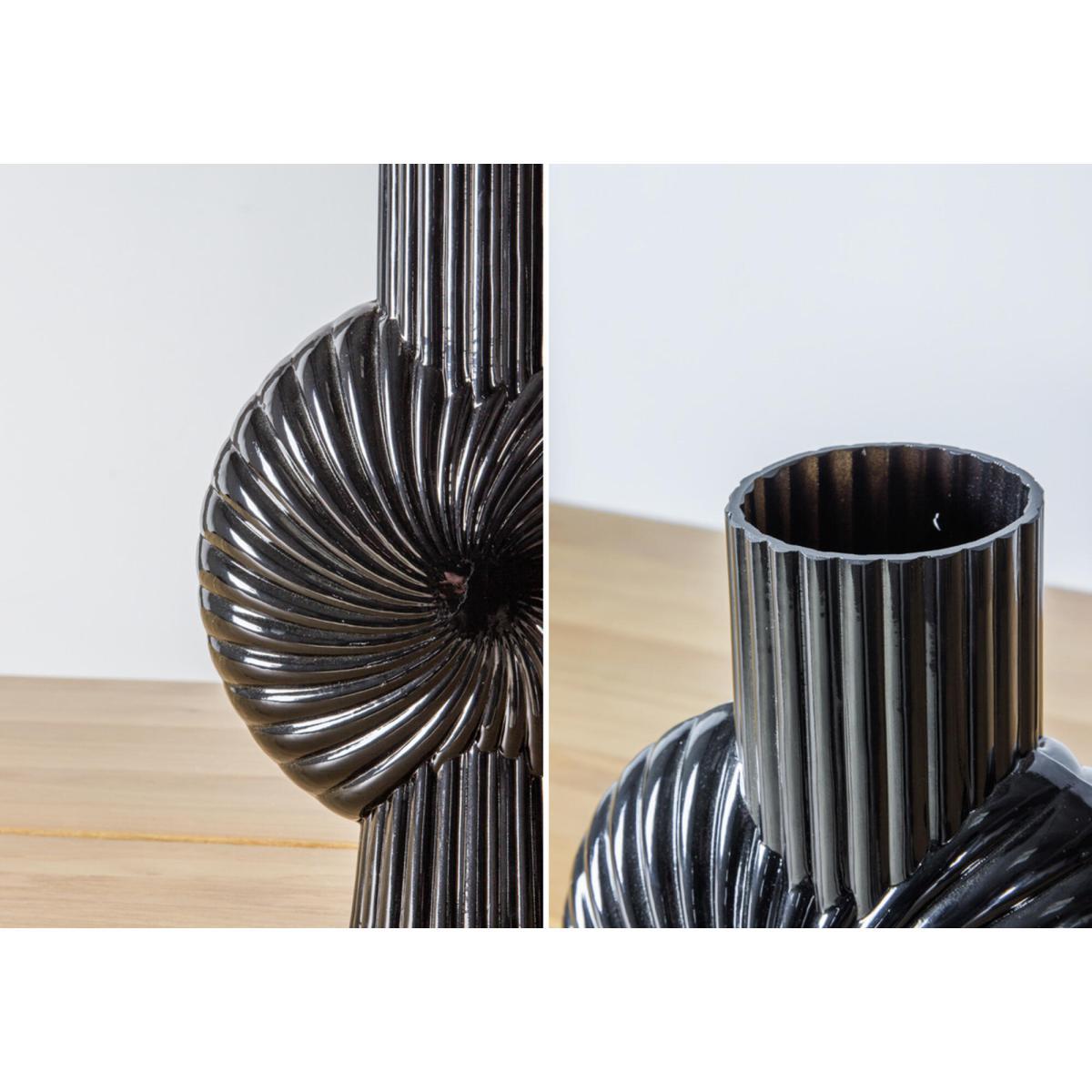 An eye-catching statement piece featuring an Art-Deco inspired swirl design crafted from glossy Black Glass, this vase is sure to stand out. Add some retro chic to your space.
