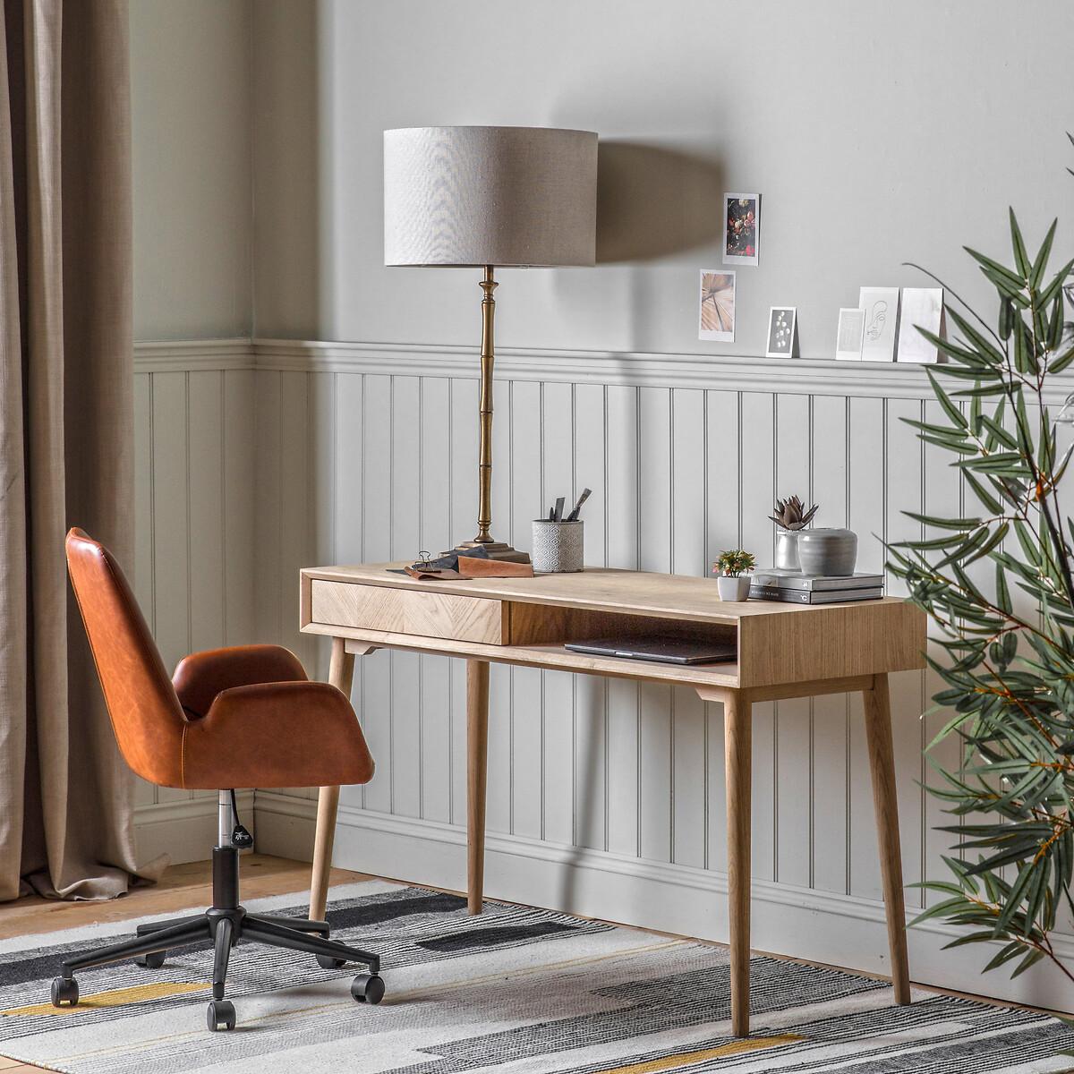 An eye-catching inlay chevron design, combined with a specialist matte lacquer finish to keep the timber looking natural and dry with brushed out grain, gives this desk a tactile appeal. Made using European oak and rustic oak structured veneers which show the natural beauty of the oak grain and knots, this stunning piece offers both style and practicality. Product Details:• Made with European oak• Open storage compartment• Single drawer for more practical storage space• Full assembly required• 1 year manufacturers warranty. Product Composition - Oak veneered MDF, Solid Oak. Product Dimensions - 57 cm x 137 cm x 24 cm, Weight 32 kg. Storage compartment dimensions - 54.1 x 36.6 cm Package Dimensions - 137 cm x 57 cm x 24 cm, Weight 32 kg. This product will be dispatched by one of our trusted suppliers. You’ll be contacted by their selected courier about your delivery. Please note: this product cannot be delivered to all Offshore Islands, Northern Ireland or Republic of Ireland.