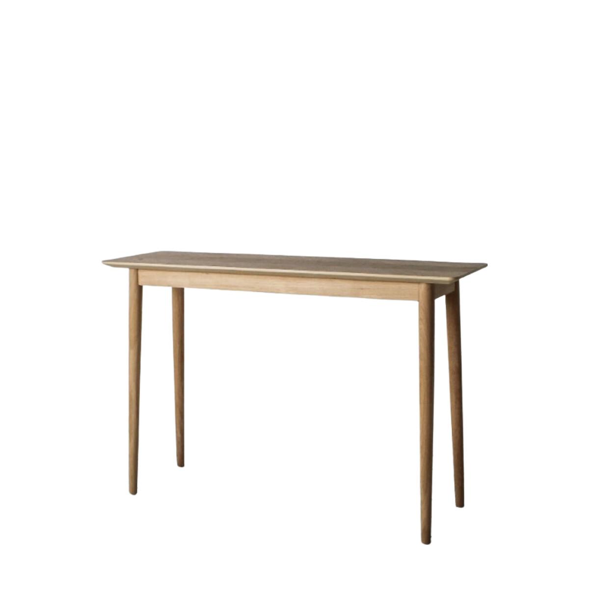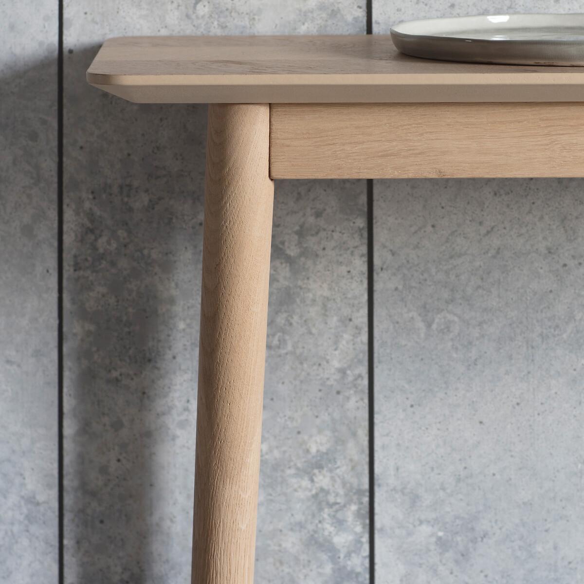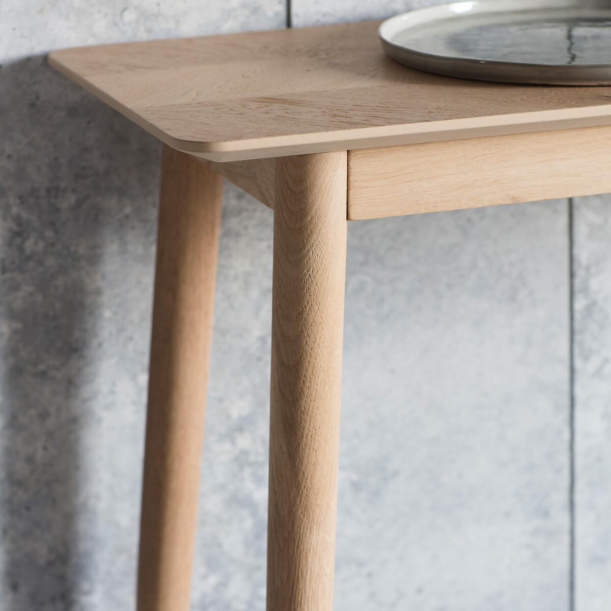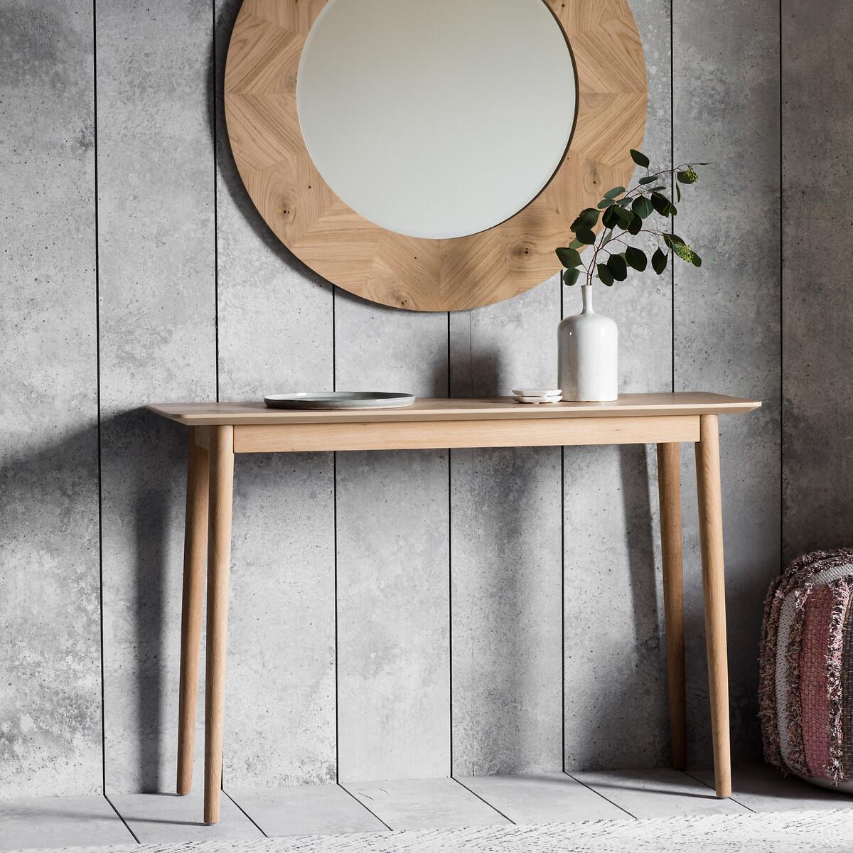 This stunning console table features a beautiful inlay chevron design, and is made using European oak and rustic oak structured veneers which show the natural beauty of the oak grain and knots. Finished in a specialist mat lacquer, which keeps the timber looking natural and dry, with brushed out grain, the table is tactile to the touch and looks amazing. The console table looks great with the coordinating mirror above it. Product Details:• Made using European oak• Partial assembly required• 1 year manufacturers warranty. Product Composition - Oak. Product Dimensions - 45 cm x 127 cm x 13 cm, Weight 15 kg. Package Dimensions - 127 cm x 45 cm x 13 cm, Weight 15 kg. This product will be dispatched by one of our trusted suppliers. You’ll be contacted by their selected courier about your delivery. Please note: this product cannot be delivered to all Offshore Islands, Northern Ireland or Republic of Ireland.
