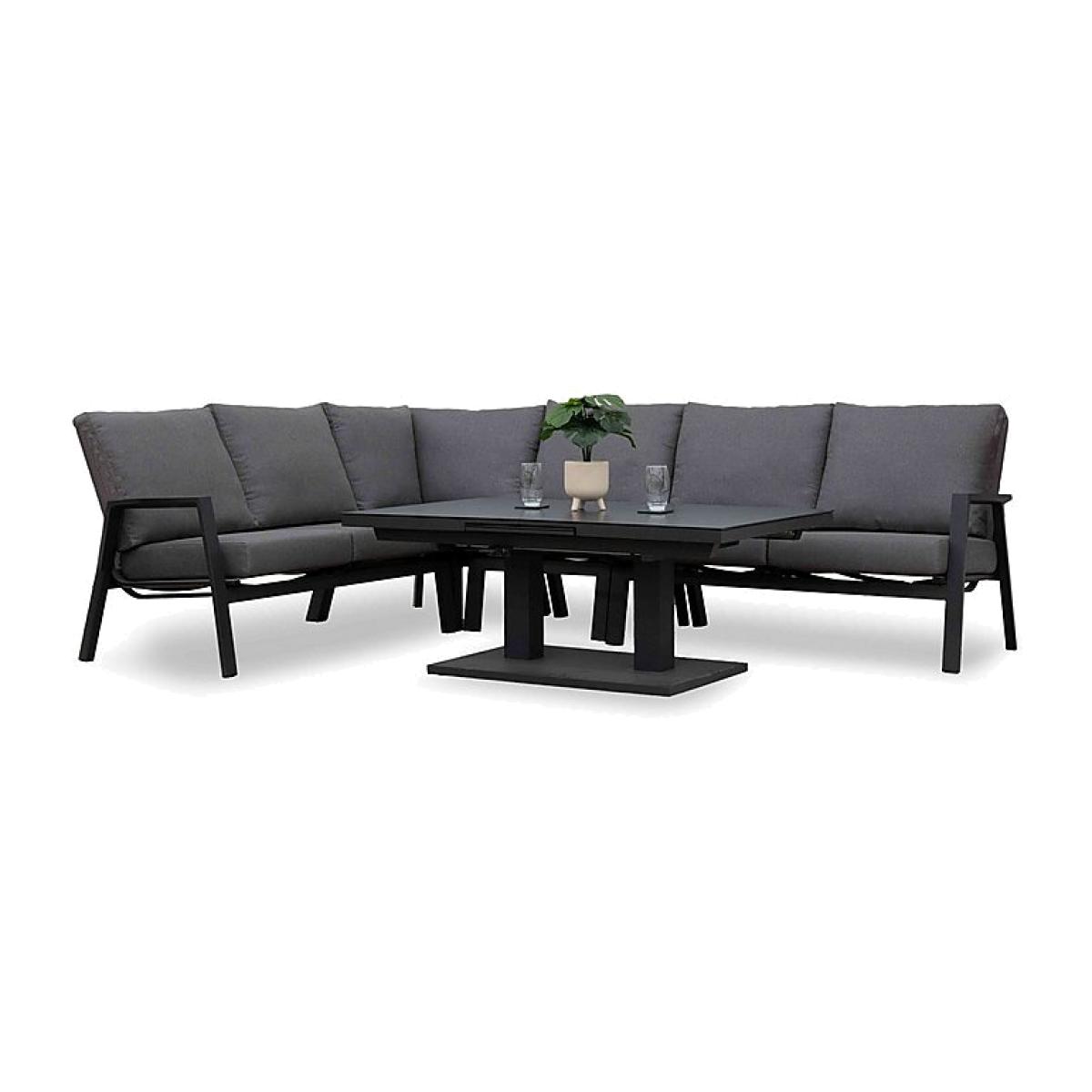 Relax on the corner sofa with a cold beverage close at hand on the ceramic- effect table or use this garden furniture set as an outdoor dining set. This set is the essence of stylish versatility. Why you'll love it Understated, elegant and practical – this is the garden furniture for you. Low- maintenance finish, high- end outdoor style. This outdoor furniture set includes a corner sofa and a rising extending dining table. Rising dining table extends to seat 8 and has a stylish ceramic- effect top. Weatherproof aluminium sofa and table frames with a grey powder- coated finish. Sofa cushions are shower resistant. Truly comfortable sofa seat and back support in breathable, long- lasting Textilene fabric. And thanks to the Textilene, the sofa is just as aesthetically pleasing without the cushions. The rising dining table is height- adjustable from 50 cm to 73 cm. 2- year frame guarantee. This garden corner sofa dining set is part of the Dia range. What you need to know Aluminium frames. Dining table seats up to 6 closed and 8 when extended. Cushions should be stored indoors during wet weather and when not in use. Self- assembly required.