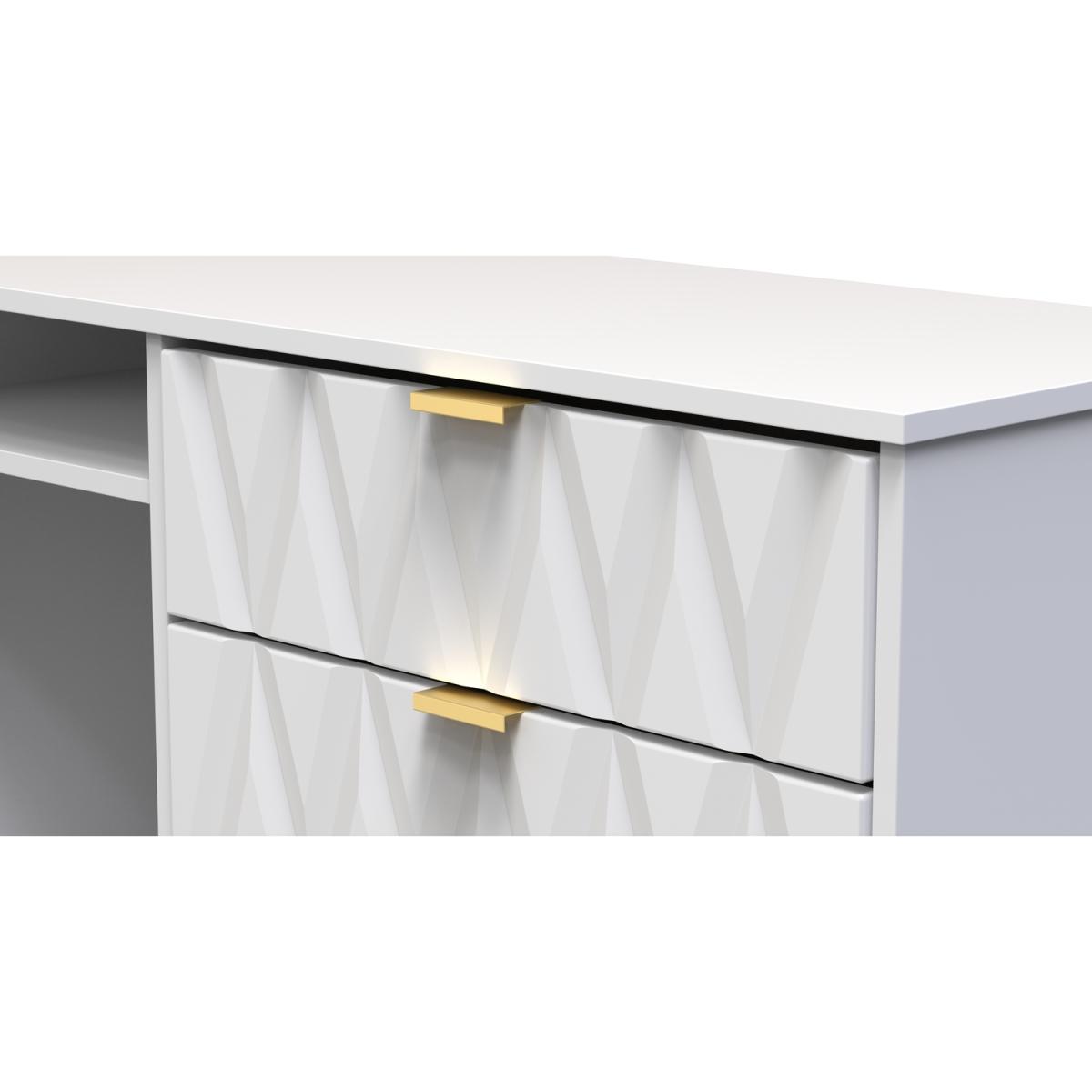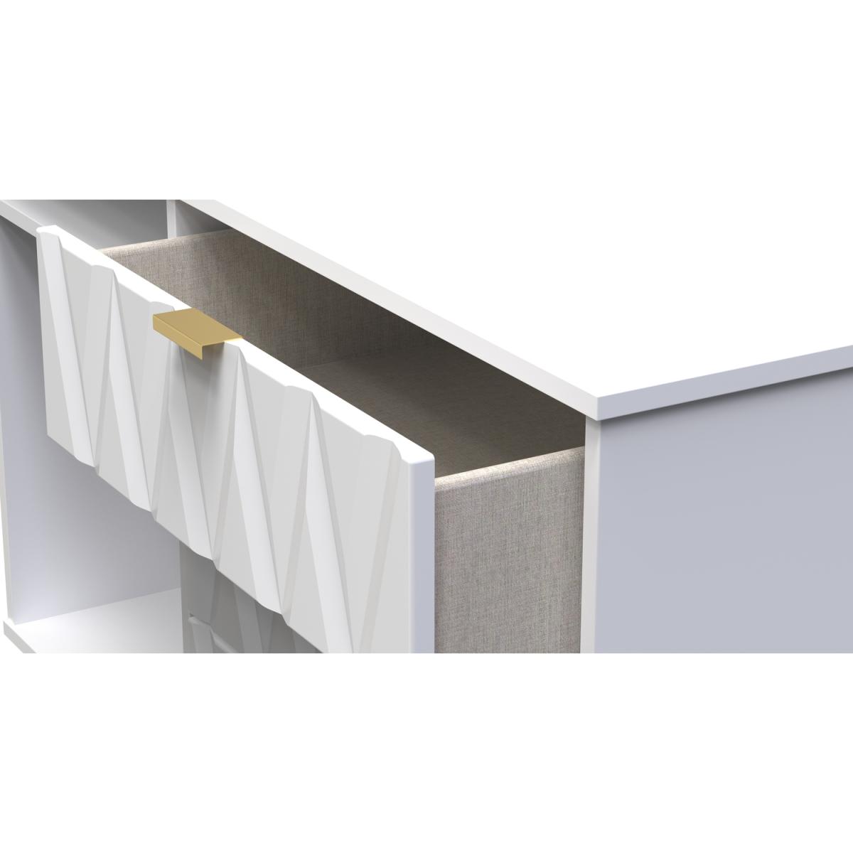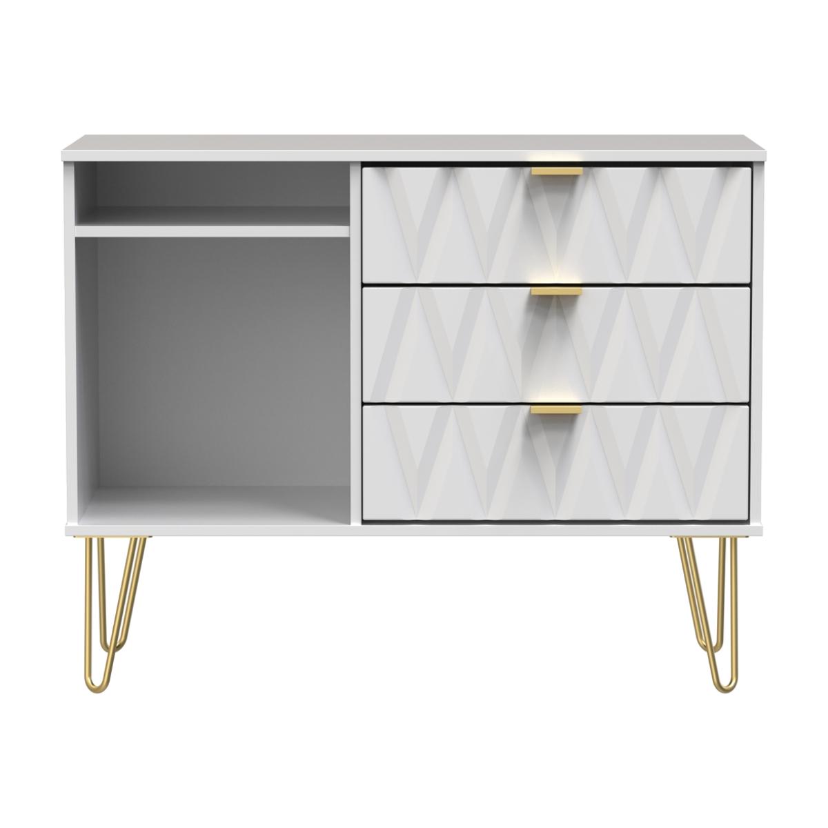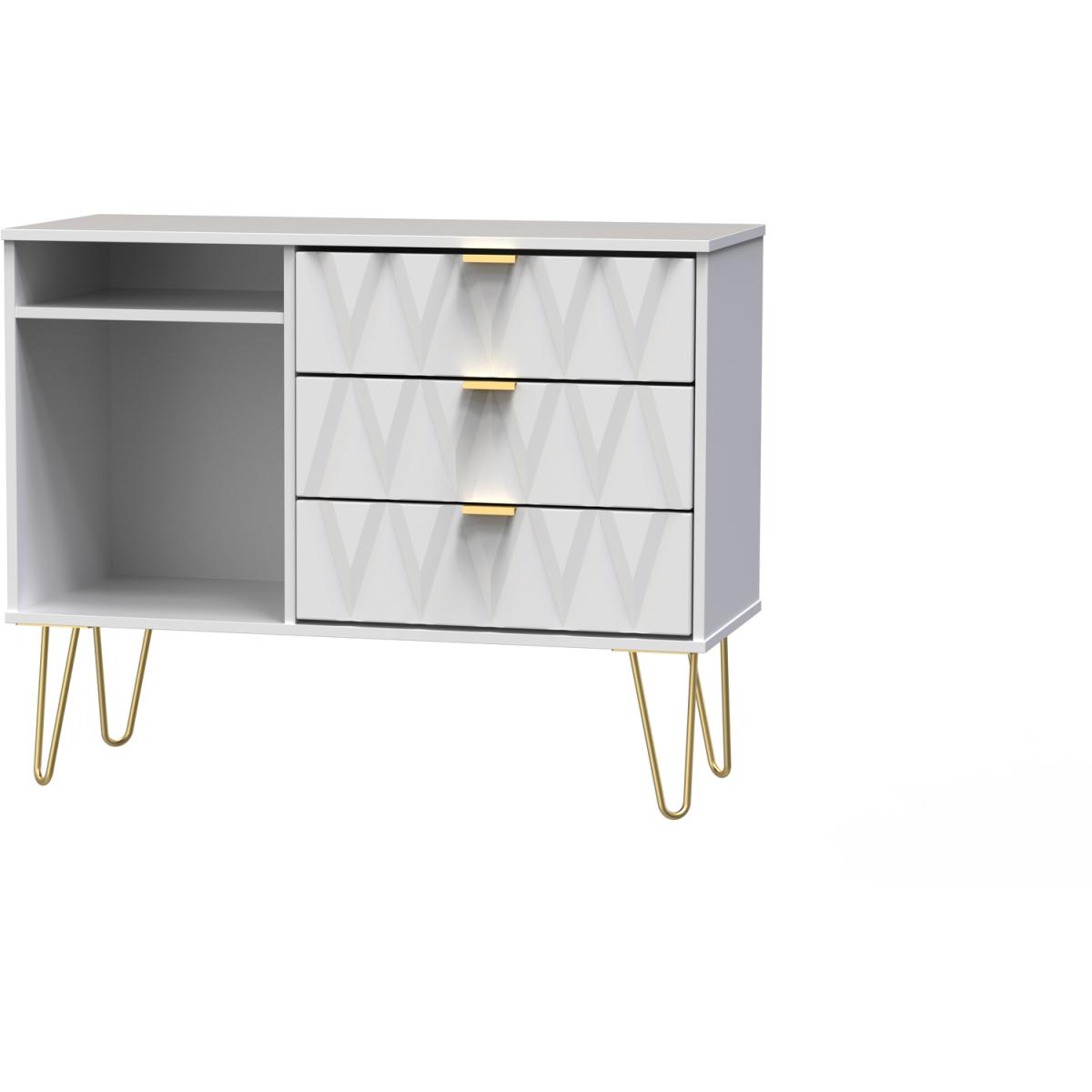 This modern storage unit features 3 drawers and a large storage area with a single shelf. Can be used as a TVMedia unit or sideboard. Say hello to contemporary cool with the Diamond range, with distinctive patterned drawers and a variety of colour options available to compliment any interior design. Gold metal handles and sturdy hairpin legs complete the storage solution. All our furniture is made in the United Kingdom, to the highest quality. It is delivered direct to your location of choice by one of our two man delivery teams, and come full assembled (although legs may be removed to prevent damage in transit).