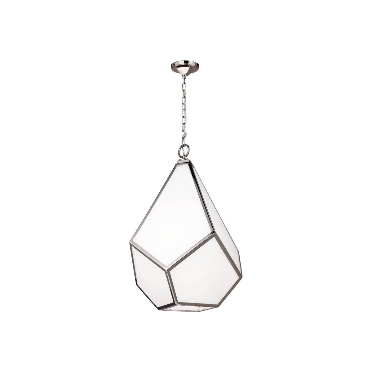 Inspired by stained glass this large pendant chandelier features modern, large scale pendants with dramatic facets made of individual panes of glass in a metal frame. The opal white glass creates a warm glow and hides the internal lamping. Also available in this range Wall Light, Small Pendant, Medium Pendant, and Flush Mount.