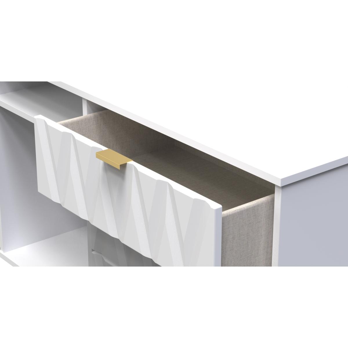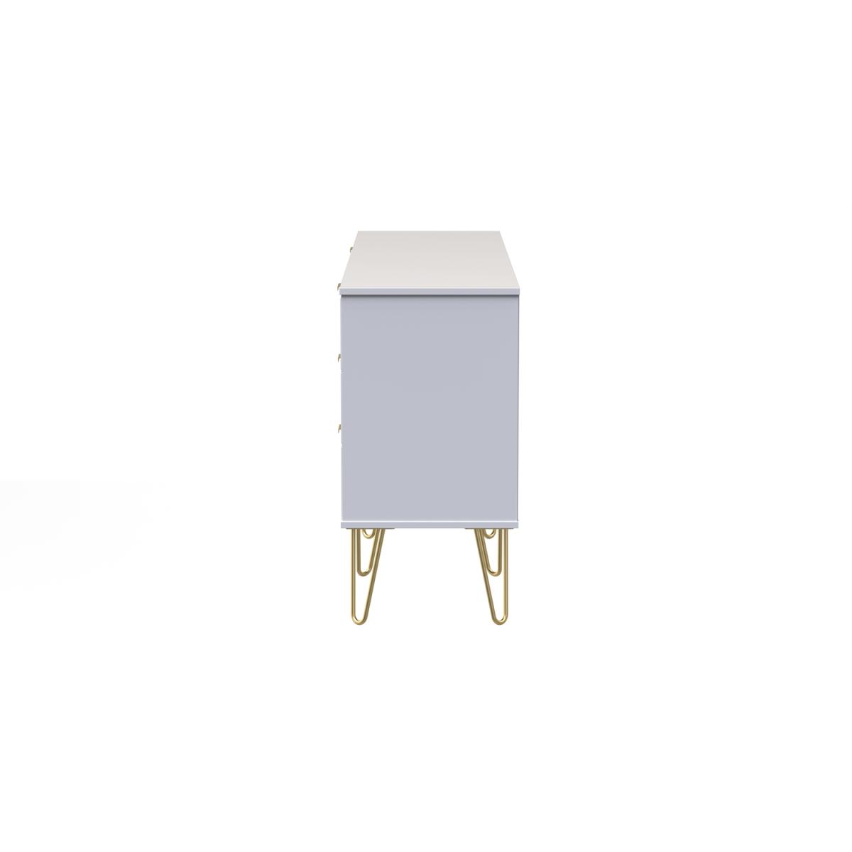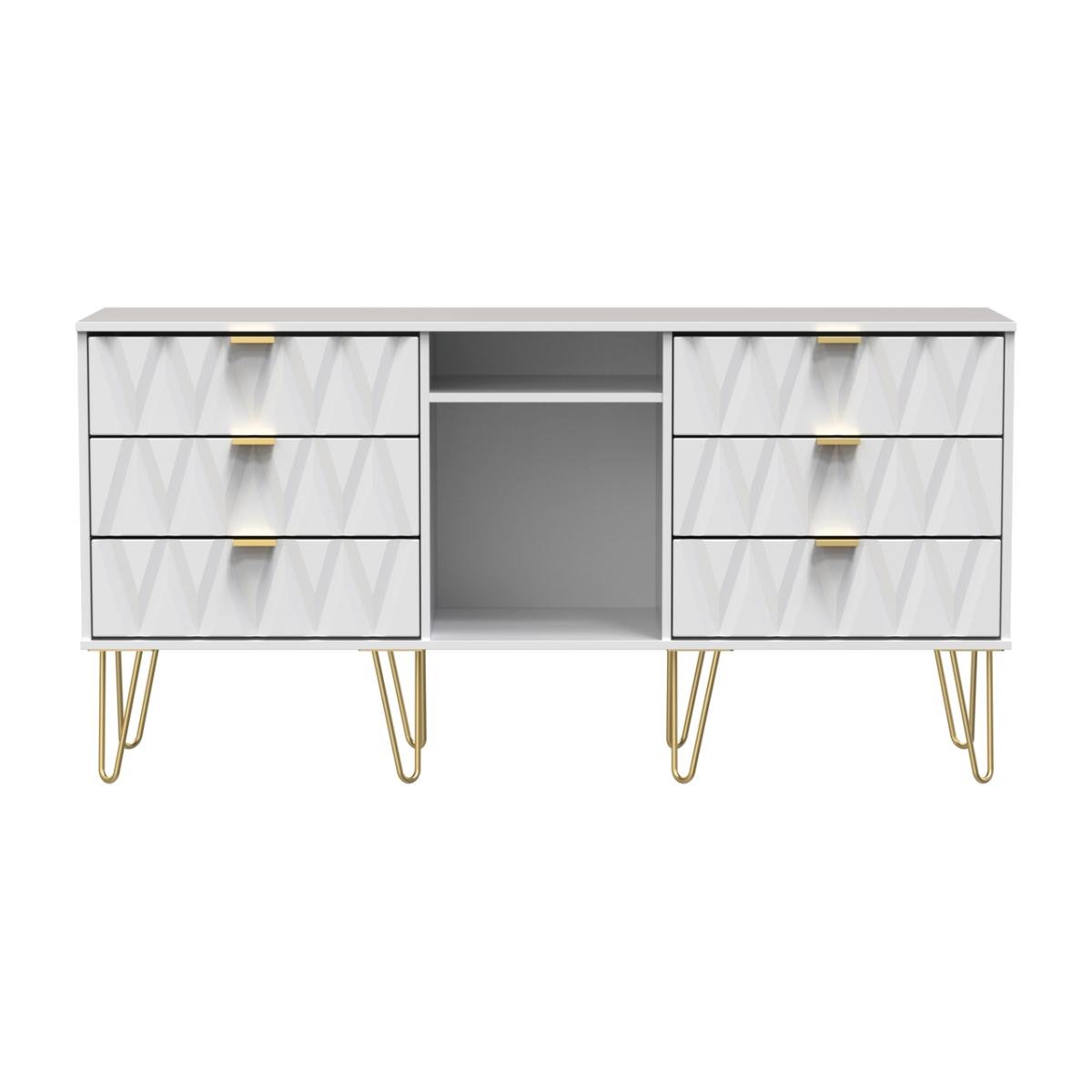 This wide storage unit features 6 storage drawers with a central shelf. Suitable for use as a TVMedia unit or sideboard. Say hello to contemporary cool with the Diamond range, with distinctive patterned drawers and a variety of colour options available to compliment any interior design. Gold metal handles and sturdy hairpin legs complete the storage solution. All our furniture is made in the United Kingdom, to the highest quality. It is delivered direct to your location of choice by one of our two man delivery teams, and come full assembled (although legs may be removed to prevent damage in transit).