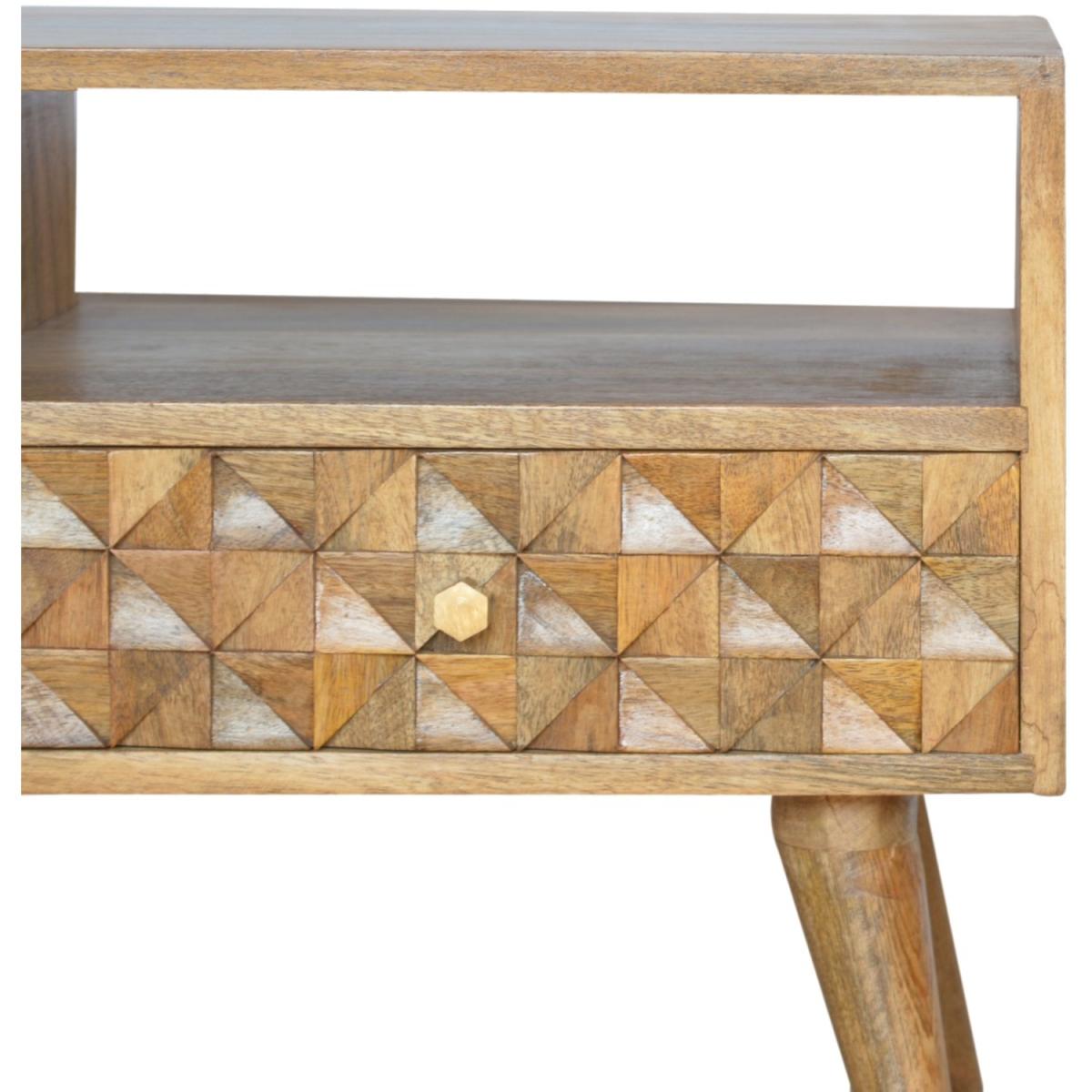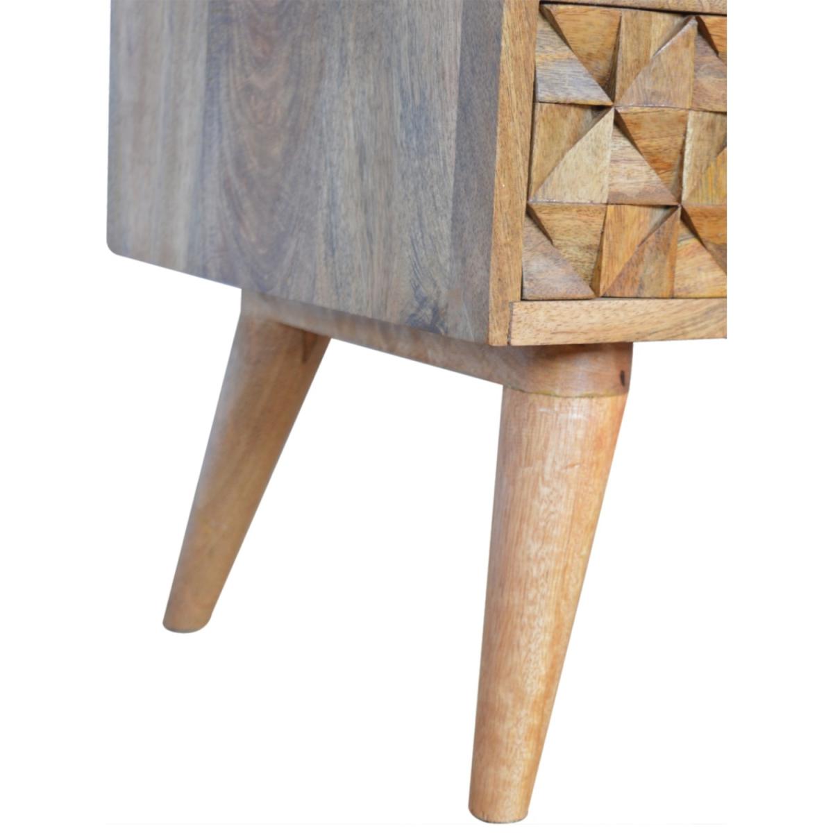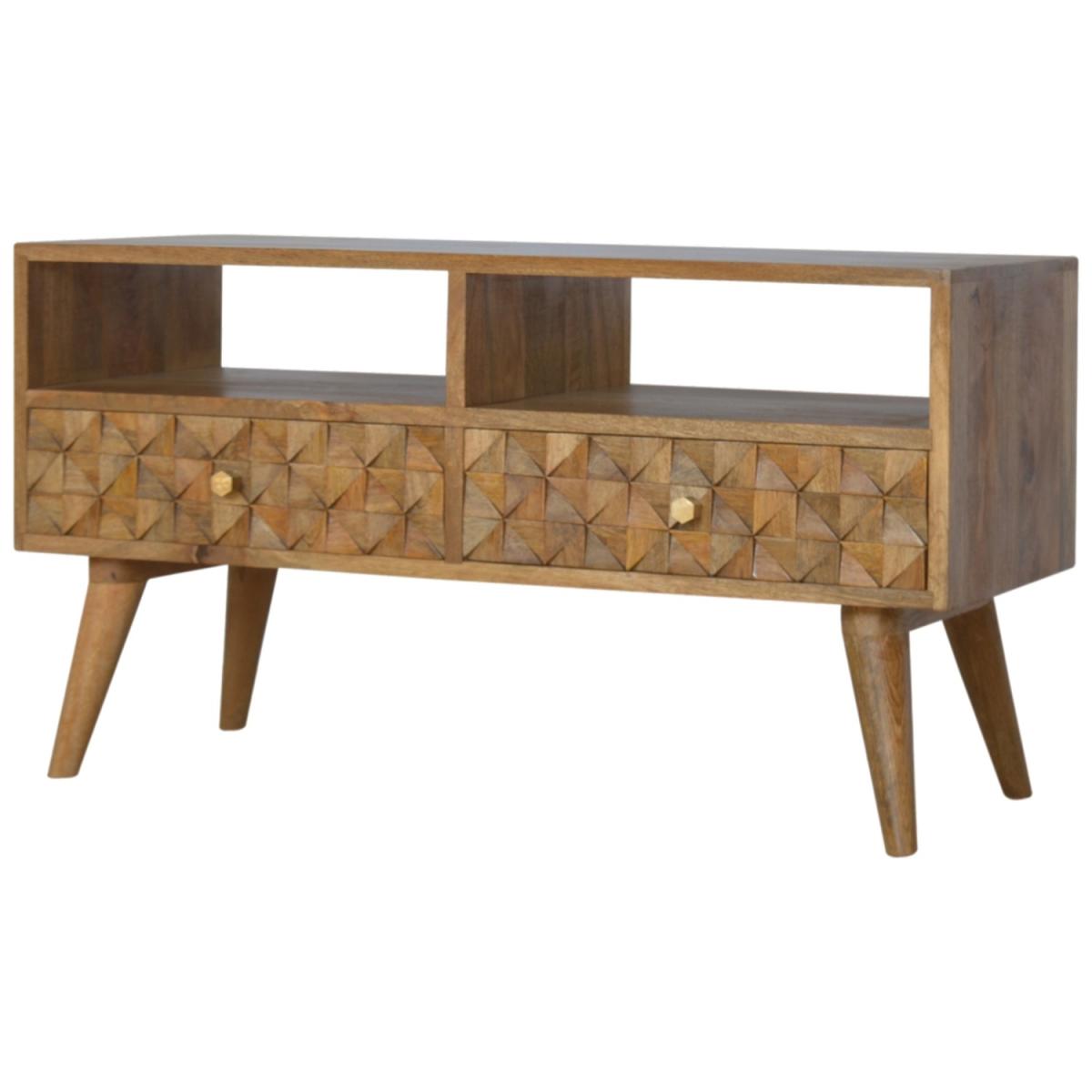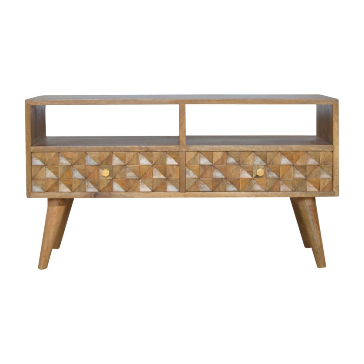 The main feature of this media unit is the 2 hand-carved diamond drawer fronts that make the pieces from this collection stand out. It has been constructed from 100% solid mango wood in an oak-ish finish, features 2 open slots for extra storage, and stands on 4 Nordic-style legs. It can be partnered with the other pieces from the range or stand individually as its style is versatile and can fit into different types of interiors.