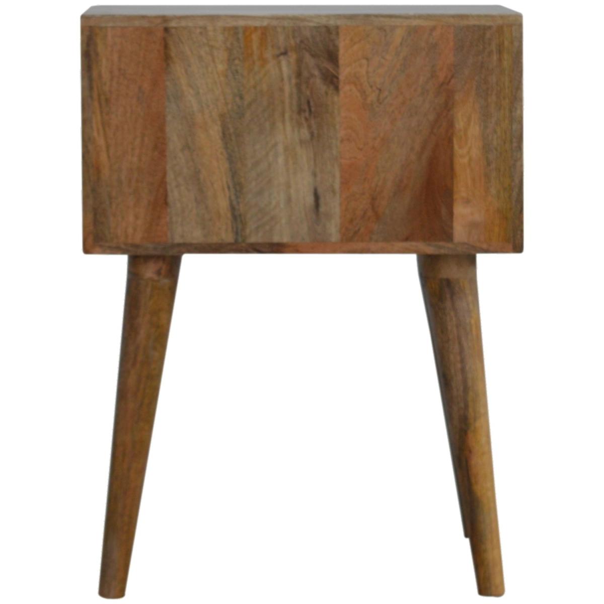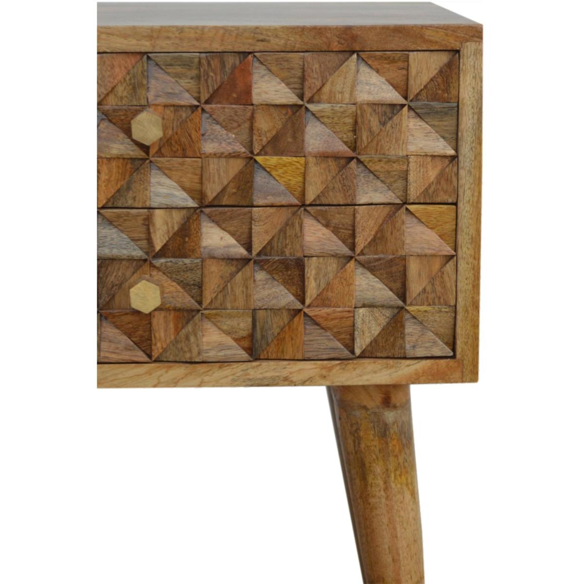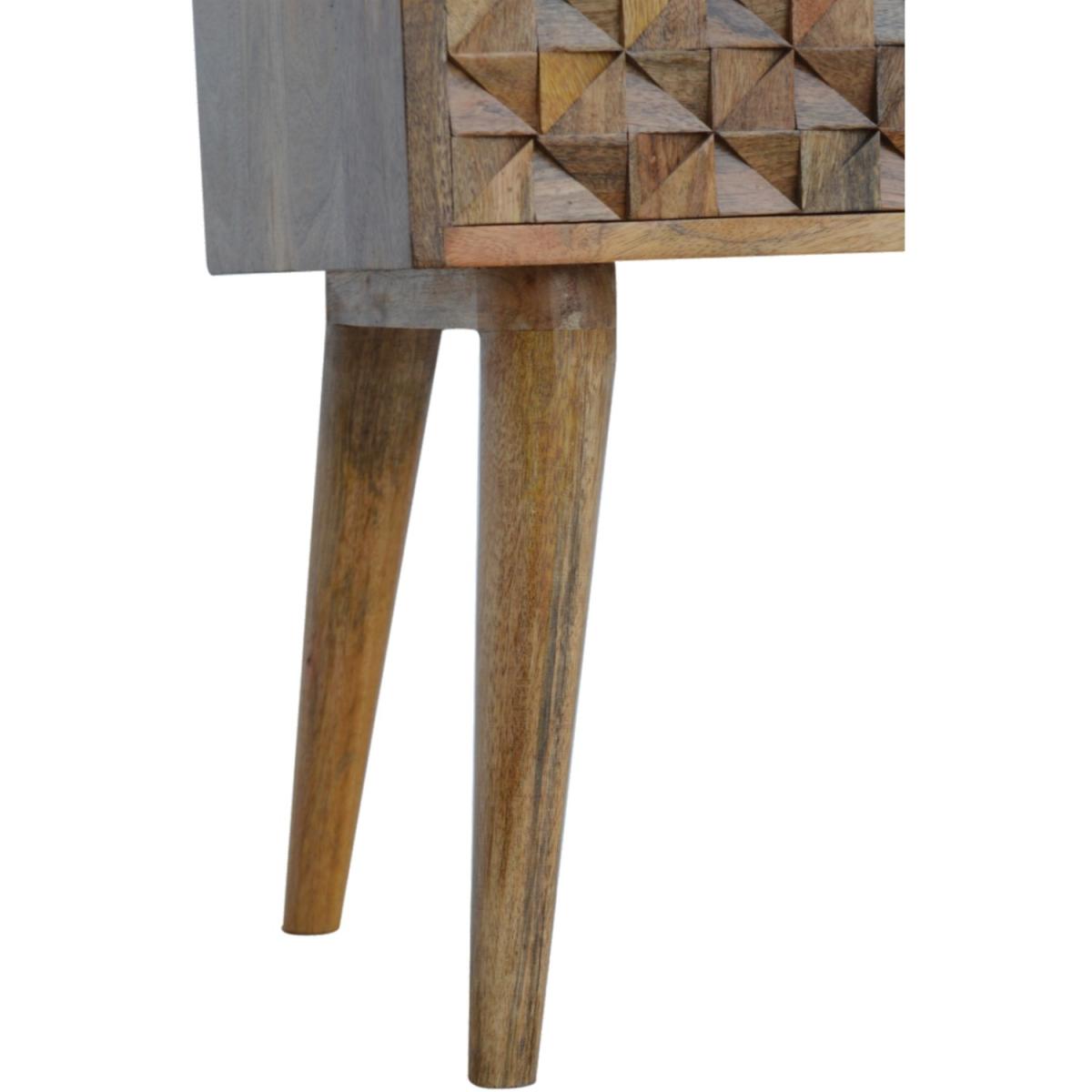 The main feature of this bedside is the hand-carved cube drawer fronts which make the pieces from this collection stand out. It has been constructed from 100 solid mango wood in an oak-ish finish and stands on 4 Nordic-style legs. It can be partnered with the other pieces from the range or stand individually as its style is versatile and can fit into different types of interiors.