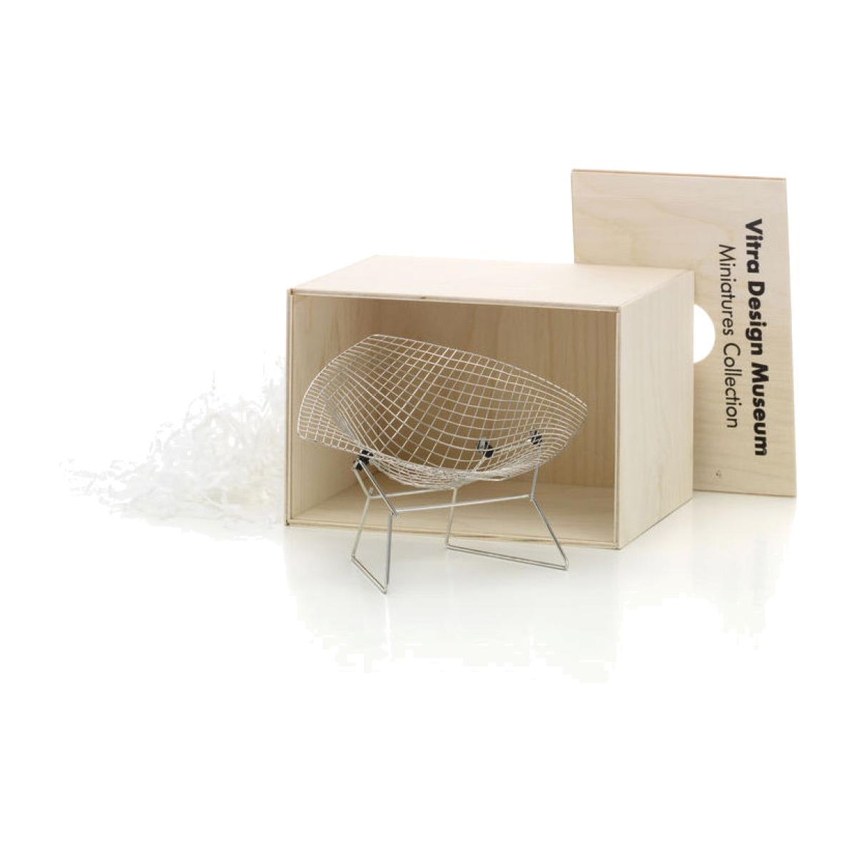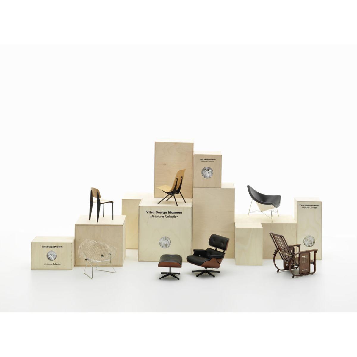 “Located in Weil am Rhein in Germany (near the Swiss border), the Vitra Design Museum is a privately funded museum that showcases the unique design collection of the Swiss furniture manufacturer Vitra. The Vitra Design Museum collection is one of the most important furniture design collections in the world. It contains around 7,000 pieces of furniture, more than a thousand lighting pieces, numerous archives and the inherited series of famous designers such as Charles & Ray Eames, Verner Panton and Alexander Girard. The Vitra Design Museum's collection of miniatures, which started more than 20 years ago, is an illustration of the milestones in the history of design. This collection encompasses the entire history of industrial furniture from the 1800s to present day, creating a pathway through time leading to the creation of modern seating, from historicism and Art Nouveau to Bauhaus and New Objectivity, Radical Design and Postmodernism to present day. A magnificent collection of emblematic works is presented to you. These chairs that have taken their place in history all carry the memories of their times: Materials, shapes, colours. They reveal the often forgotten dreams of their time, the (sometimes utopian) aspirations of their designers, but above all to their vision of the world. The chairs are reproduced on a one-sixth scale and faithfully replicate the original historical model down to the smallest details in the design, material and colour shade. This precise detail is also applied to the wood grain, the reproduction of the screws and the meticulous methods of handcrafting. These miniatures are not only valuable collector's items, but are also an educational tool for universities, design schools and architects. Rolf Fehlbaum, President of Vitra: “We can deduce and understand an era, its social order, its materials, its techniques and its taste by observing its chairs. I should point out that no other everyday object offers such diversity. '’ Harry Bertoia is a Italian-born designer, painter and sculptor with American nationality. He is renowned for his sculptural, organic and functional approach to design. Passionate about sculpture, he transposes the techniques of this art to create chairs with a sculptural design. They therefore have the particular feature of being made of braided steel wire, which offers an original and seductive perception of shapes, space and geometry. The "Diamond chair" (1952), the "Bird chair" (1956) and the "Barstool chair" (1952) are his most outstanding works. Unusual, functional and daring, this diamond-shaped metal structure is constructed from an ergonomic mesh supported by four infinitely filiform legs, and seems to float. Imagined as a metal drainer, the famous seat is "mainly made of air, like a sculpture, and crossed by space", explains the designer. The hand-bent and welded wires are the basis of the reputation of this geometrically curved work, which is said to be one of the lightest chairs in the history of furniture, but also one of the best-sellers. ".
