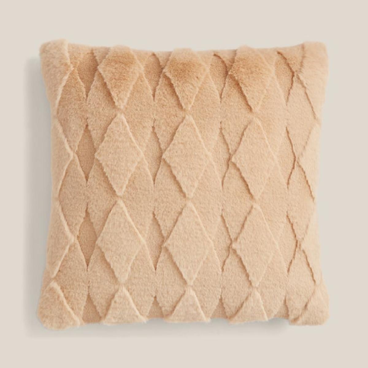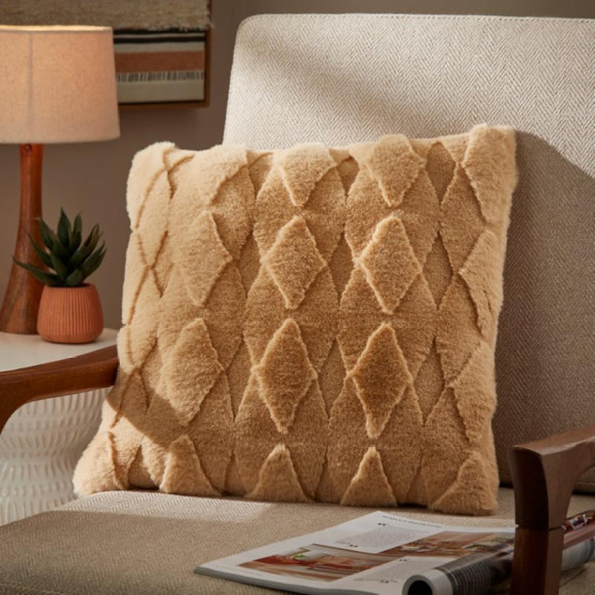 * Warm sand colour * Textured diamond design * Plush faux fur cover * Polyester fibre filling * Hidden zip Bring a touch of warmth to your space with the Diamond Faux Fur Square Cushion in a soft sand tone. Its size is ideal for sofas, beds or accent chairs, adding a cosy layer wherever it’s placed. The plush faux fur features a striking diamond pattern for a hint of luxury. Finished with a hidden zip for a neat look, it offers breathable comfort all year round and is easy to keep fresh with simple spot cleaning.