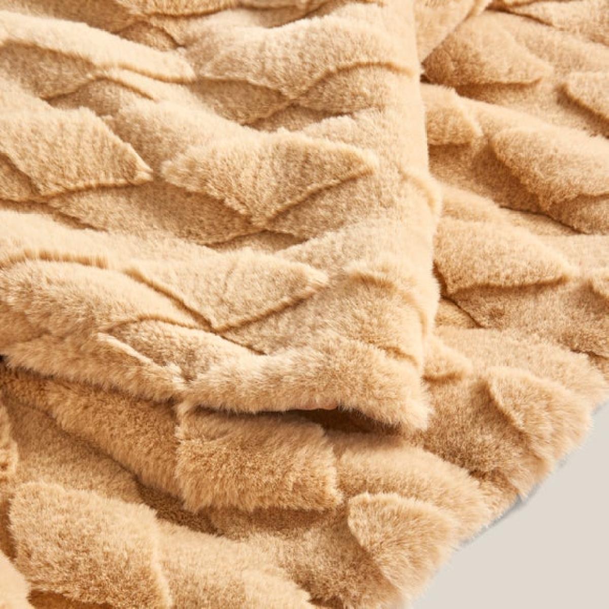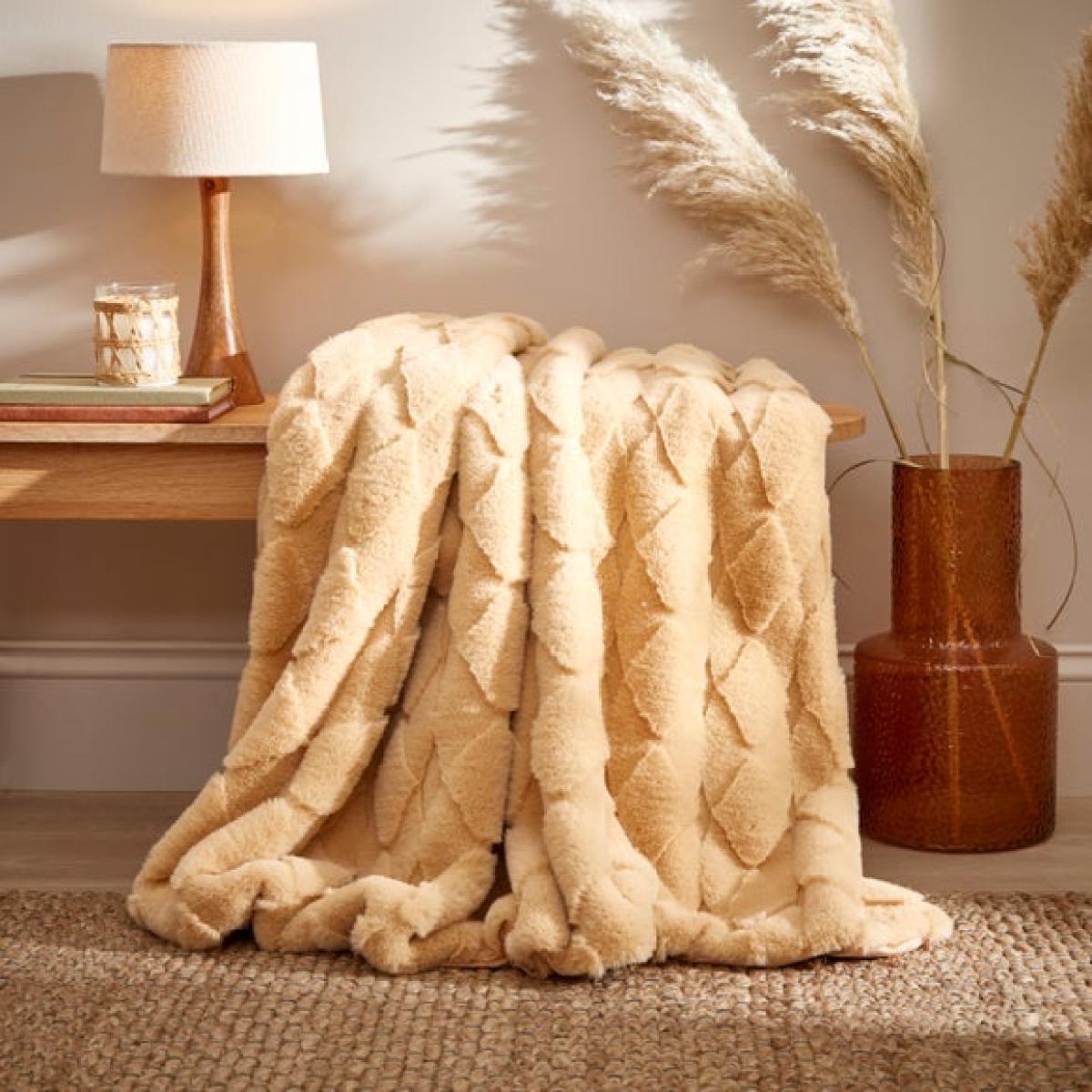 * Super soft faux fur * Textured diamond pattern * Warm sand colourway * Great accent for sofas or beds Wrap yourself in luxury with this beautifully textured Diamond Faux Fur Throw in a warm sand tone. The geometric faux fur design adds a stylish, tactile layer to your space, and is generously sized for lounging or draping over beds or sofas as an accent piece. Soft, breathable, and cosy enough for year-round use, it has reinforced edges for durability and is machine washable for easy upkeep.