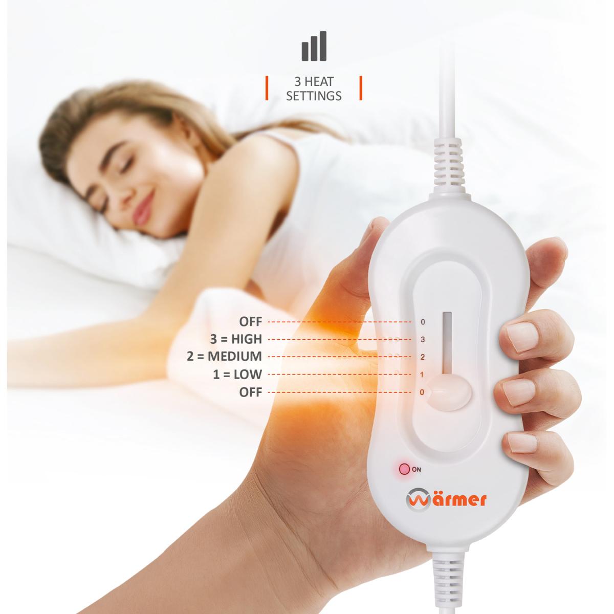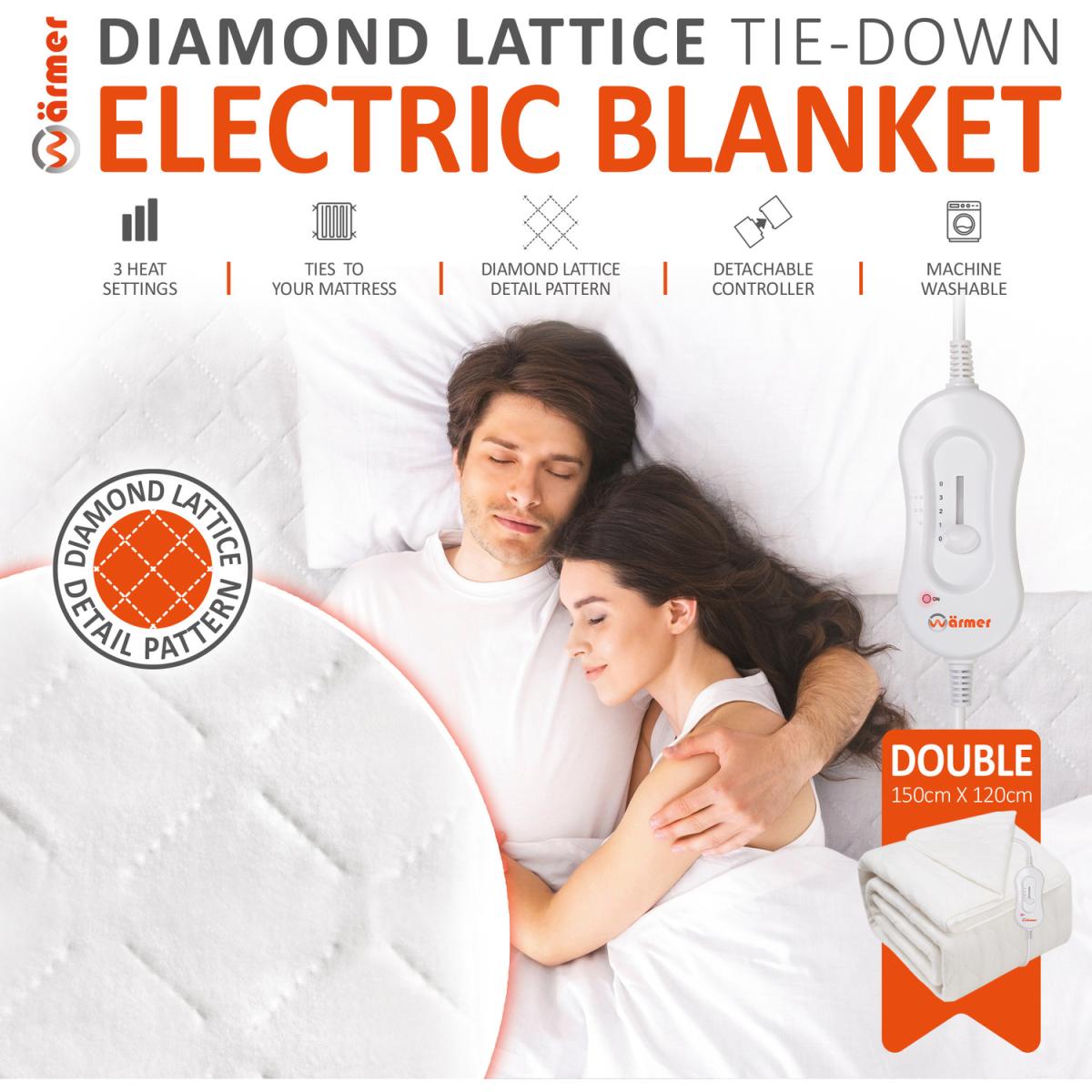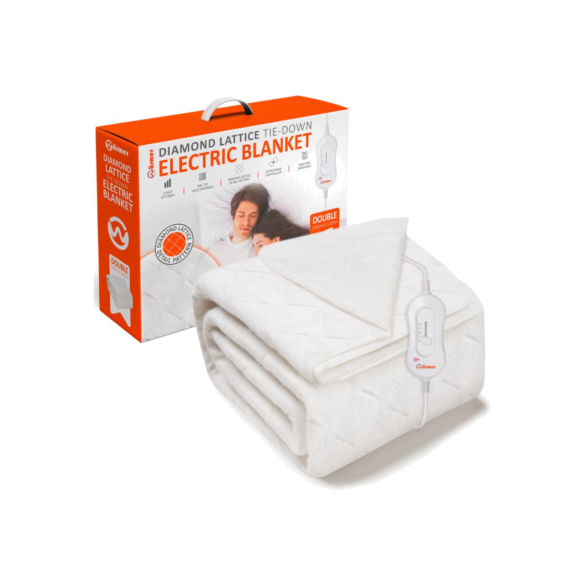 This WARMER Tie-Down Diamond Lattice Heated Blanket is the ideal way to stay cosy and warm when the evenings get chillier. With three different heat settings to choose from, this blanket is guaranteed to keep you feeling snug during the colder nights. This blanket runs off 60W of power meaning you could run it on the highest heat setting for 3 hours and it would cost you just 6p a day. This means you can stay warm and cosy this winter without having to worry about a huge increase in your energy bills. This blanket features three different heat settings that can be operated by the controller. The blanket also comes with a built-in overheat and overcurrent protection system that works from the first time the product is plugged in. This will automatically shut down the blanket if it overheats or receives too much power meaning you can relax whilst using this product. The controller is detachable and the blanket is made from 100% polyester which means it can be machine washed at low temperatures.