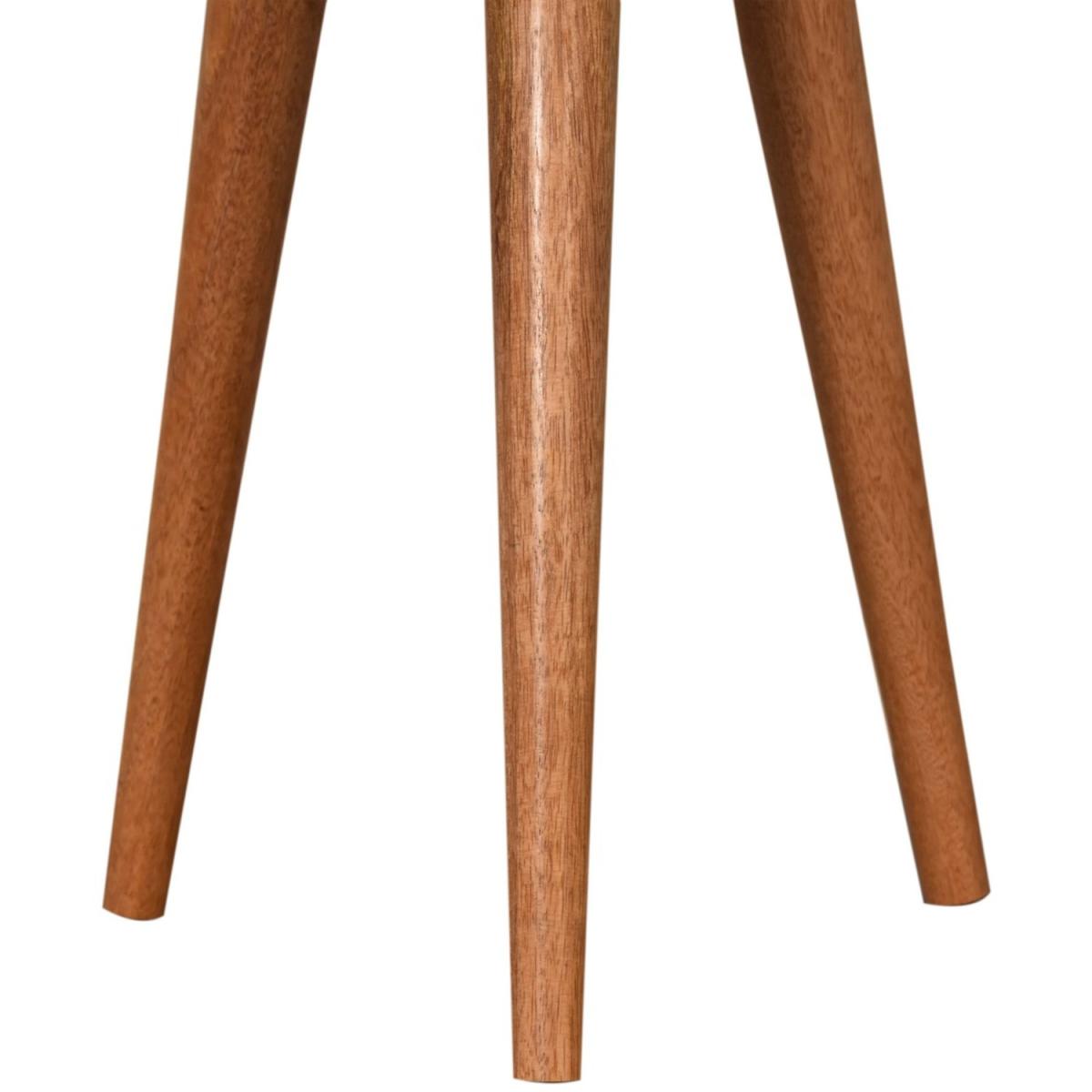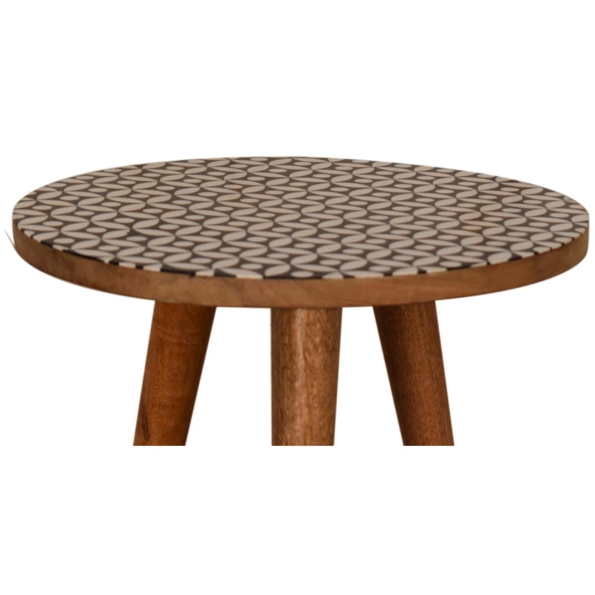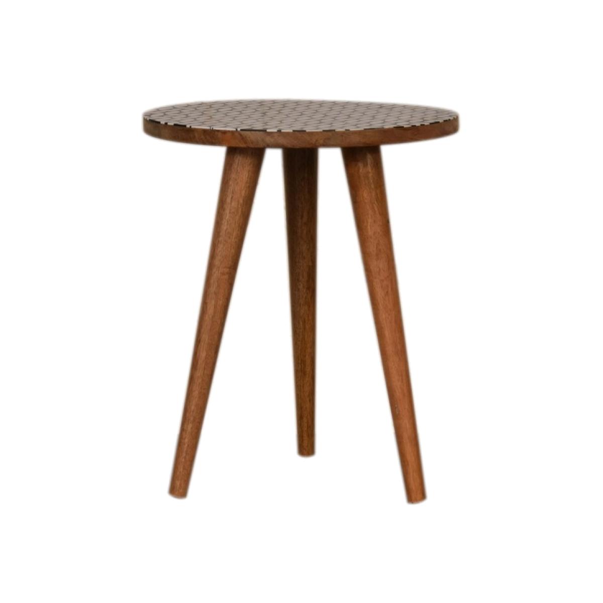 This end table is a versatile piece that can be used as a side table or a footstool. It has been constructed from 100% solid mango wood in an oak-ish finish and is handy as well as stylish. It is perfect to use in any room in the home and features Nordic-style legs and has a lovely patterned top.