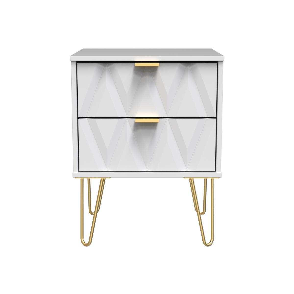 This 2 drawer bedside cabinet is practical and stylish. Perfect for any bedside or as a free standing storage unit. Say hello to contemporary cool with the Diamond range, with distinctive patterned drawers and a variety of colour options available to compliment any interior design. Gold metal handles and sturdy hairpin legs complete the storage solution. All our furniture is made in the United Kingdom, to the highest quality. It is delivered direct to your location of choice by one of our two man delivery teams, and come full assembled (although legs may be removed to prevent damage in transit).
