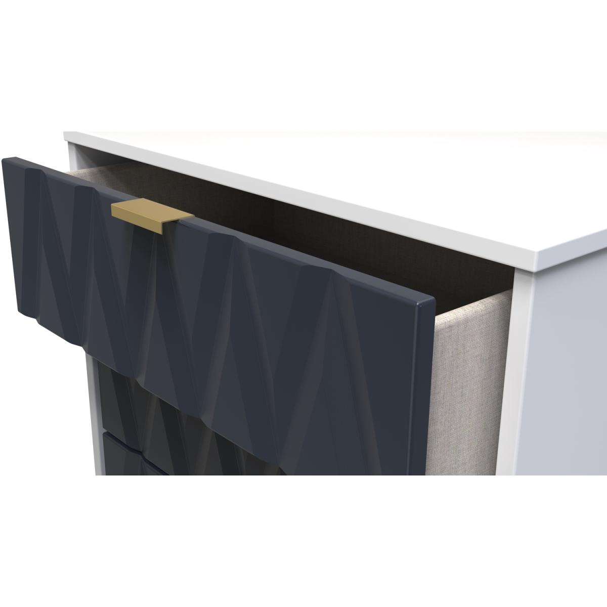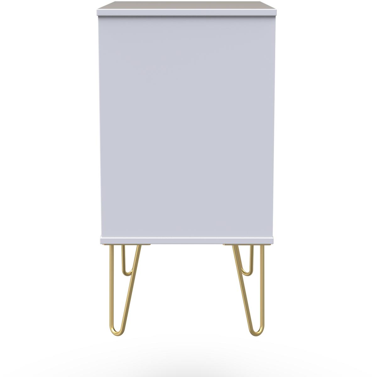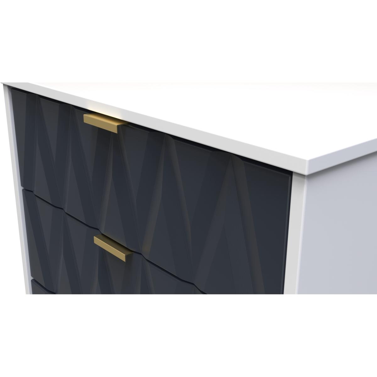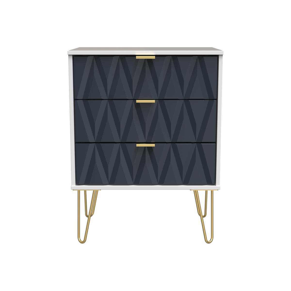 This 3 drawer bedside cabinet is wider than normal for added practicality. Perfect for any bedside or as a free standing storage unit. Say hello to contemporary cool with the Diamond range, with distinctive patterned drawers and a variety of colour options available to compliment any interior design. Gold metal handles and sturdy hairpin legs complete the storage solution. All our furniture is made in the United Kingdom, to the highest quality. It is delivered direct to your location of choice by one of our two man delivery teams, and come full assembled (although legs may be removed to prevent damage in transit).