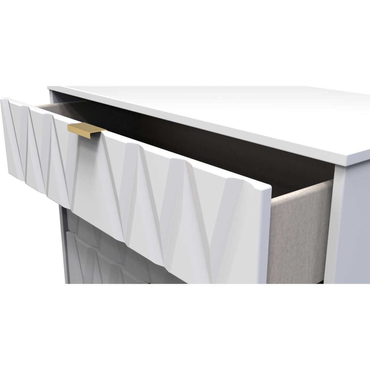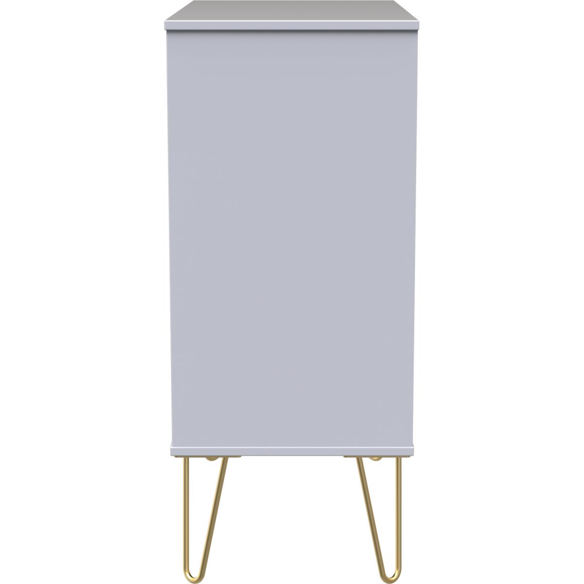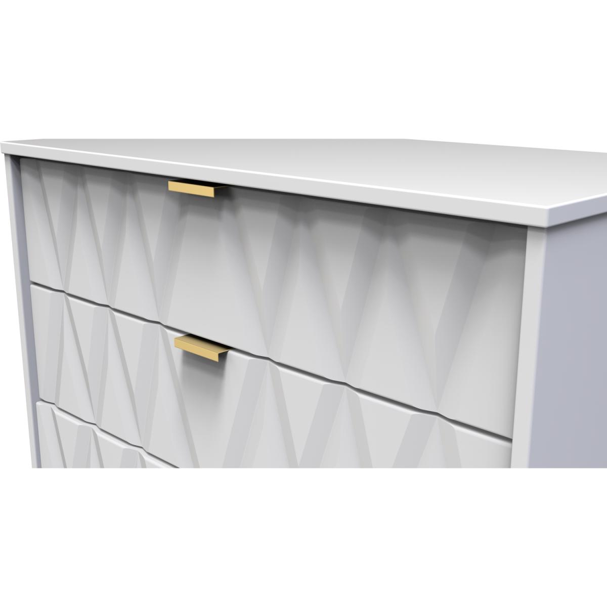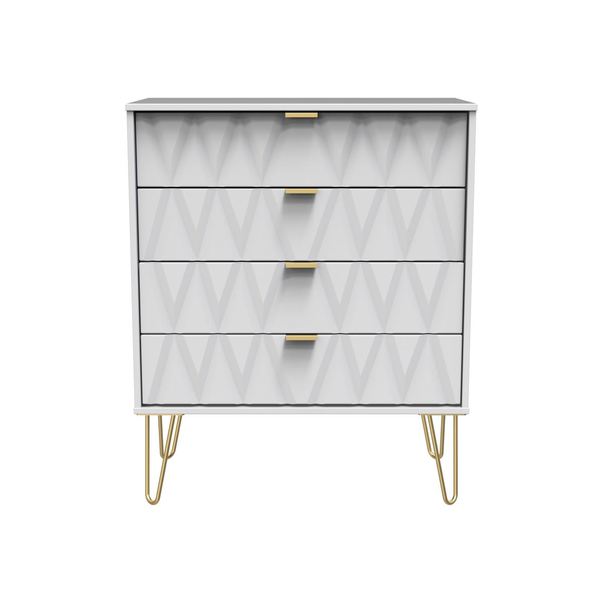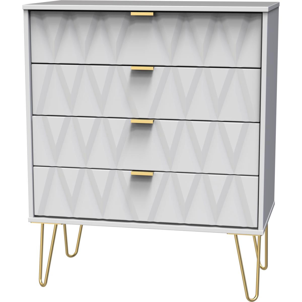 This wide 4 drawer chest of drawers is practical and stylish. Perfect for any home as a free standing storage unit. Say hello to contemporary cool with the Diamond range, with distinctive patterned drawers and a variety of colour options available to compliment any interior design. Gold metal handles and sturdy hairpin legs complete the storage solution. All our furniture is made in the United Kingdom, to the highest quality. It is delivered direct to your location of choice by one of our two man delivery teams, and come full assembled (although legs may be removed to prevent damage in transit).