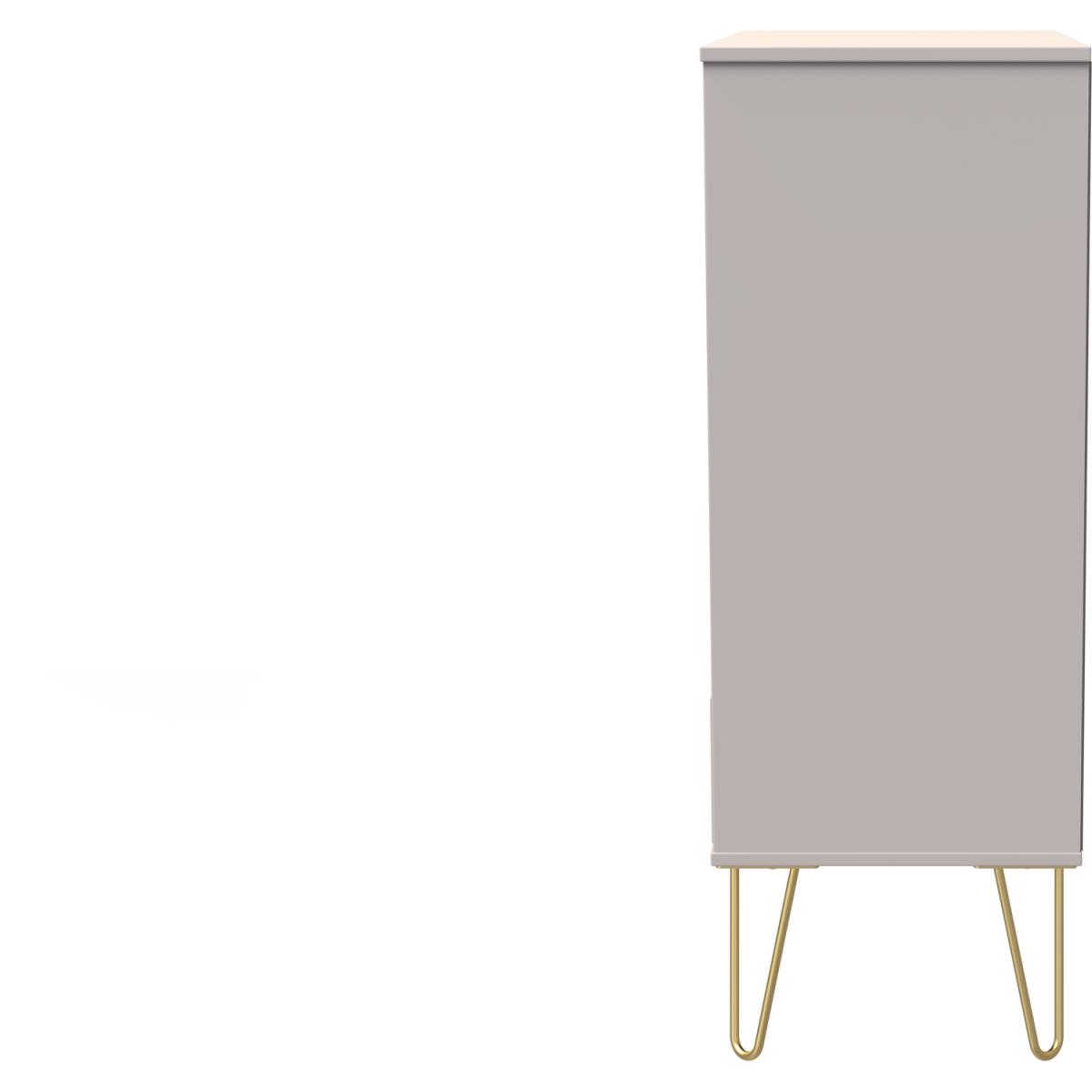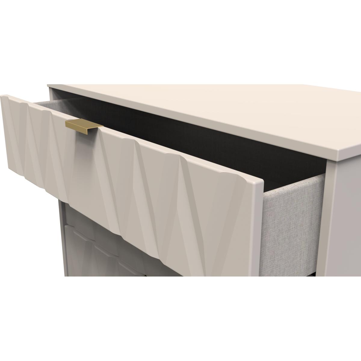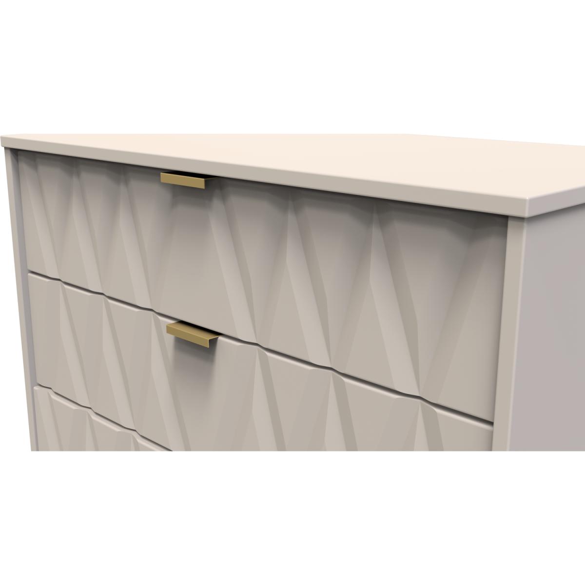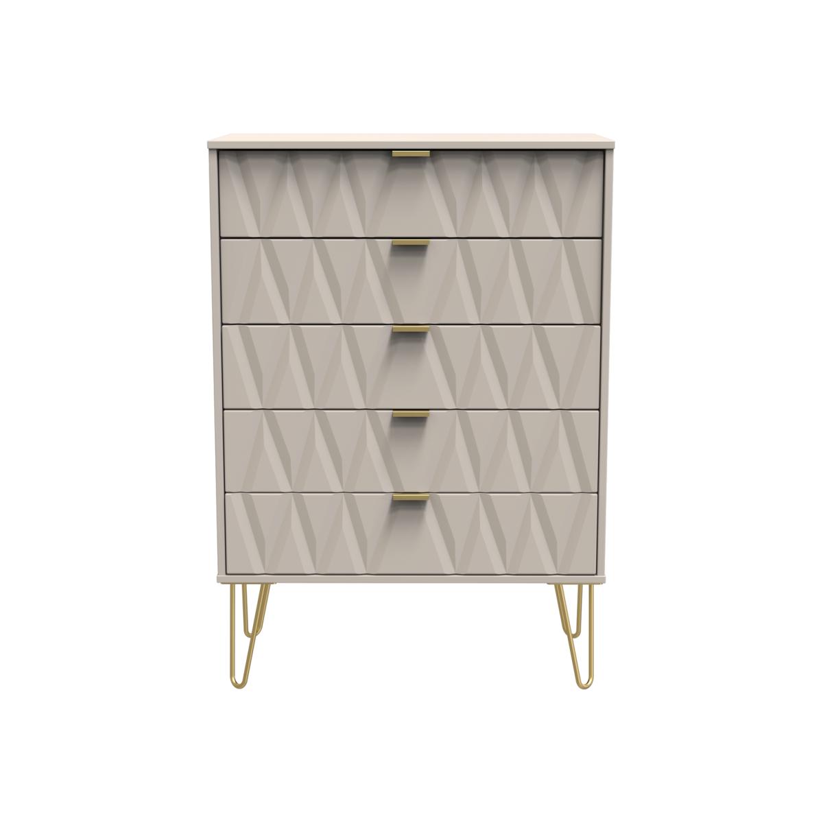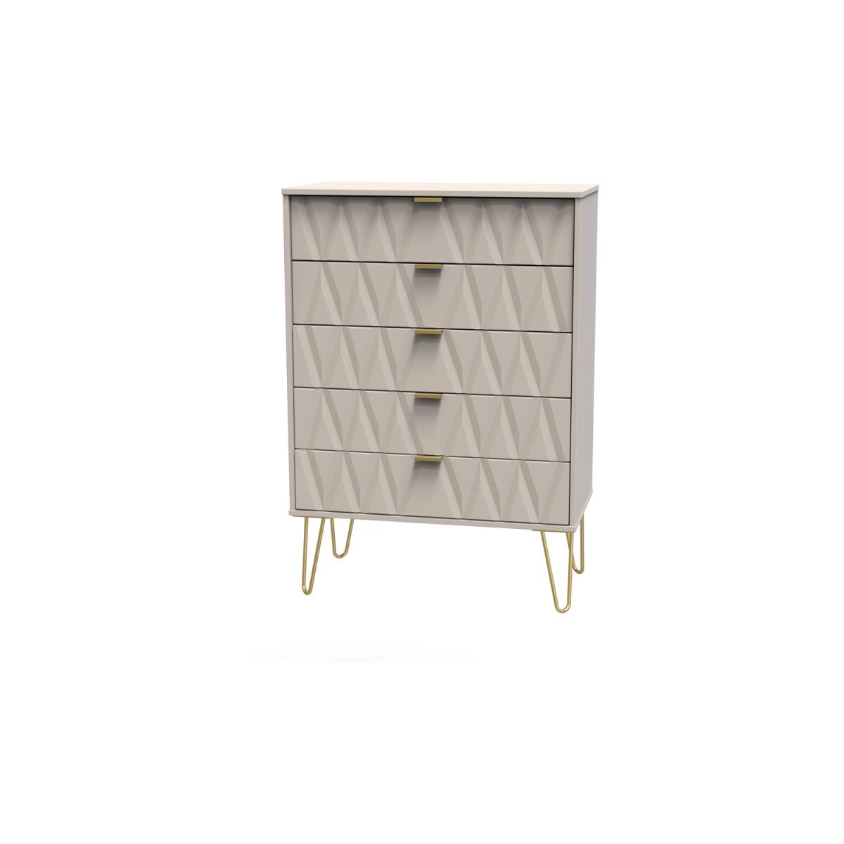 This wide 5 drawer chest of drawers is practical and stylish. Perfect for any home as a free standing storage unit. Say hello to contemporary cool with the Diamond range, with distinctive patterned drawers and a variety of colour options available to compliment any interior design. Gold metal handles and sturdy hairpin legs complete the storage solution. All our furniture is made in the United Kingdom, to the highest quality. It is delivered direct to your location of choice by one of our two man delivery teams, and come full assembled (although legs may be removed to prevent damage in transit).
